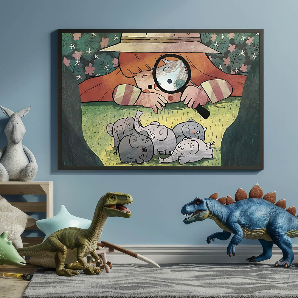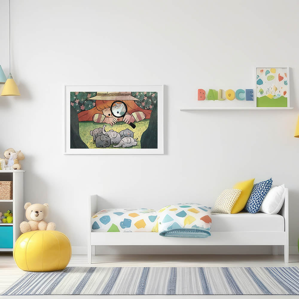 Bring an adventurous and fun vibe to your child's room with this charming boys room wall art featuring a curious girl exploring a group of adorable elephants. With its bright colors and playful theme, this artwork will ignite your child’s imagination, making it the perfect addition to any nursery, bedroom, or playroom.