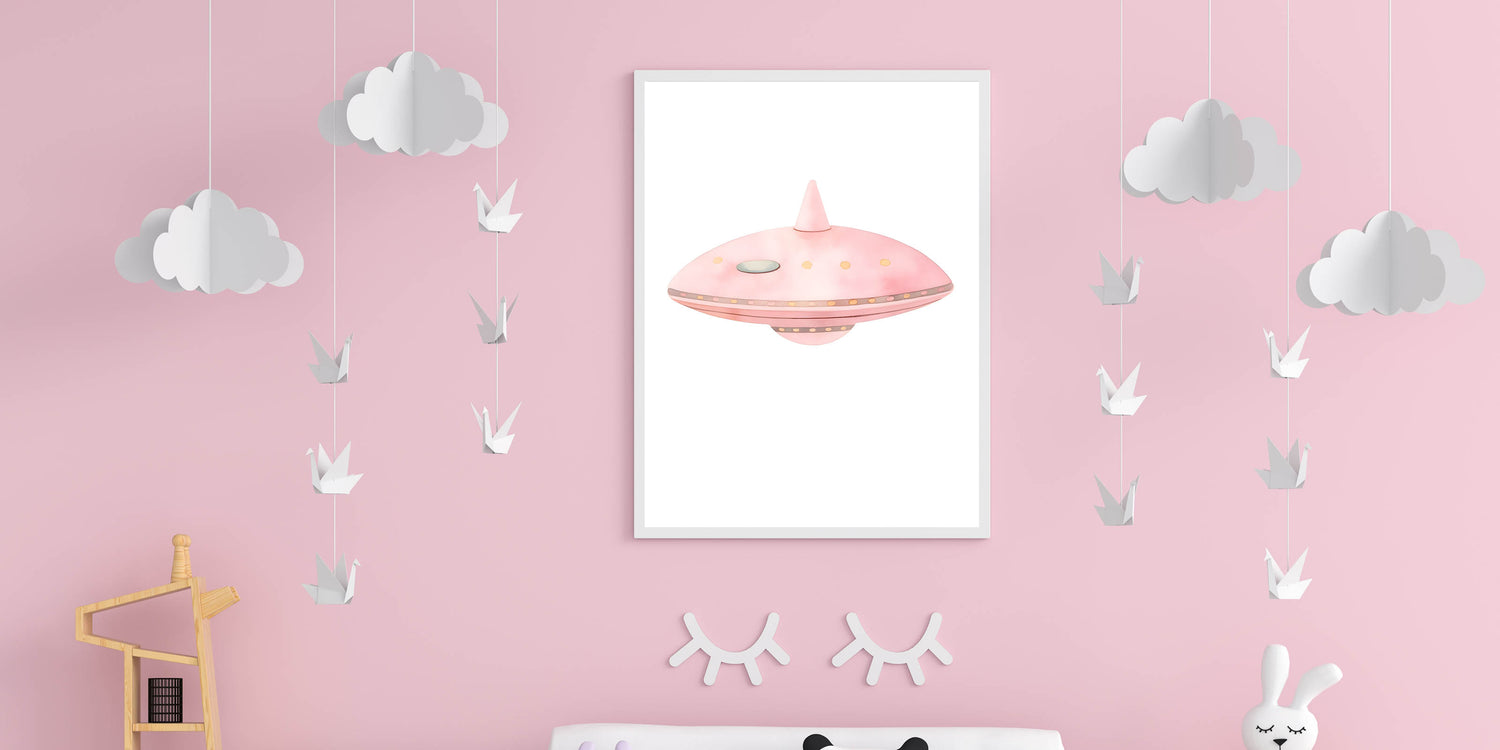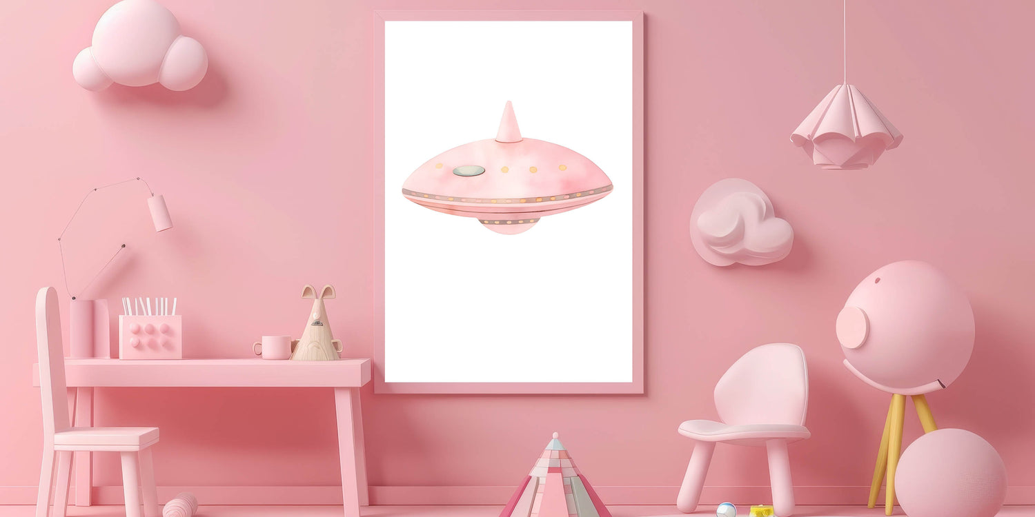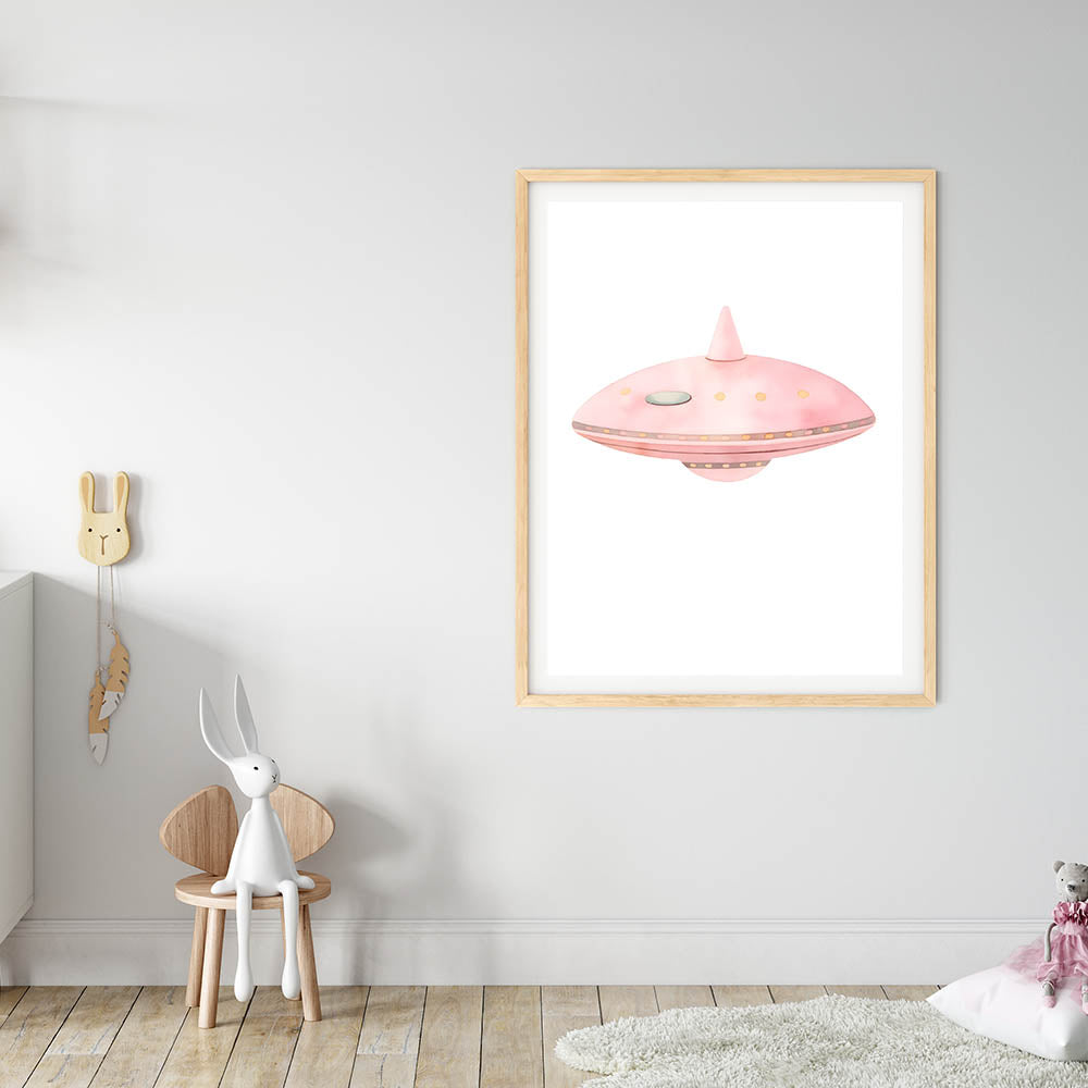 Playroom Wall Art - Cute Pink Spaceship Kids Room Decor