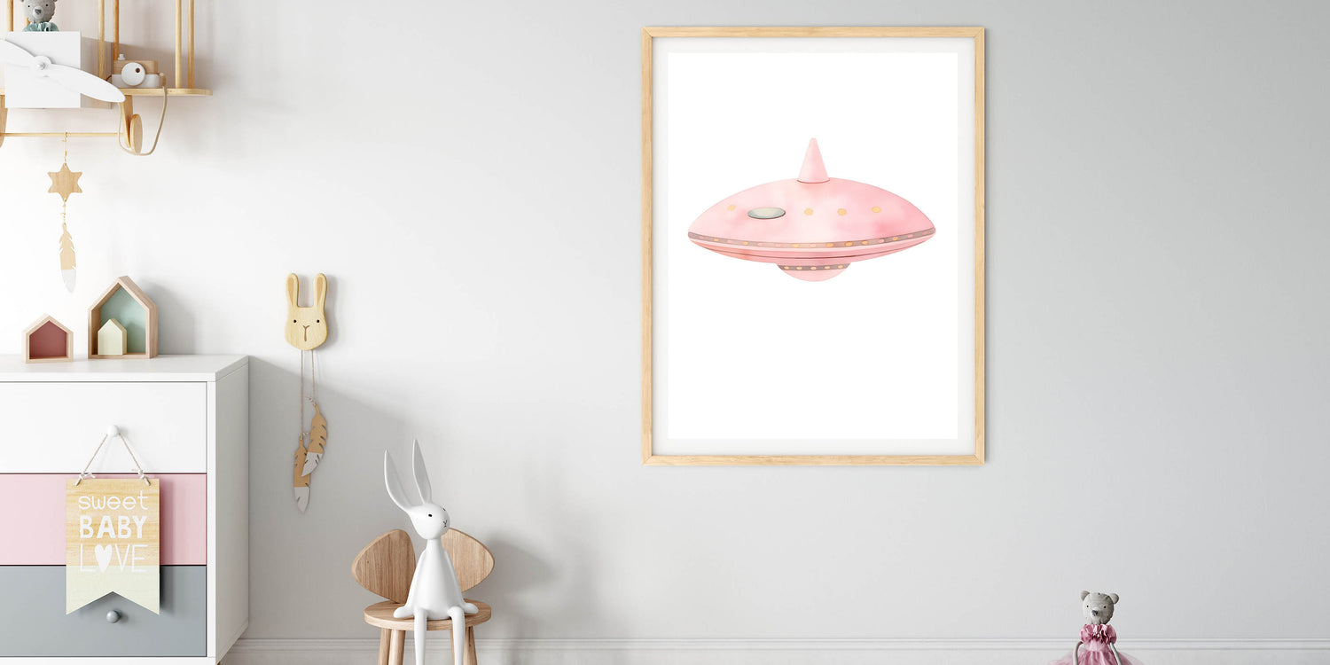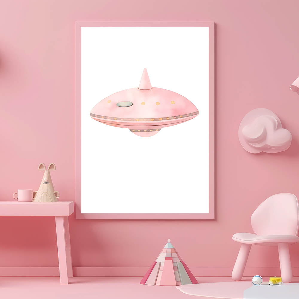 Take your little one on a galactic adventure with this adorable pink UFO playroom wall art. Featuring a soft watercolor spaceship with glowing details, this whimsical print is perfect for space-loving kids, adding a fun and futuristic touch to their bedroom, nursery, or playroom.