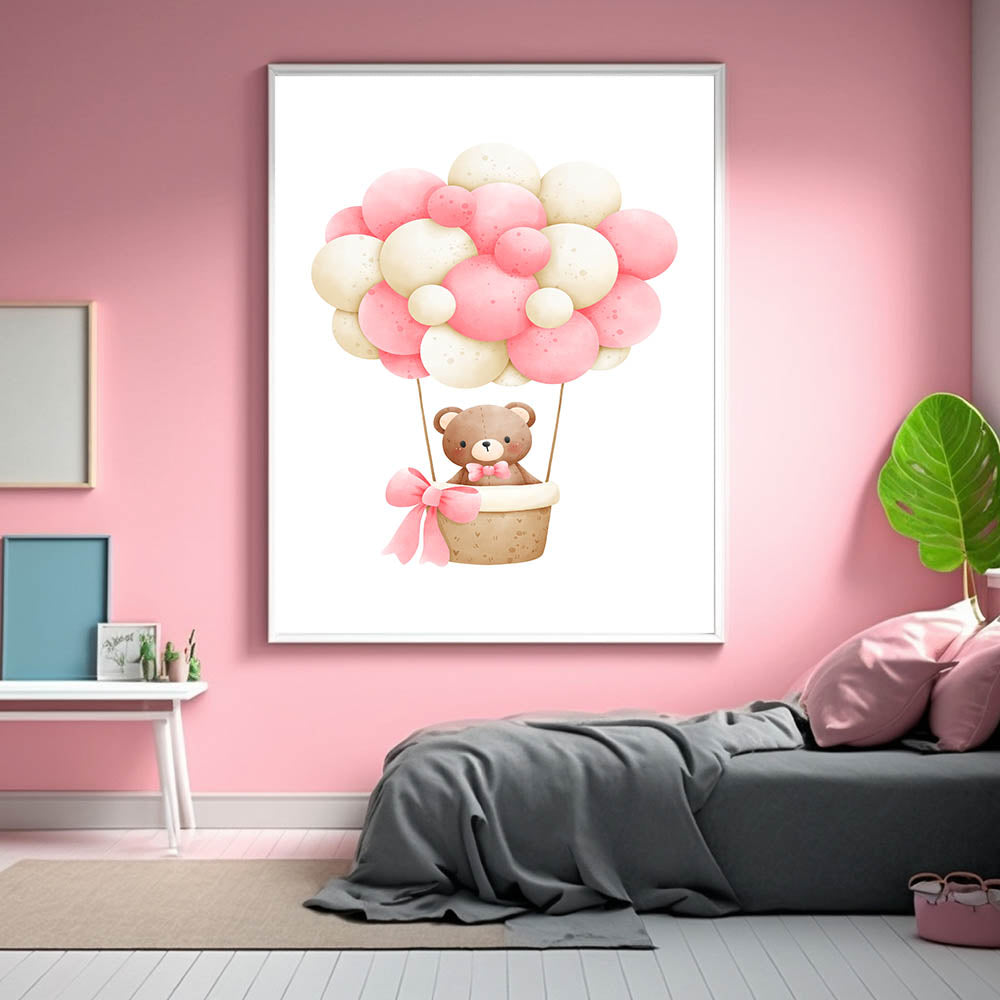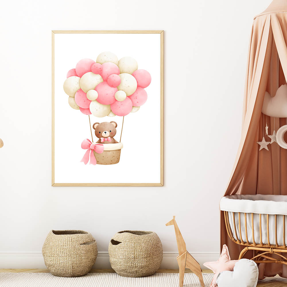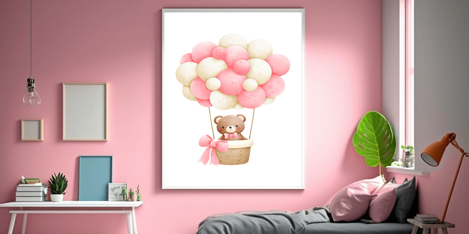 Take your little one on a magical journey with this adorable teddy bear hot air balloon playroom wall art. Featuring a soft watercolor teddy floating in a basket with pink and beige balloons, this charming artwork creates a dreamy and whimsical atmosphere, perfect for nurseries, bedrooms, and playrooms.