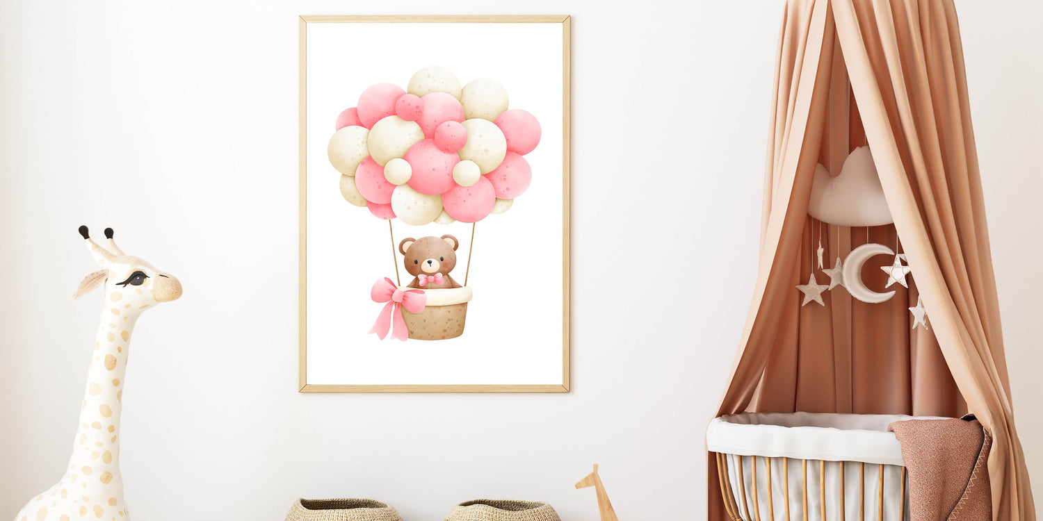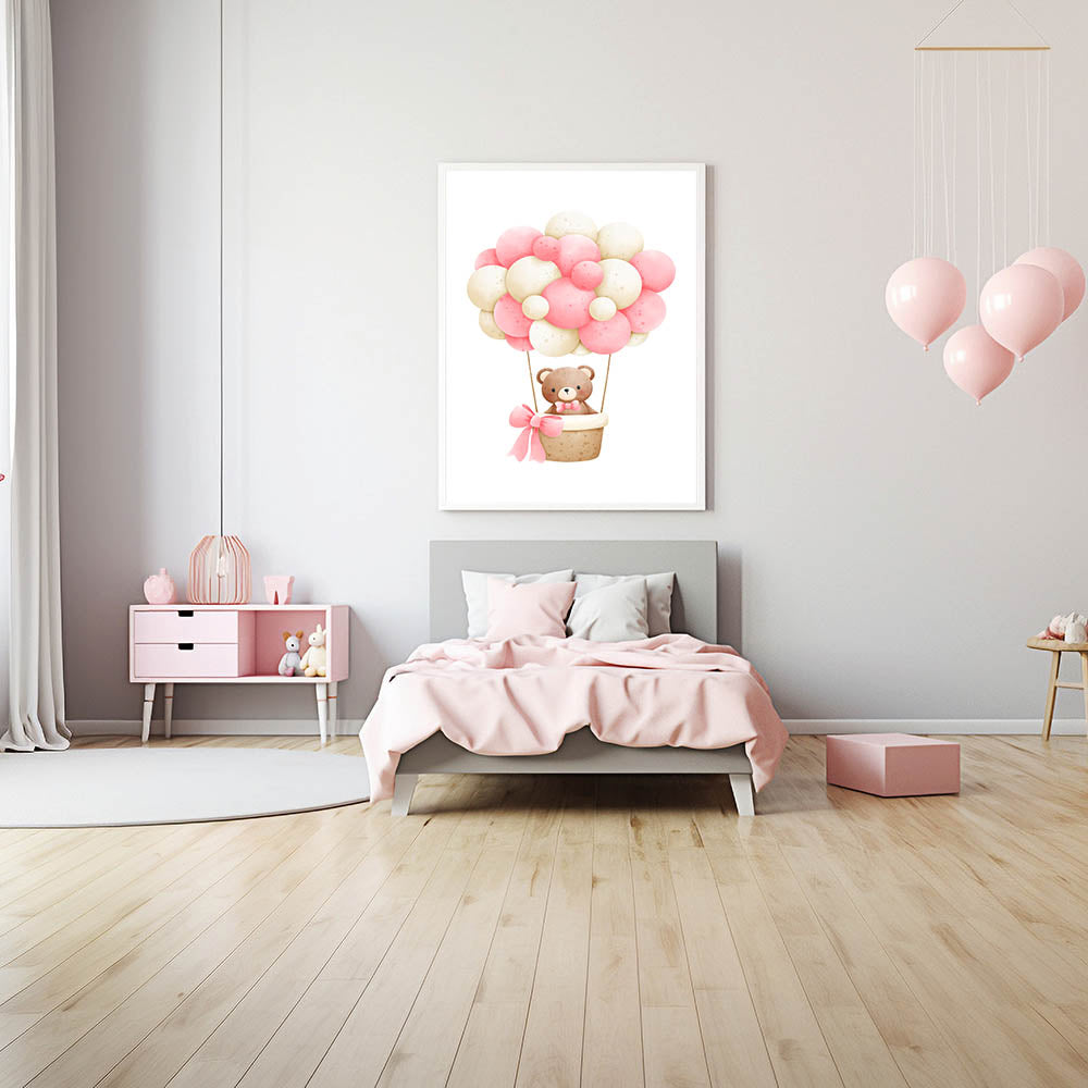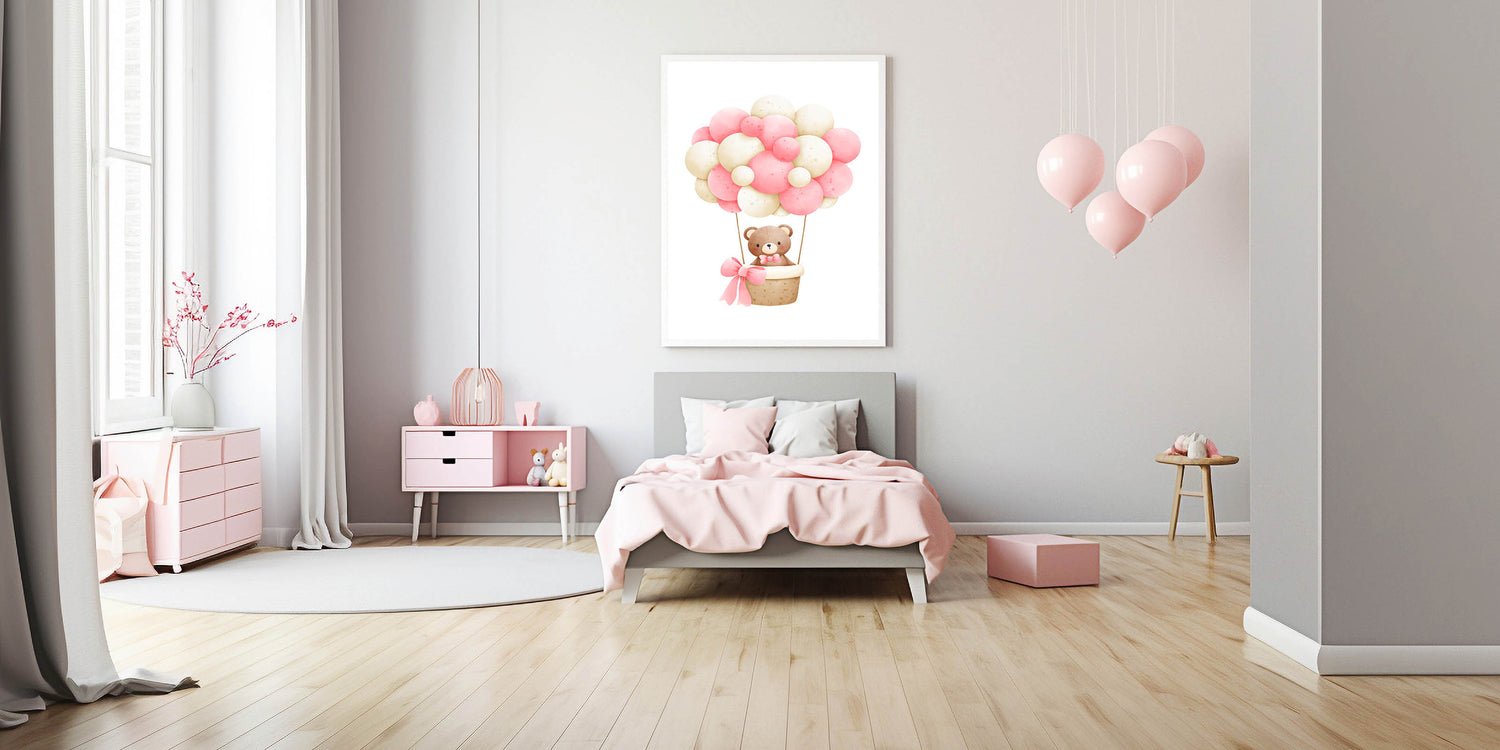 Take your little one on a magical journey with this adorable teddy bear hot air balloon playroom wall art. Featuring a soft watercolor teddy floating in a basket with pink and beige balloons, this charming artwork creates a dreamy and whimsical atmosphere, perfect for nurseries, bedrooms, and playrooms.