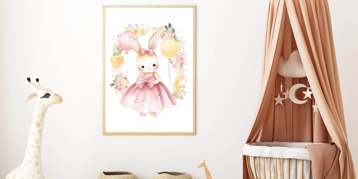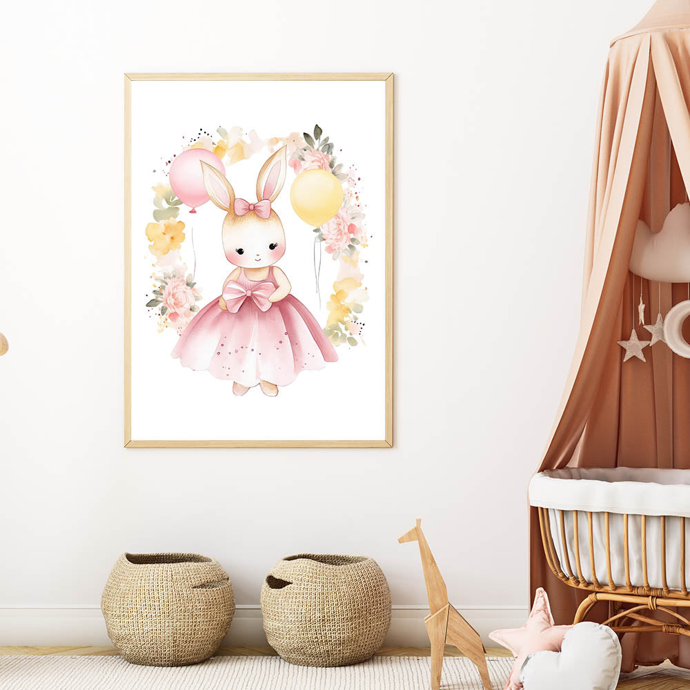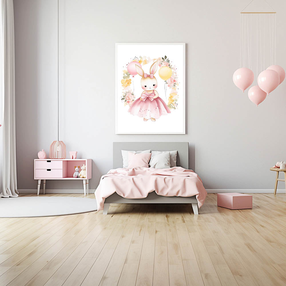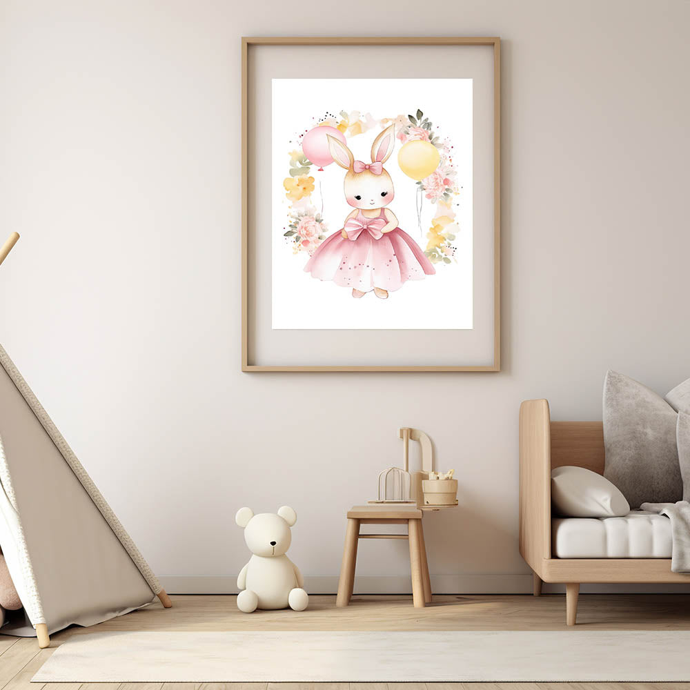 Create a dreamy and enchanting space for your little one with this princess bunny wall art. Featuring a beautifully illustrated bunny in a flowing pink gown, framed by soft floral accents and pastel balloons, this artwork is perfect for nurseries, girls' bedrooms, and playrooms. The delicate watercolor tones and clean white background make it a timeless piece that adds warmth, elegance, and a fairy-tale charm.