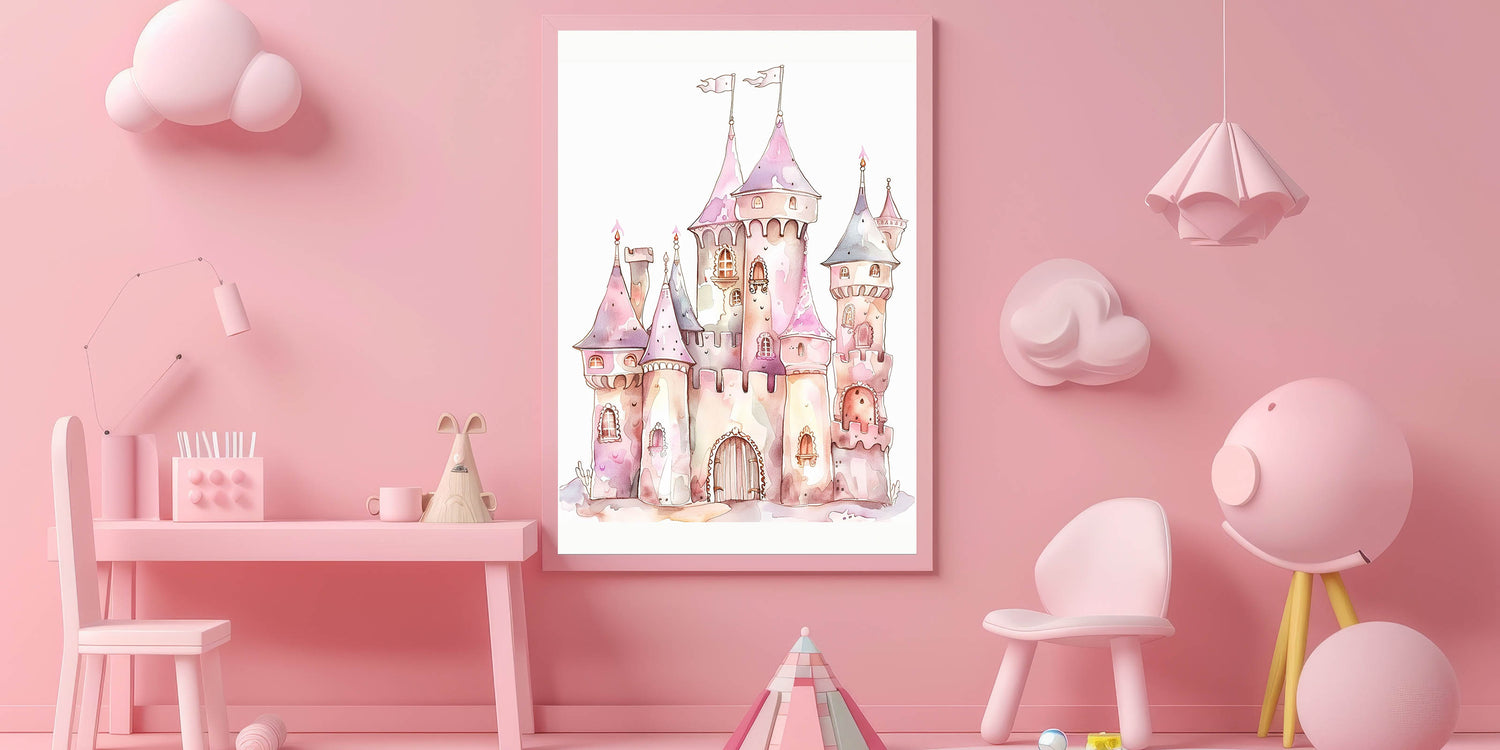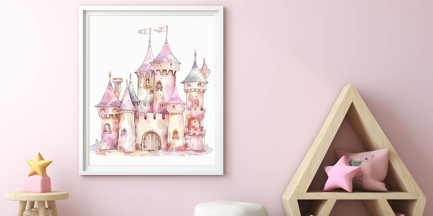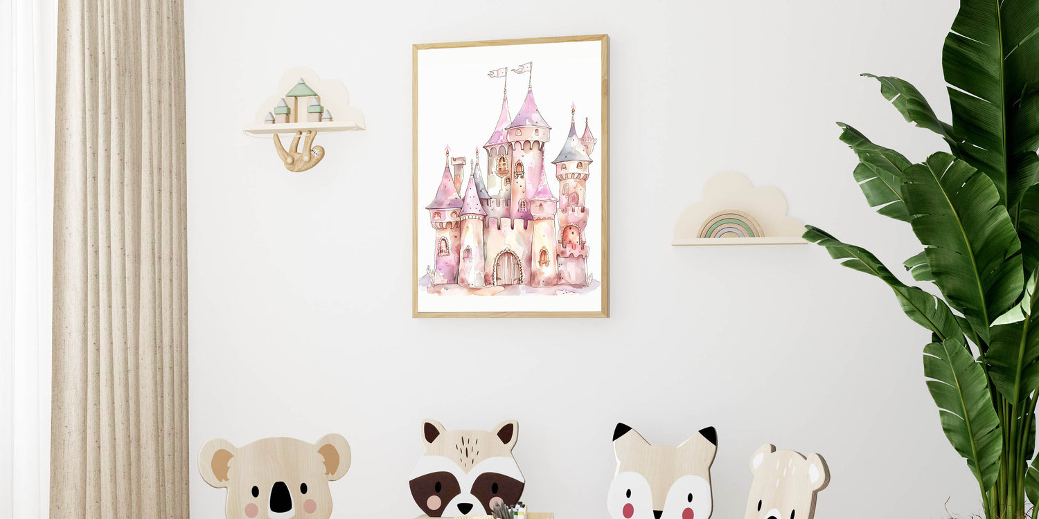 This playroom wall art blends soft watercolor artistry with magical castle details, making it the perfect addition to a princess-themed space.