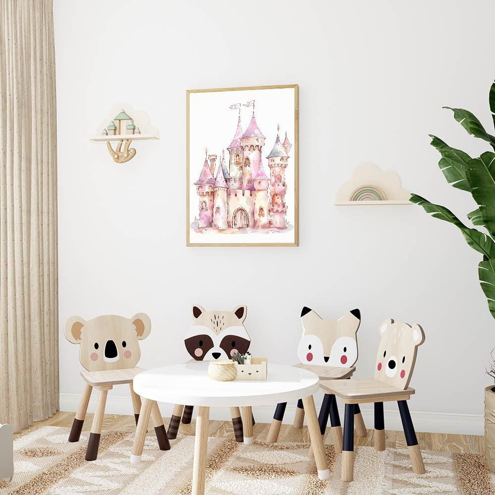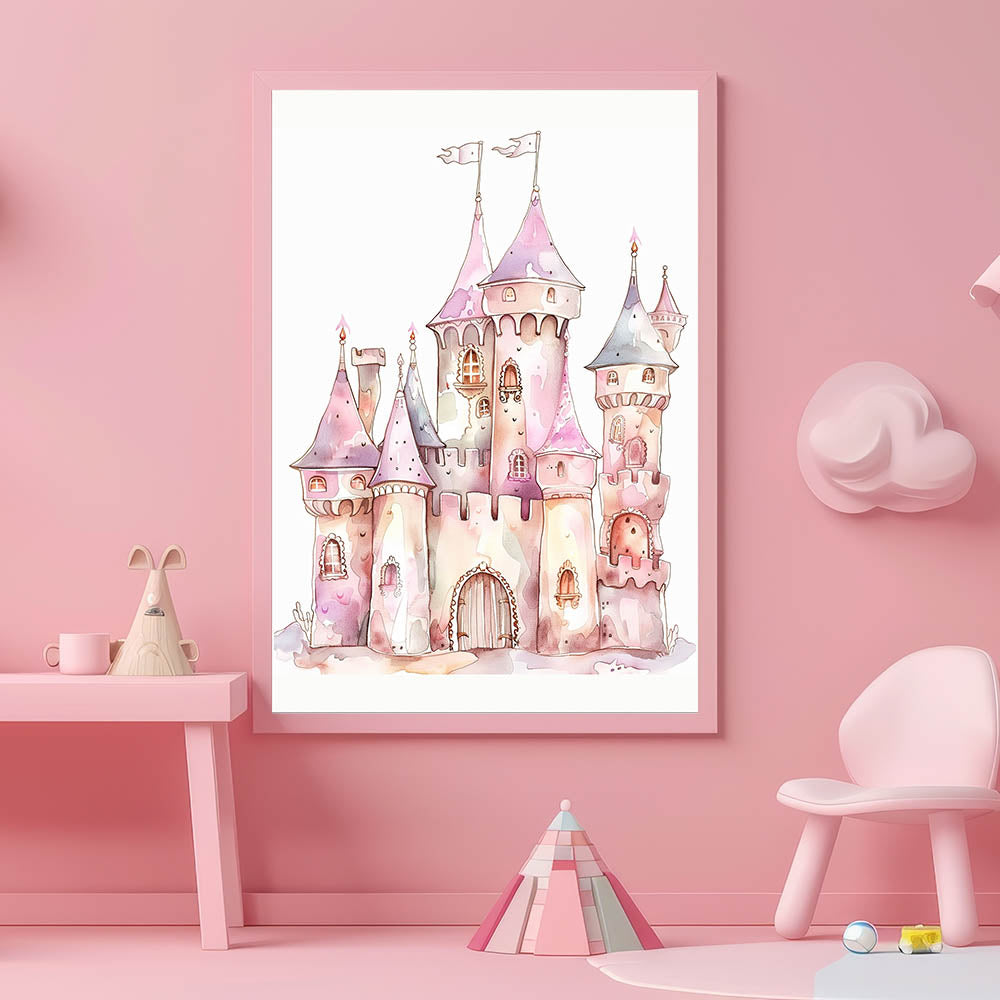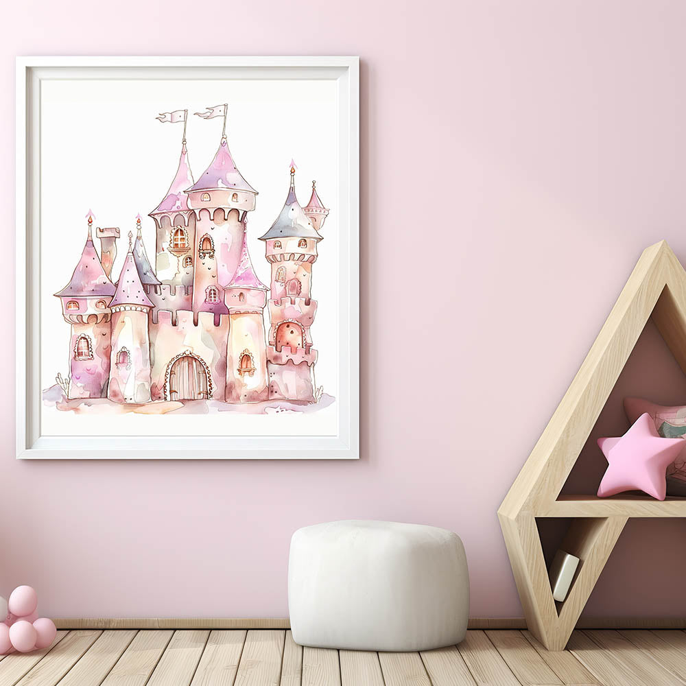 This playroom wall art blends soft watercolor artistry with magical castle details, making it the perfect addition to a princess-themed space.