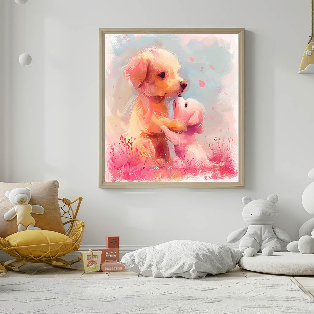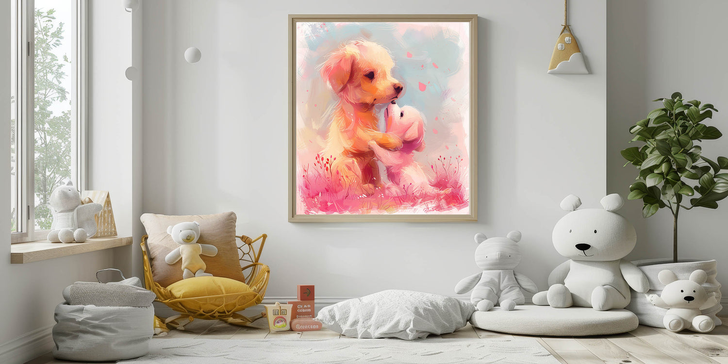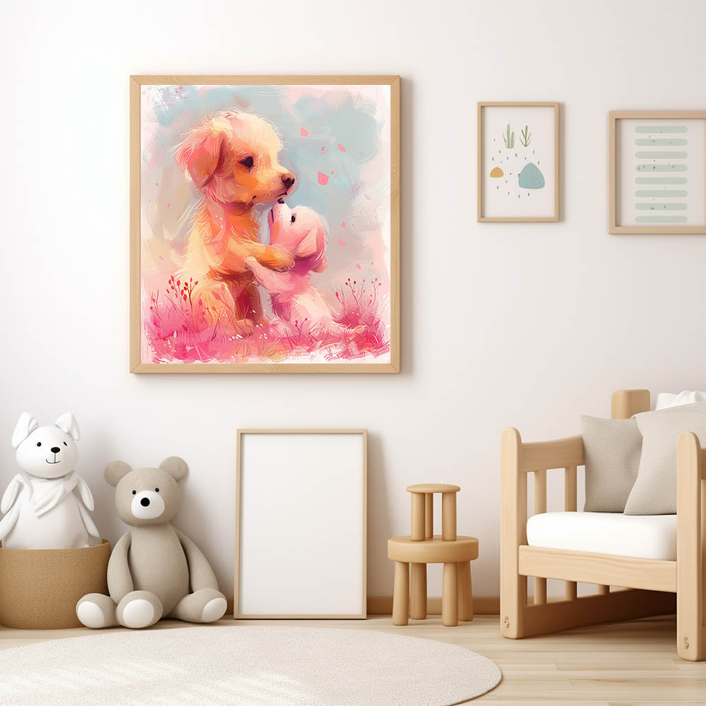 This "Puppy Love" artwork captures the innocence of childhood and the unconditional love of animals. Whether paired with other animal-themed decor or displayed as a standalone centerpiece, it brings smiles and comfort to any room. Order today to create a delightful and heartwarming retreat for your little one!