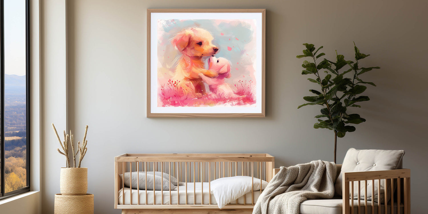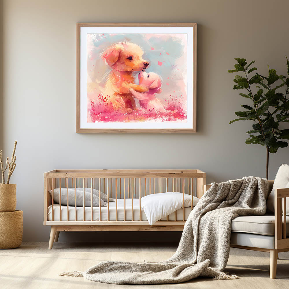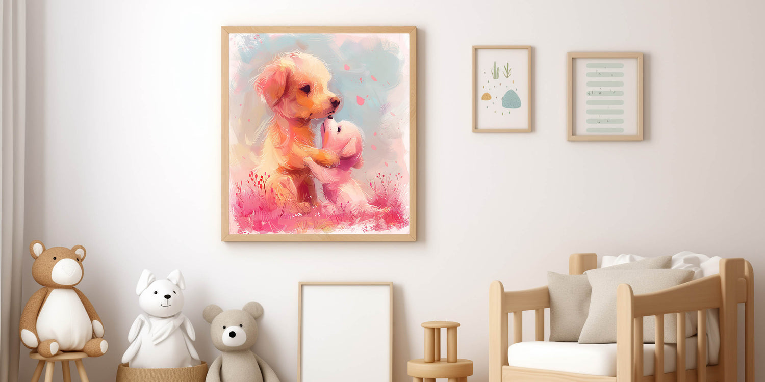 This "Puppy Love" artwork captures the innocence of childhood and the unconditional love of animals. Whether paired with other animal-themed decor or displayed as a standalone centerpiece, it brings smiles and comfort to any room. Order today to create a delightful and heartwarming retreat for your little one!