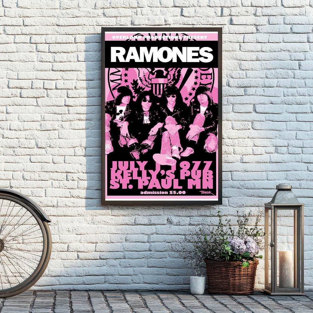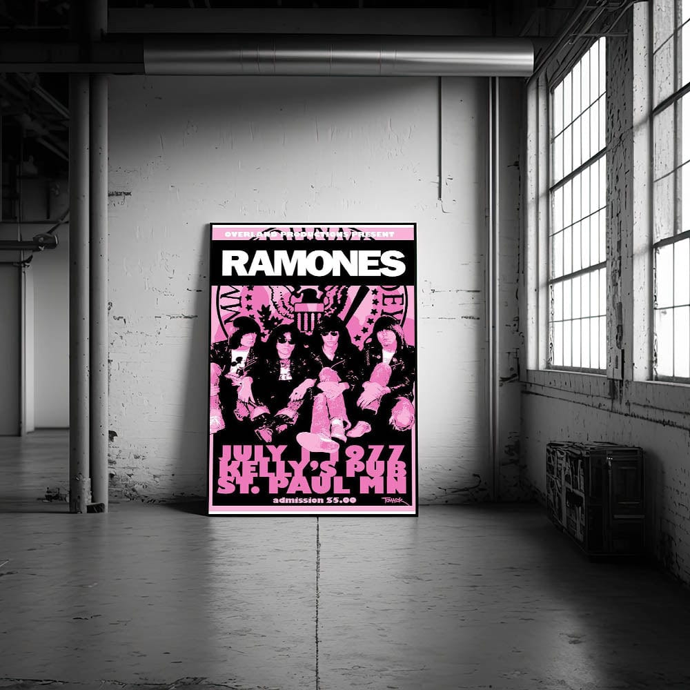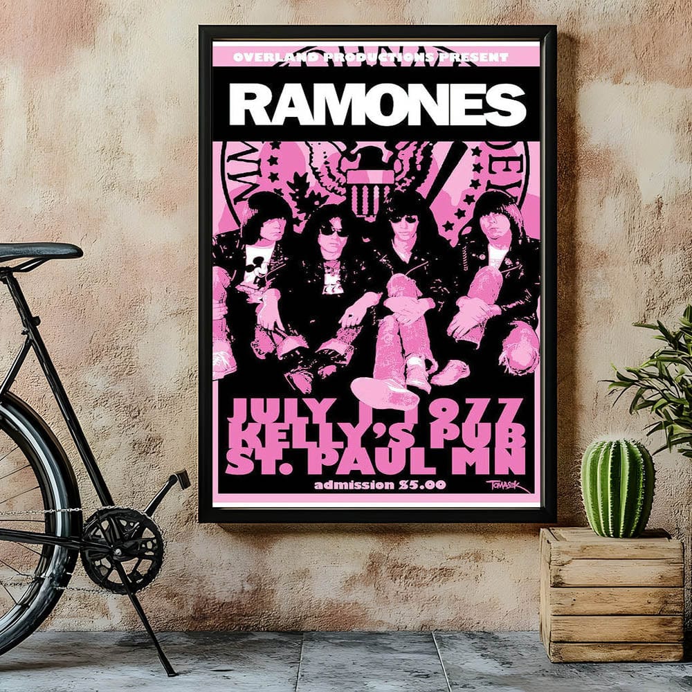 This bold Ramones retro poster features an eye-catching pink design, promoting their 1977 concert at Kelly's Pub in St. Paul, MN. The poster showcases the band members in their classic punk rock attire, with the iconic Ramones logo in the background. The vibrant colors and vintage typography capture the raw, rebellious energy of the band's early days, making it a must-have for fans of punk rock history and Ramones memorabilia.
