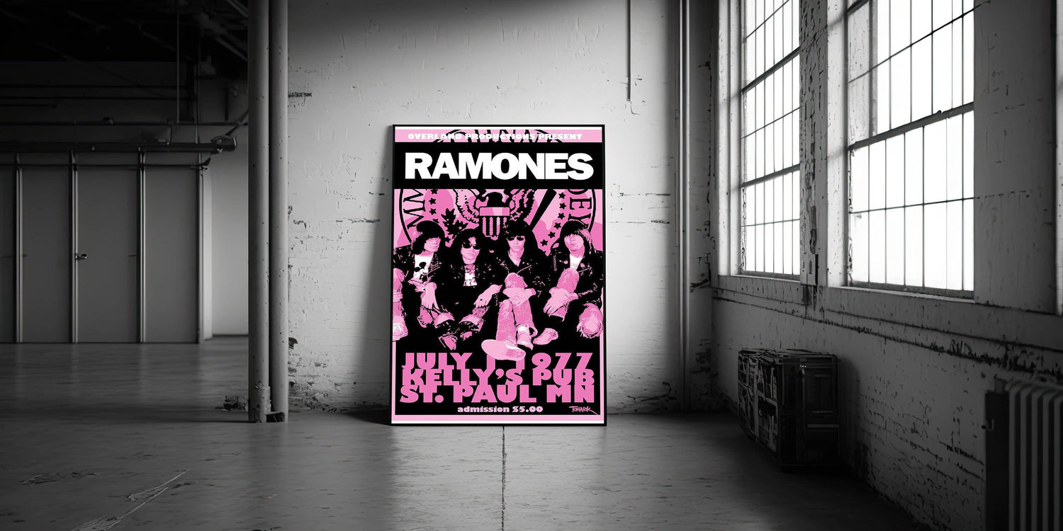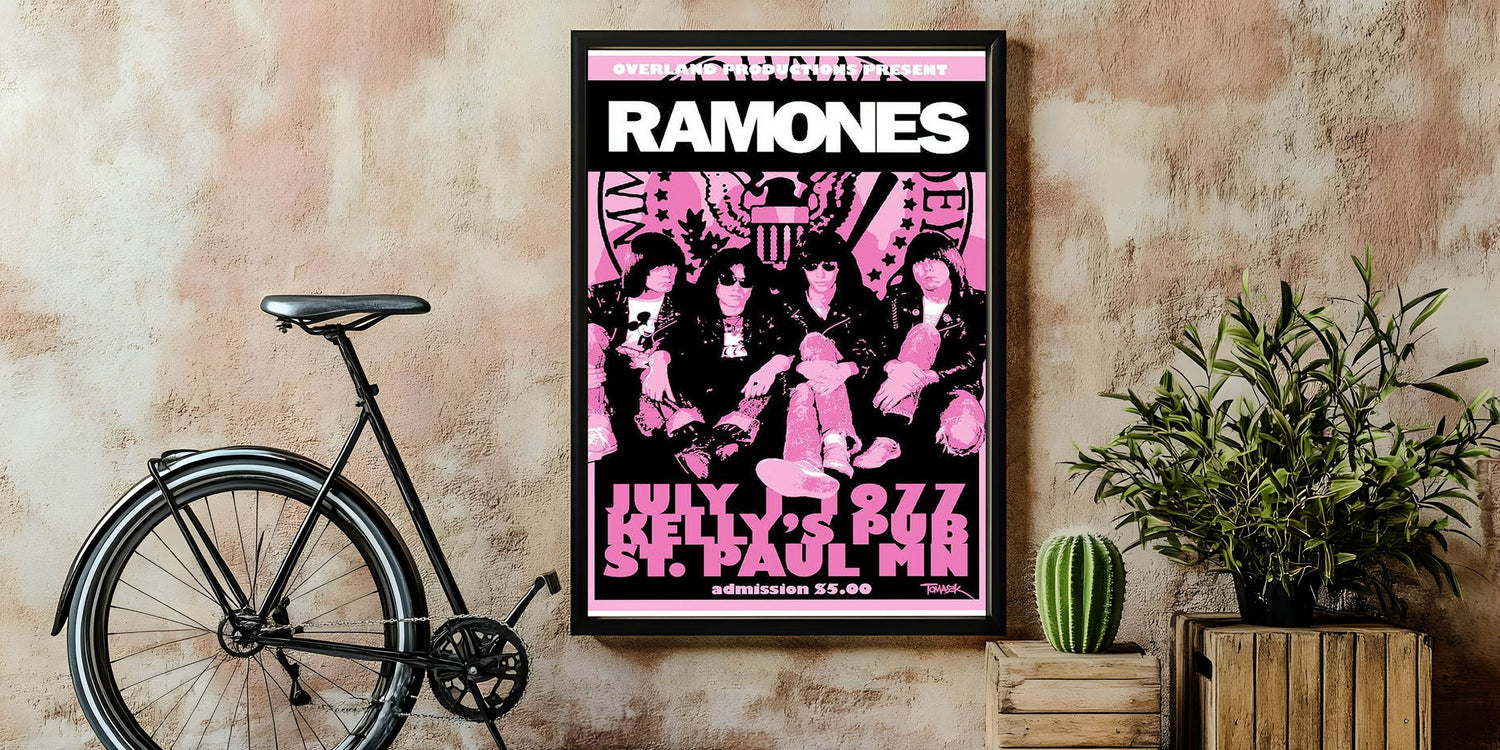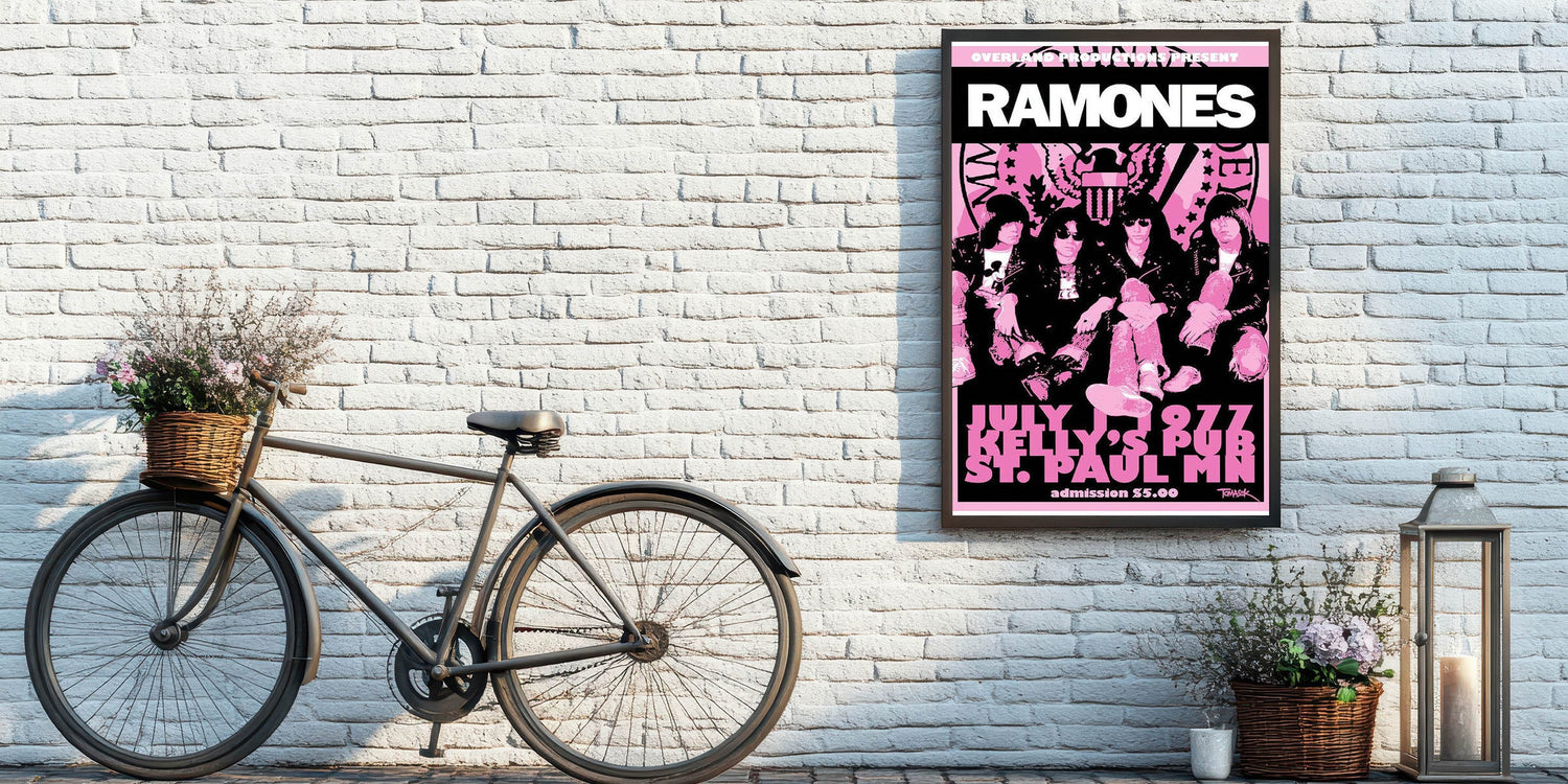 This bold Ramones retro poster features an eye-catching pink design, promoting their 1977 concert at Kelly's Pub in St. Paul, MN. The poster showcases the band members in their classic punk rock attire, with the iconic Ramones logo in the background. The vibrant colors and vintage typography capture the raw, rebellious energy of the band's early days, making it a must-have for fans of punk rock history and Ramones memorabilia.