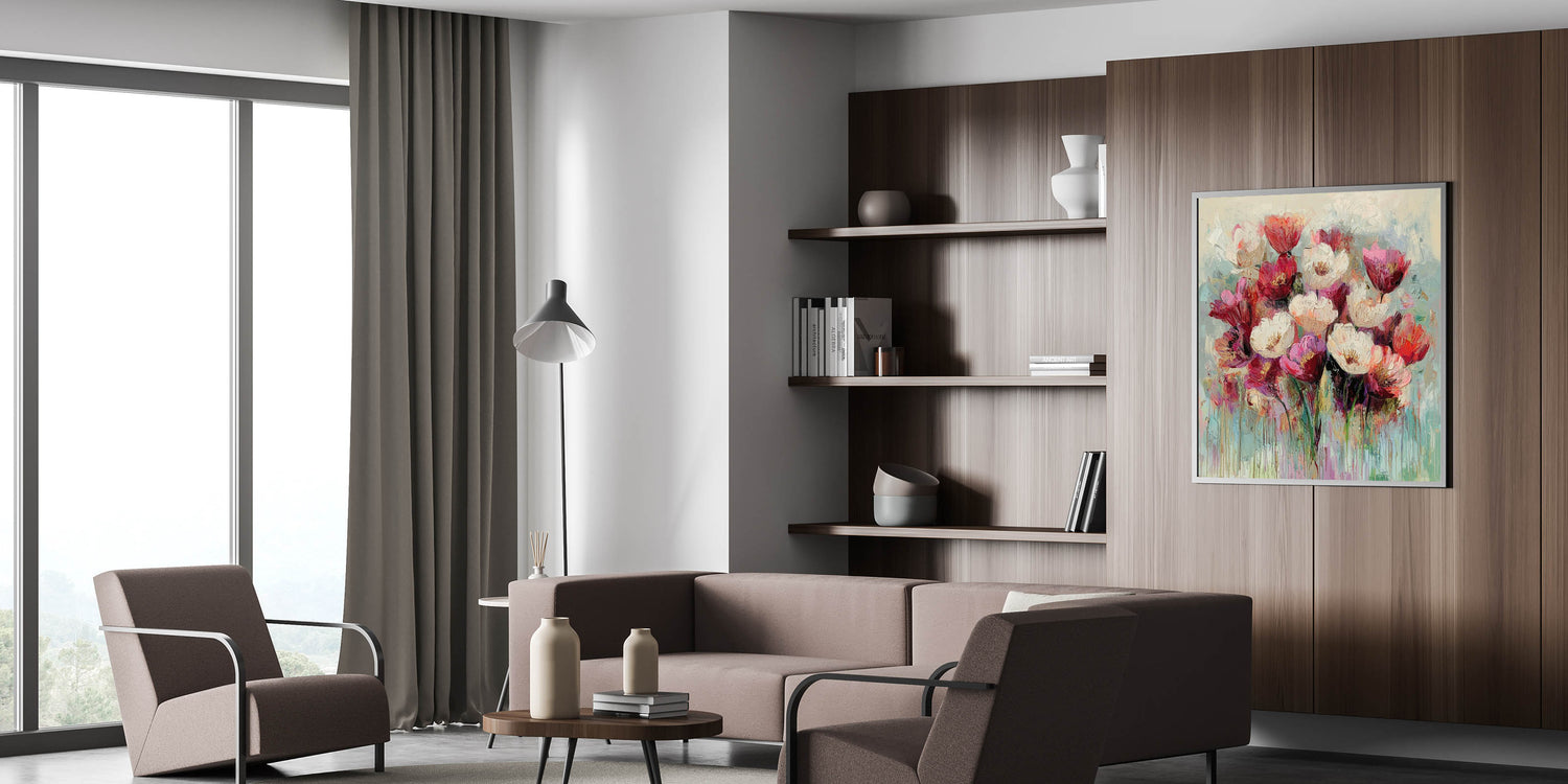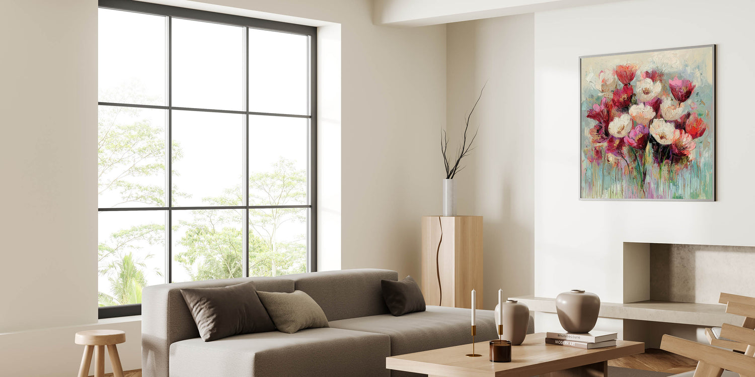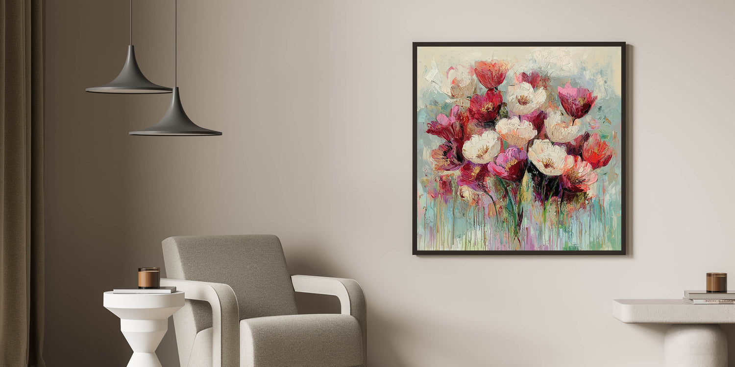 Infuse your space with the charm of nature through this living room wall art, featuring a stunning floral arrangement in soft white, pink, and deep red hues. The textured brushstrokes and expressive details bring movement and vibrancy, making this modern wall art a captivating centerpiece for any contemporary interior.