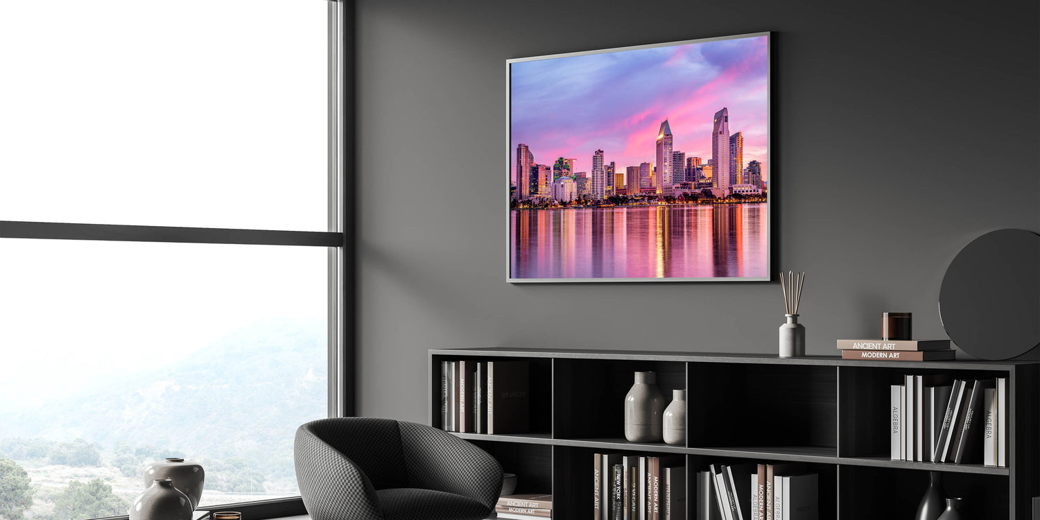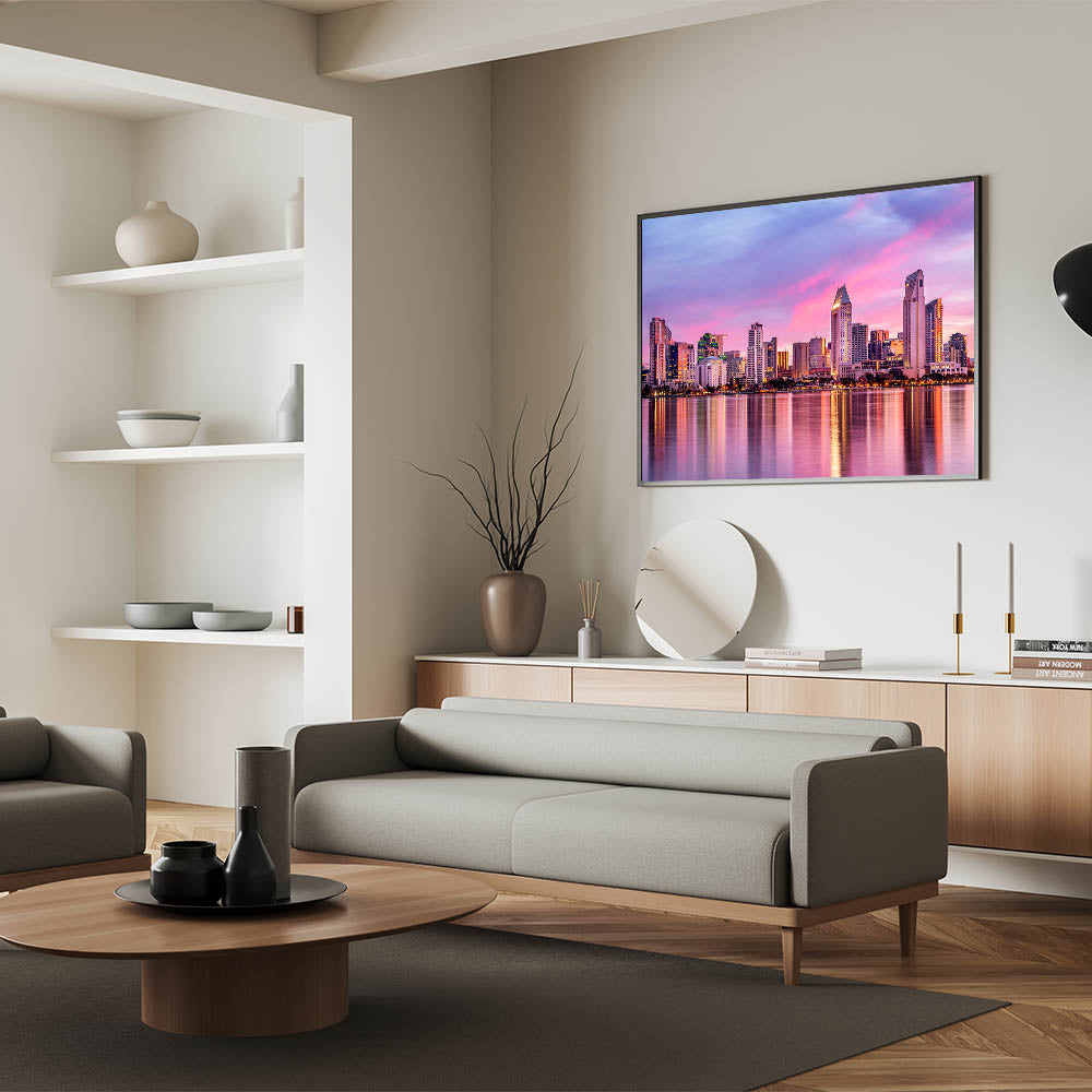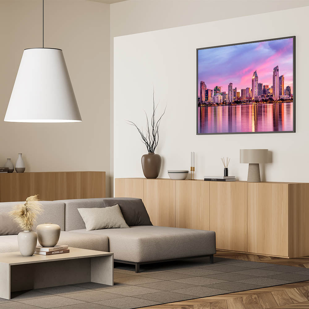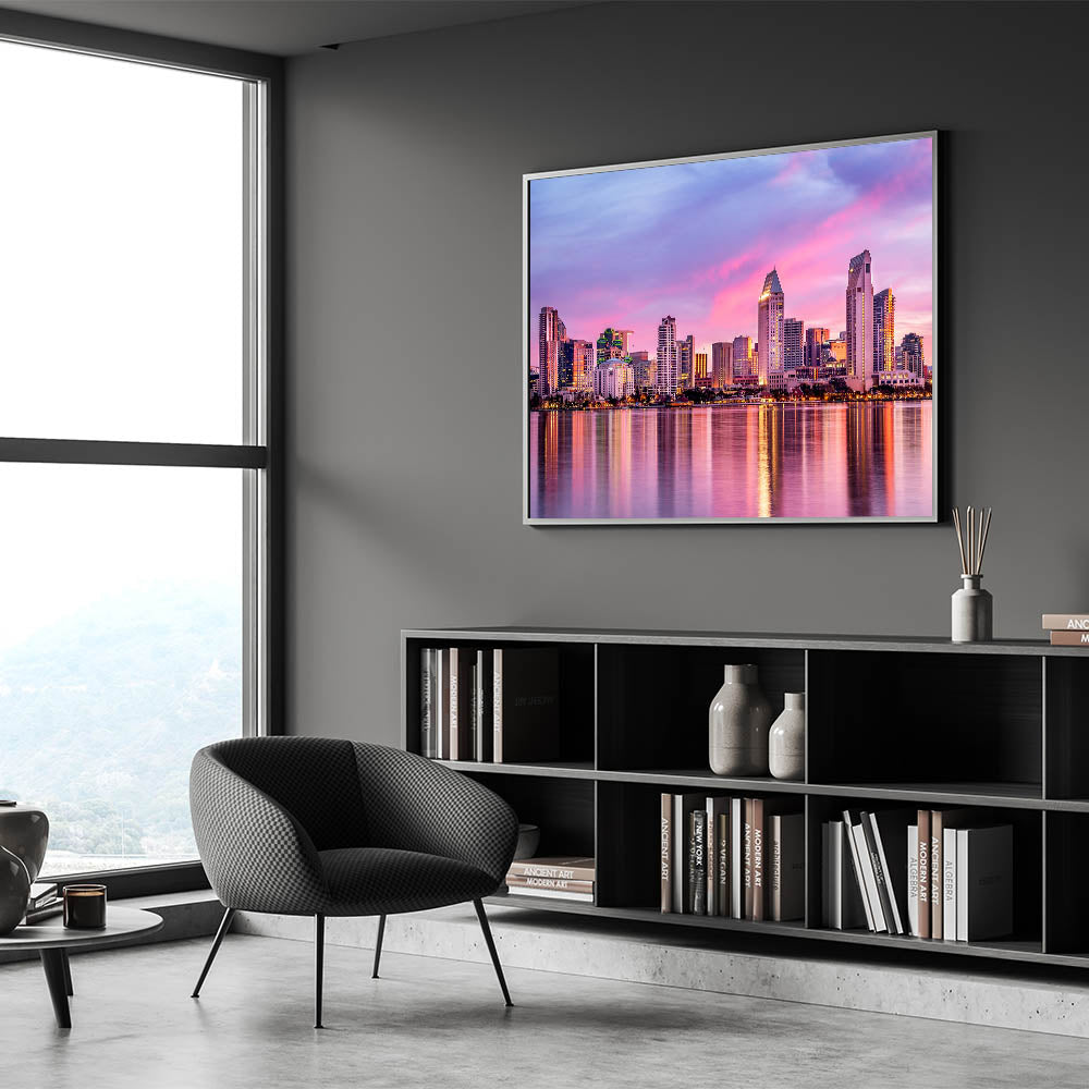 Infuse your decor with the beauty of San Diego’s colorful sunset skyline. The vibrant colors and serene water reflections make this artwork a stunning addition to any modern or urban-themed space.