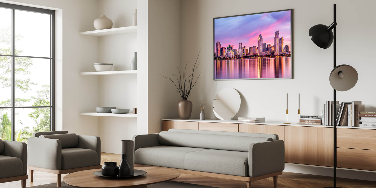 Bring the vivid colors of a San Diego sunset into your space with this captivating skyline wall art, part of our San Diego in Scenery by Region collection. This piece features the city’s iconic buildings silhouetted against a sky awash in shades of pink, purple, and lavender, with reflections dancing on the calm waters below. Ideal for those who love urban scenes with a touch of nature’s beauty, this artwork adds warmth and sophistication to any room.