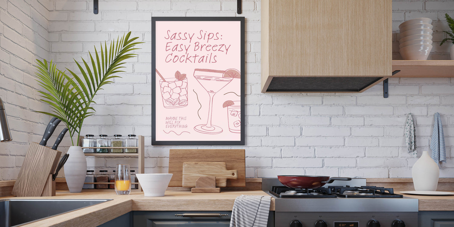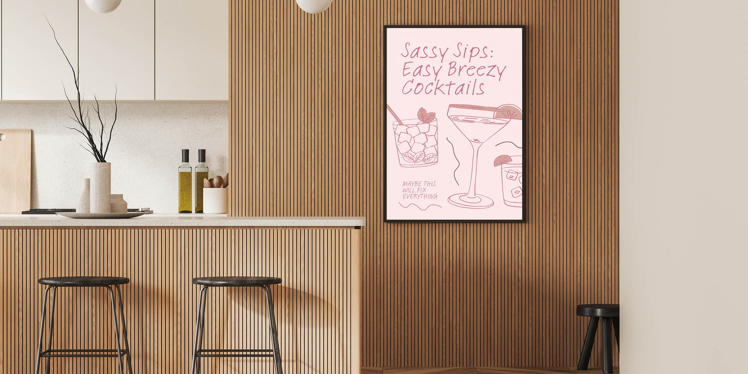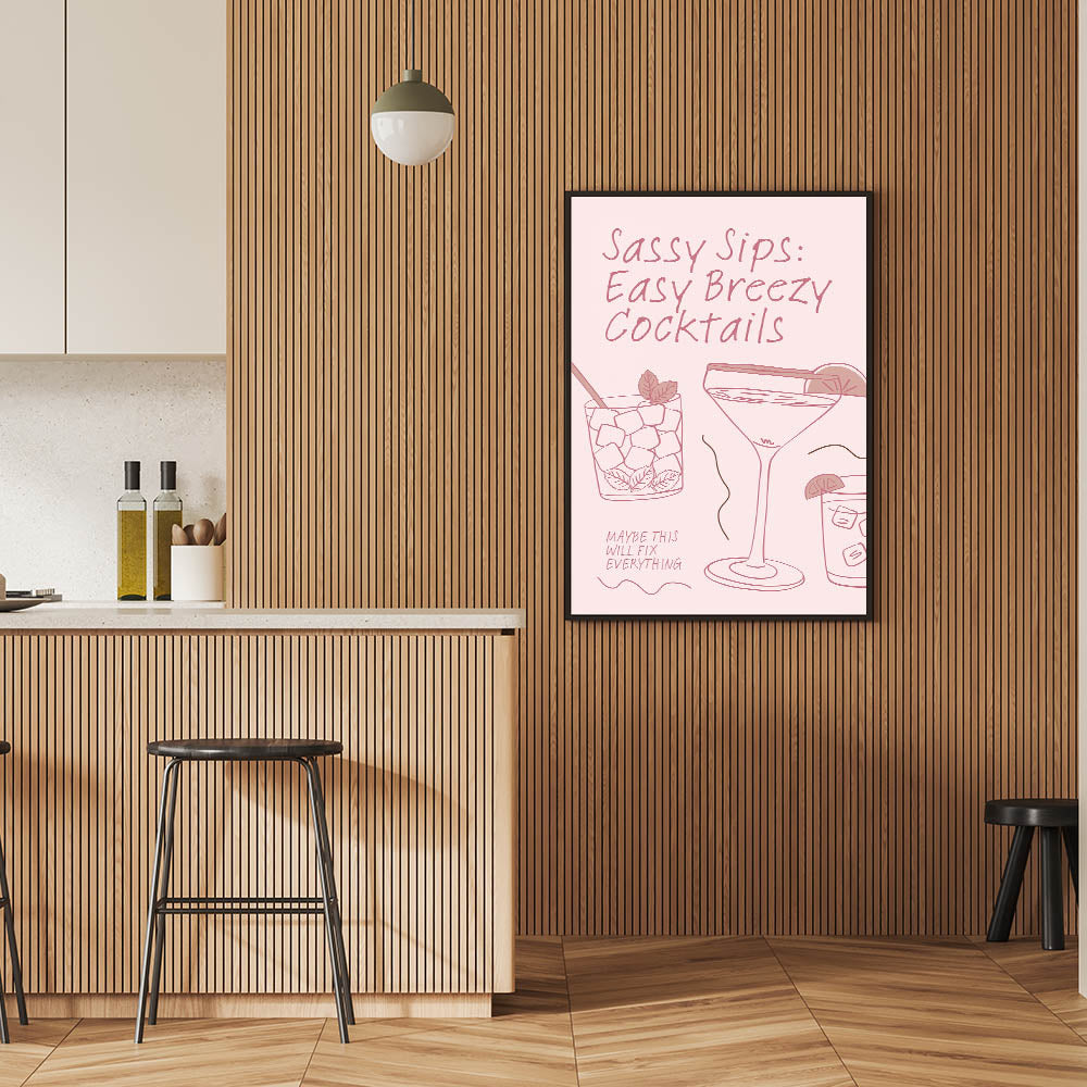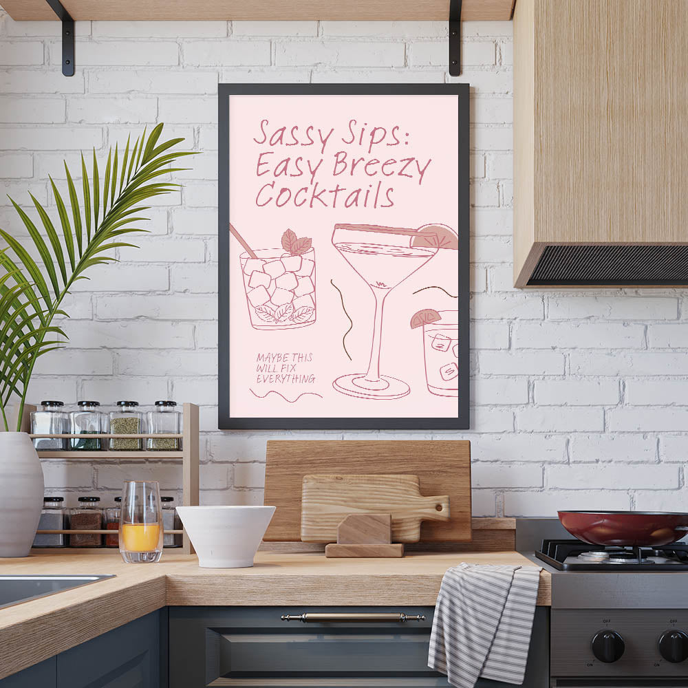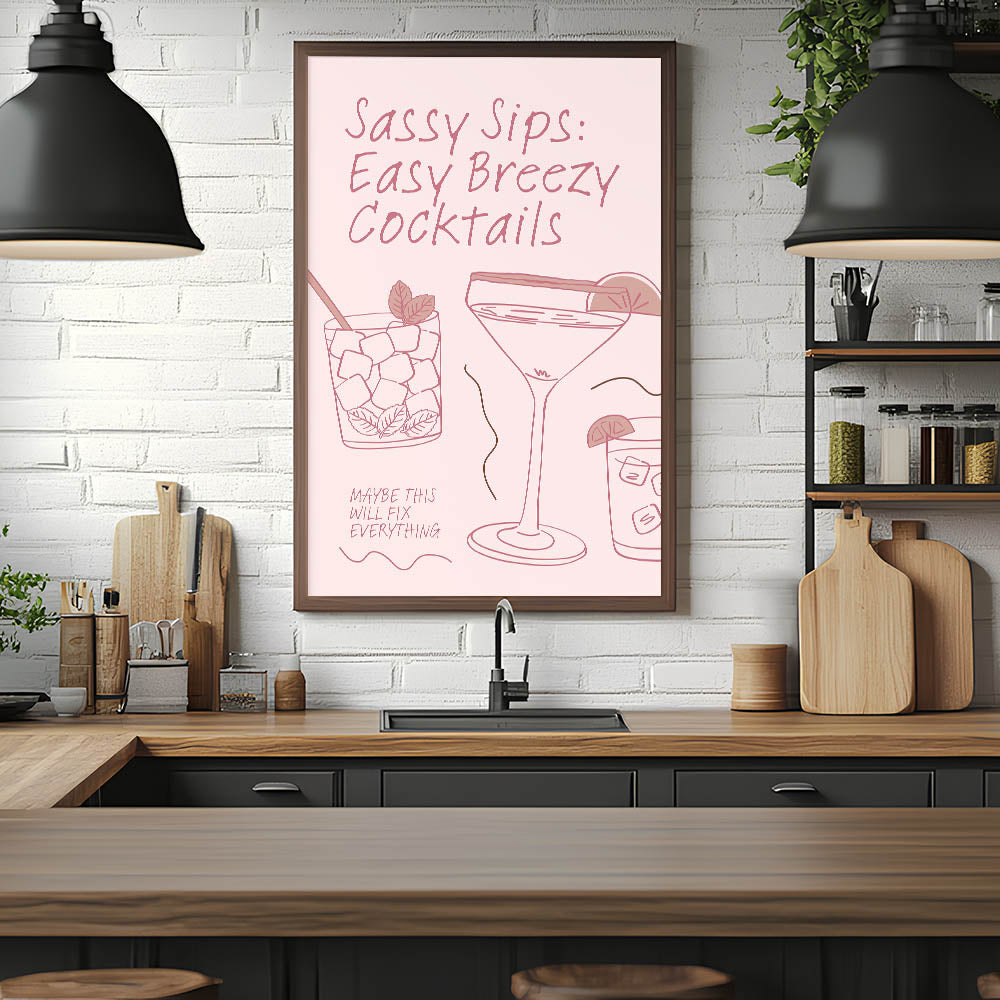 Add a touch of fun and elegance to your space with this cocktail wall art, featuring hand-drawn illustrations of refreshing drinks and the playful phrase, "Sassy Sips: Easy Breezy Cocktails." This beverage wall art is a must-have for cocktail lovers and mixology enthusiasts looking to elevate their home bar or kitchen.