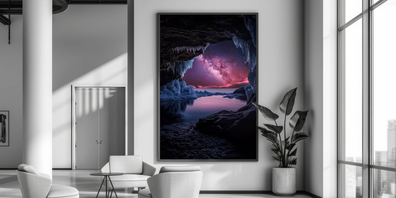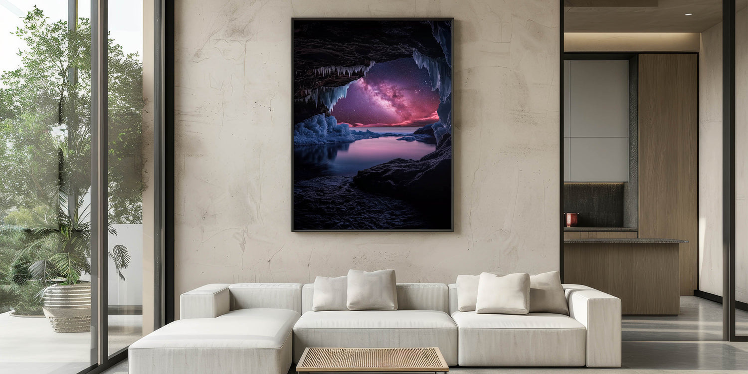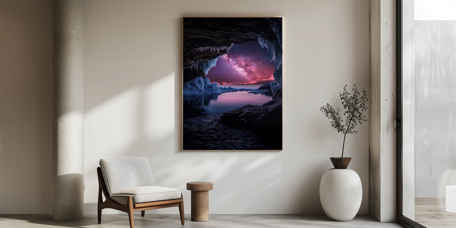 Bring the magic of the cosmos and the icy cavern into your decor with this striking piece of art. A perfect gift for stargazers and nature enthusiasts, this print will transform any room into a serene and awe-inspiring retreat.