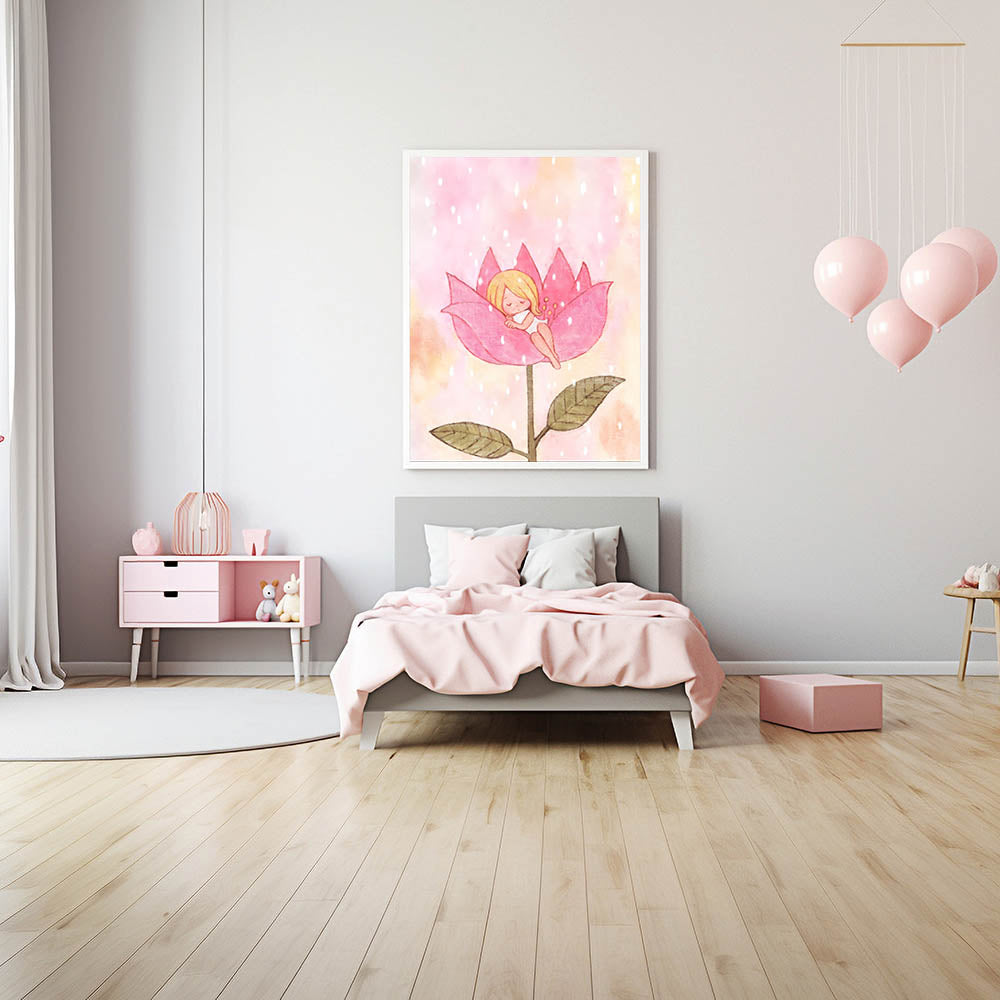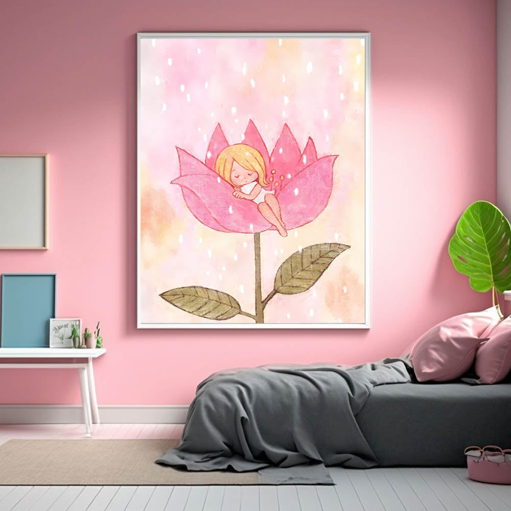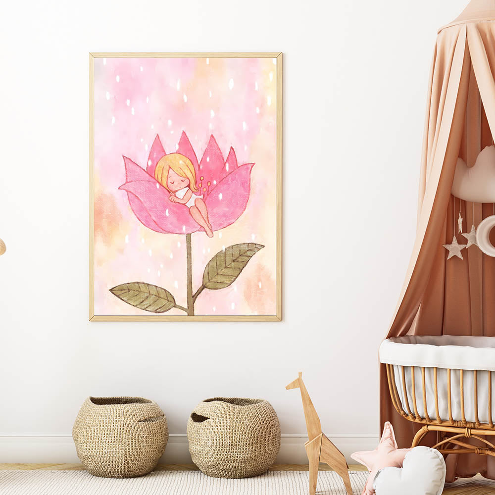 Create a magical and whimsical atmosphere in your child's space with this enchanting sleeping fairy wall art. This dreamy illustration features a tiny fairy peacefully resting inside a blooming pink flower, surrounded by soft pastel hues and delicate falling petals. The gentle watercolor texture and warm color palette make this piece perfect for a girls' bedroom, nursery, or playroom.