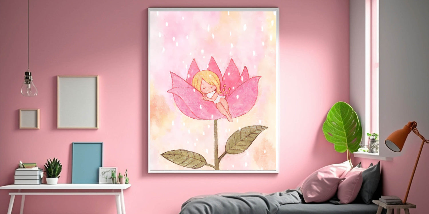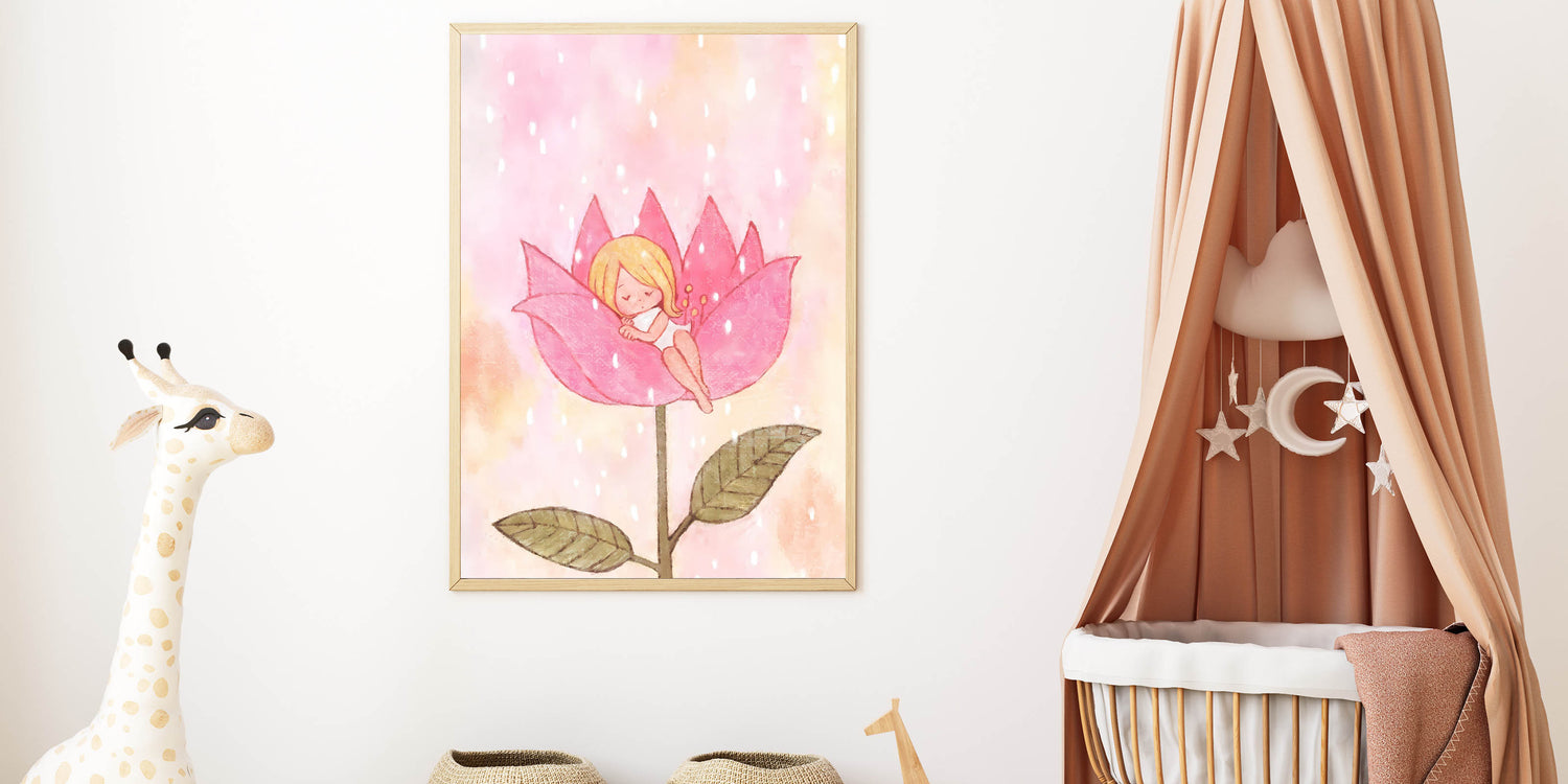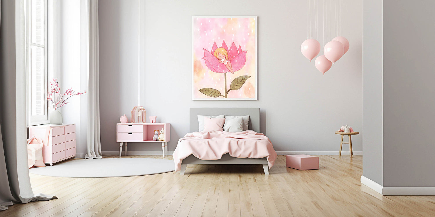 Create a magical and whimsical atmosphere in your child's space with this enchanting sleeping fairy wall art. This dreamy illustration features a tiny fairy peacefully resting inside a blooming pink flower, surrounded by soft pastel hues and delicate falling petals. The gentle watercolor texture and warm color palette make this piece perfect for a girls' bedroom, nursery, or playroom.