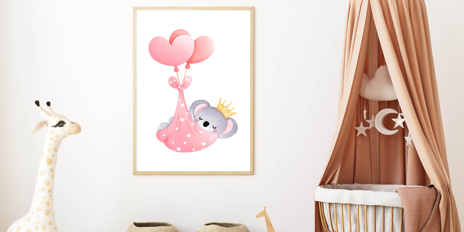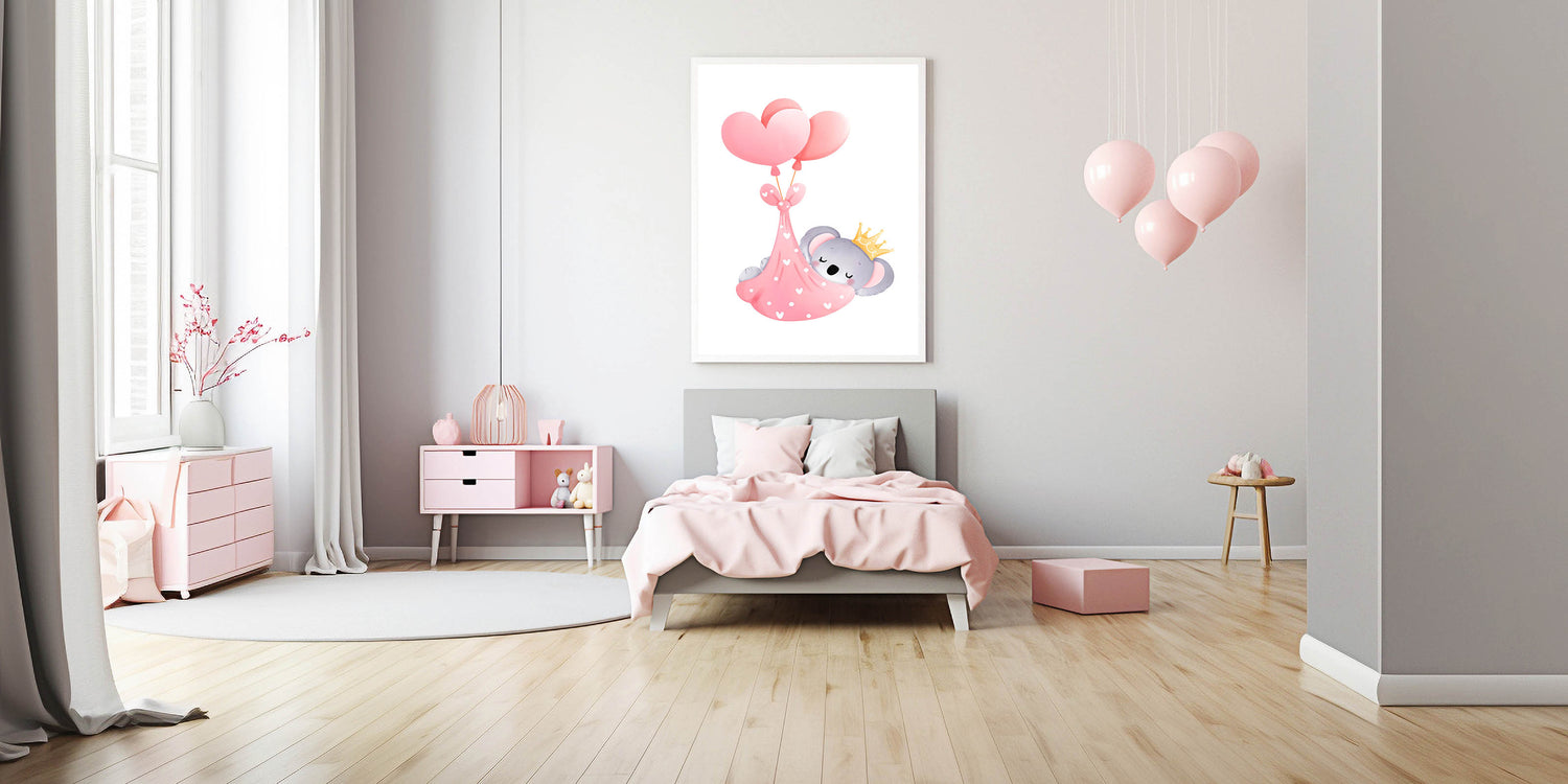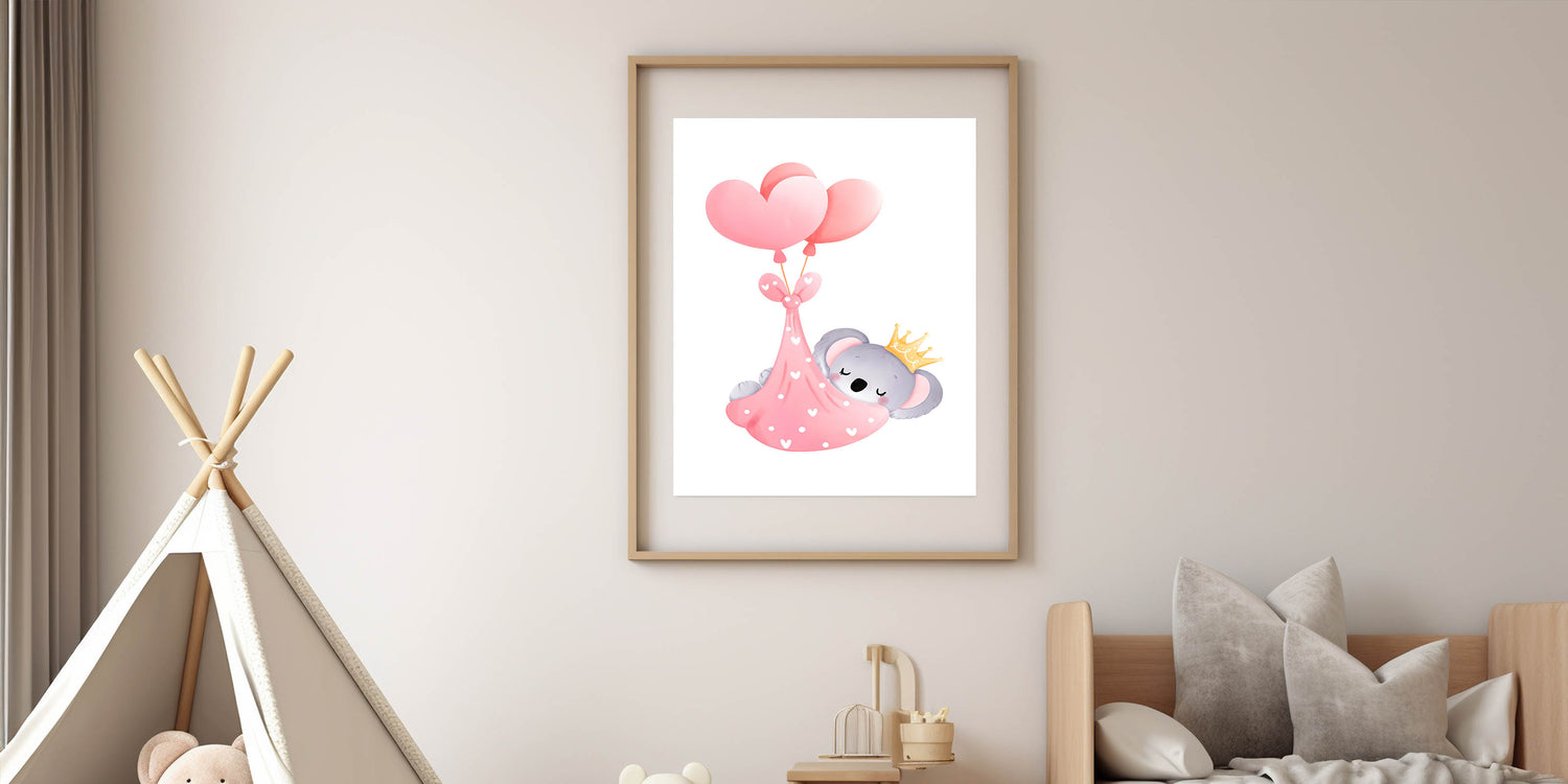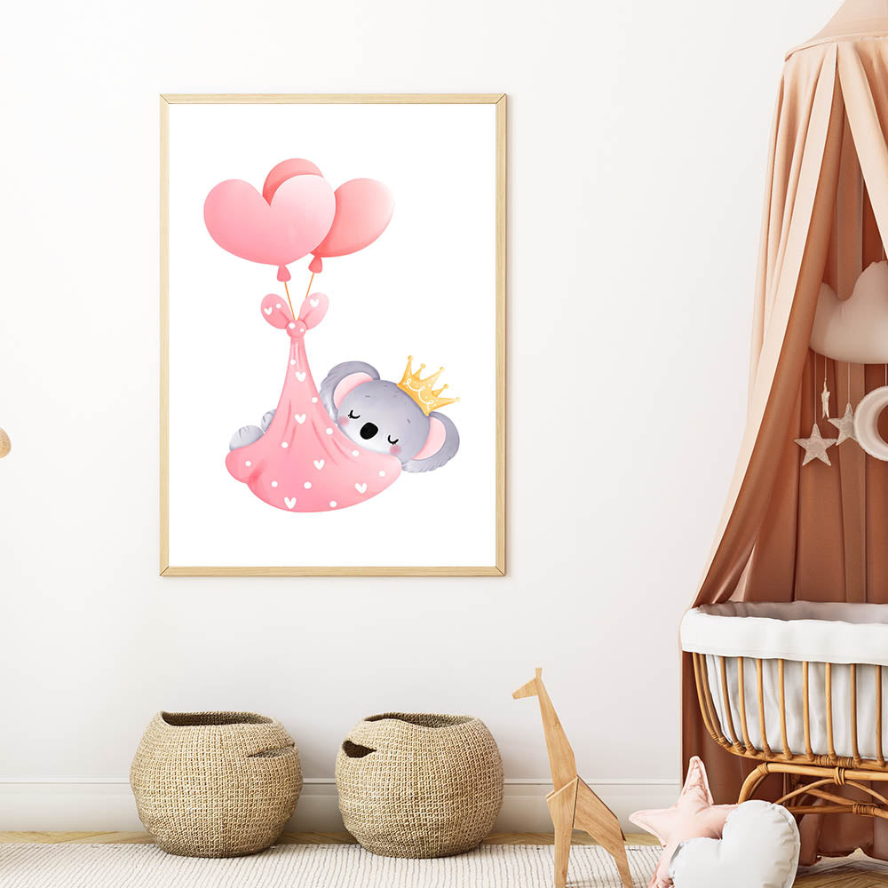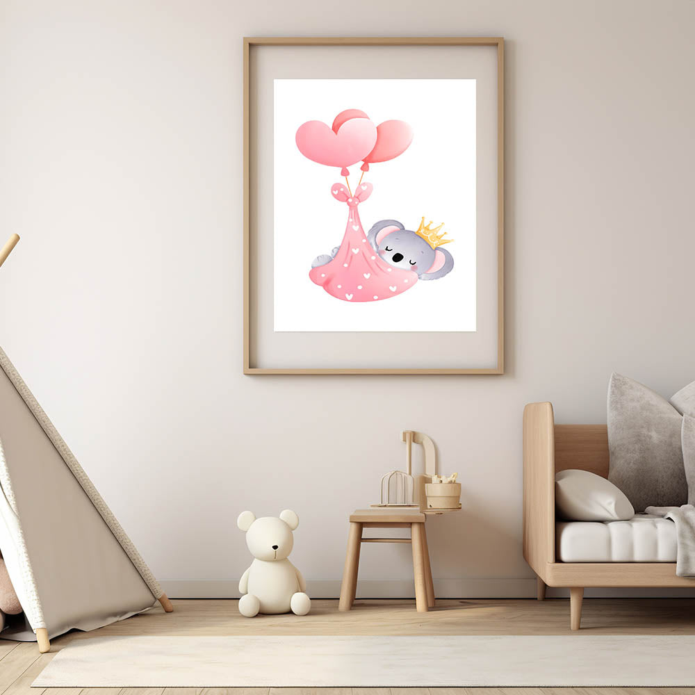 Add a touch of whimsy and charm to your child’s space with this Sleeping Koala with Balloons Print. Featuring a sweet koala wearing a golden crown, gently floating with heart-shaped balloons, this adorable artwork brings a magical and dreamy feel to nurseries, playrooms, and kids' bedrooms.