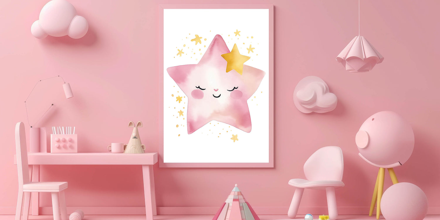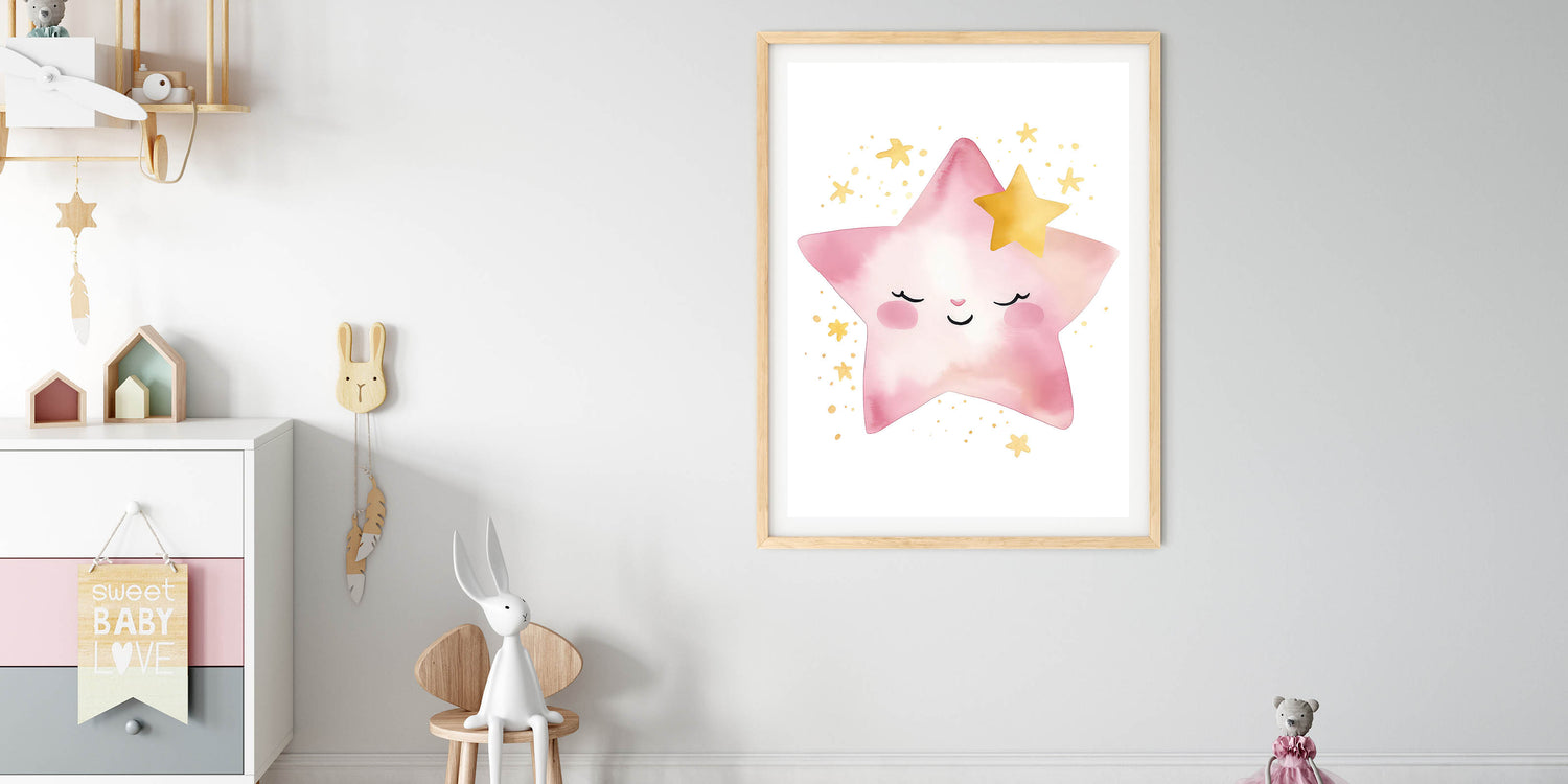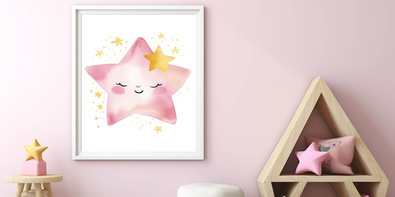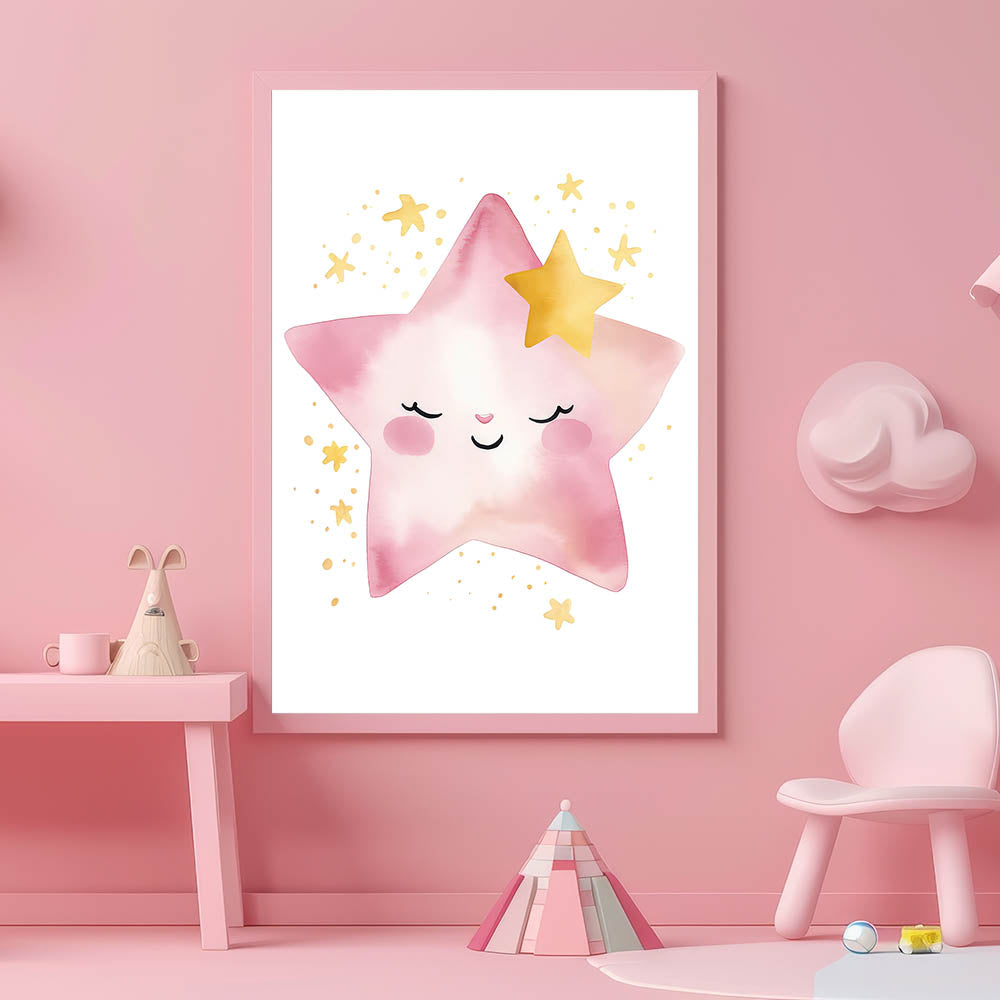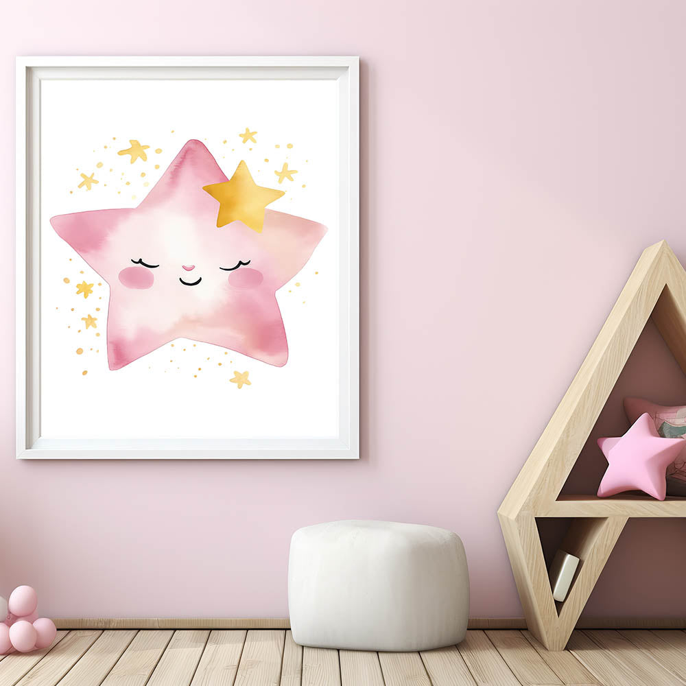 Create a dreamy and celestial space for your little one with this adorable smiling star wall art. Featuring a soft watercolor illustration of a pink star with a golden star accent, surrounded by scattered golden sparkles, this artwork brings a magical and whimsical touch to nurseries, girls' bedrooms, and playrooms. The delicate pastel tones and clean white background make it a perfect decor piece for creating a cozy and imaginative atmosphere.