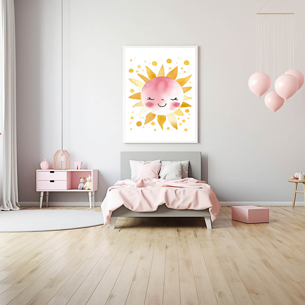 Brighten your child's space with this adorable smiling sun wall art. Featuring a charming watercolor sun with golden rays, soft pink blush, and playful golden dots, this artwork radiates warmth, happiness, and positivity. The delicate pastel tones and clean white background create a bright and joyful atmosphere, making it a perfect addition to nurseries, girls' bedrooms, and playrooms.