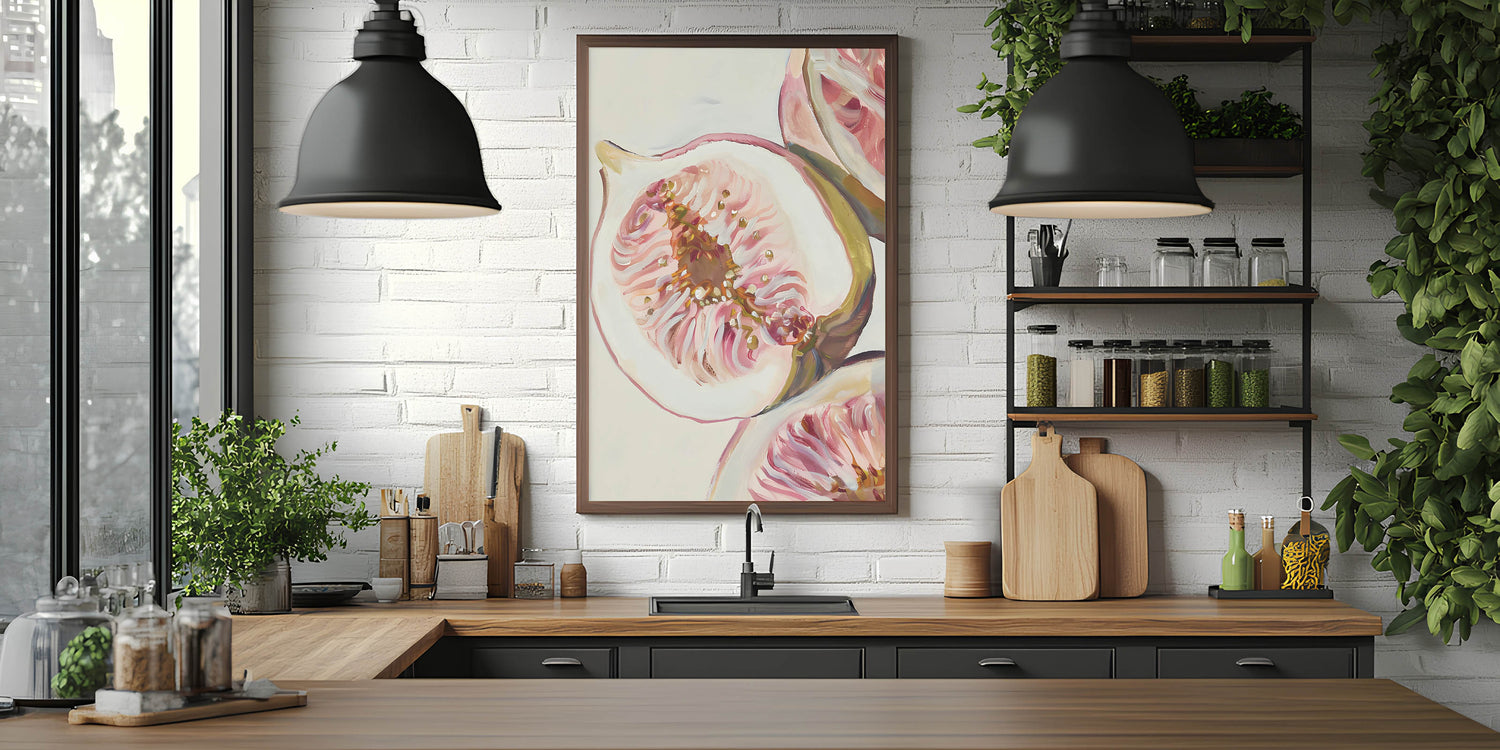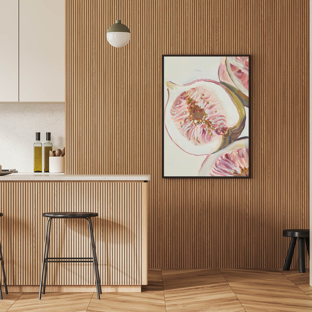 Enhance your space with the delicate beauty of fruit canvas art, featuring an artistic close-up of sliced figs. The soft pink and beige tones, paired with detailed brushstrokes, bring a sense of warmth and sophistication. This fruit wall decor is a perfect addition to kitchens, dining spaces, and cafés, creating a cozy yet elegant atmosphere.