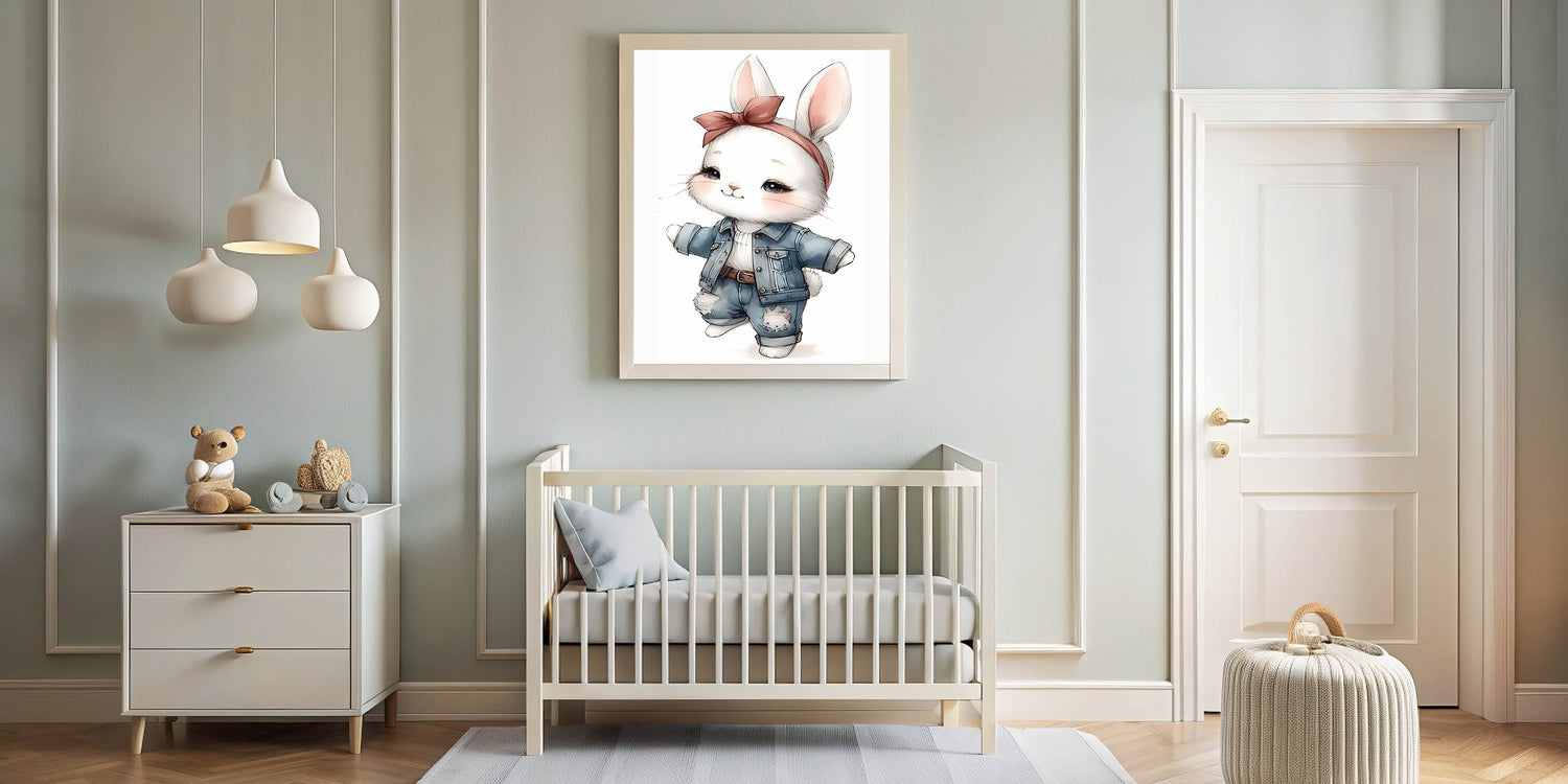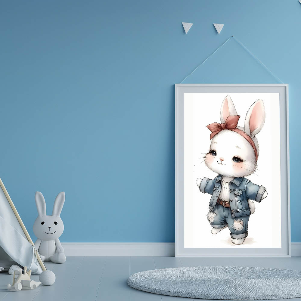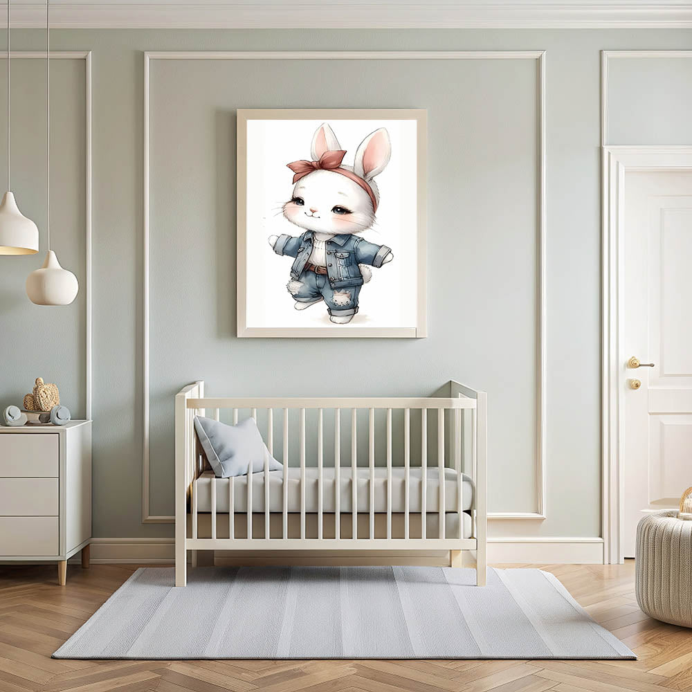 Add a touch of playful charm and fashion-forward style to your child’s space with this Stylish Bunny nursery wall art. Featuring an adorable white bunny dressed in trendy denim overalls and a chic bow headband, this artwork blends cuteness with a modern aesthetic, making it an ideal choice for baby room decor, children's wall art, and kids' room art prints. The soft neutral tones combined with blue denim and blush pink accents make it a perfect fit for modern and trendy nurseries.