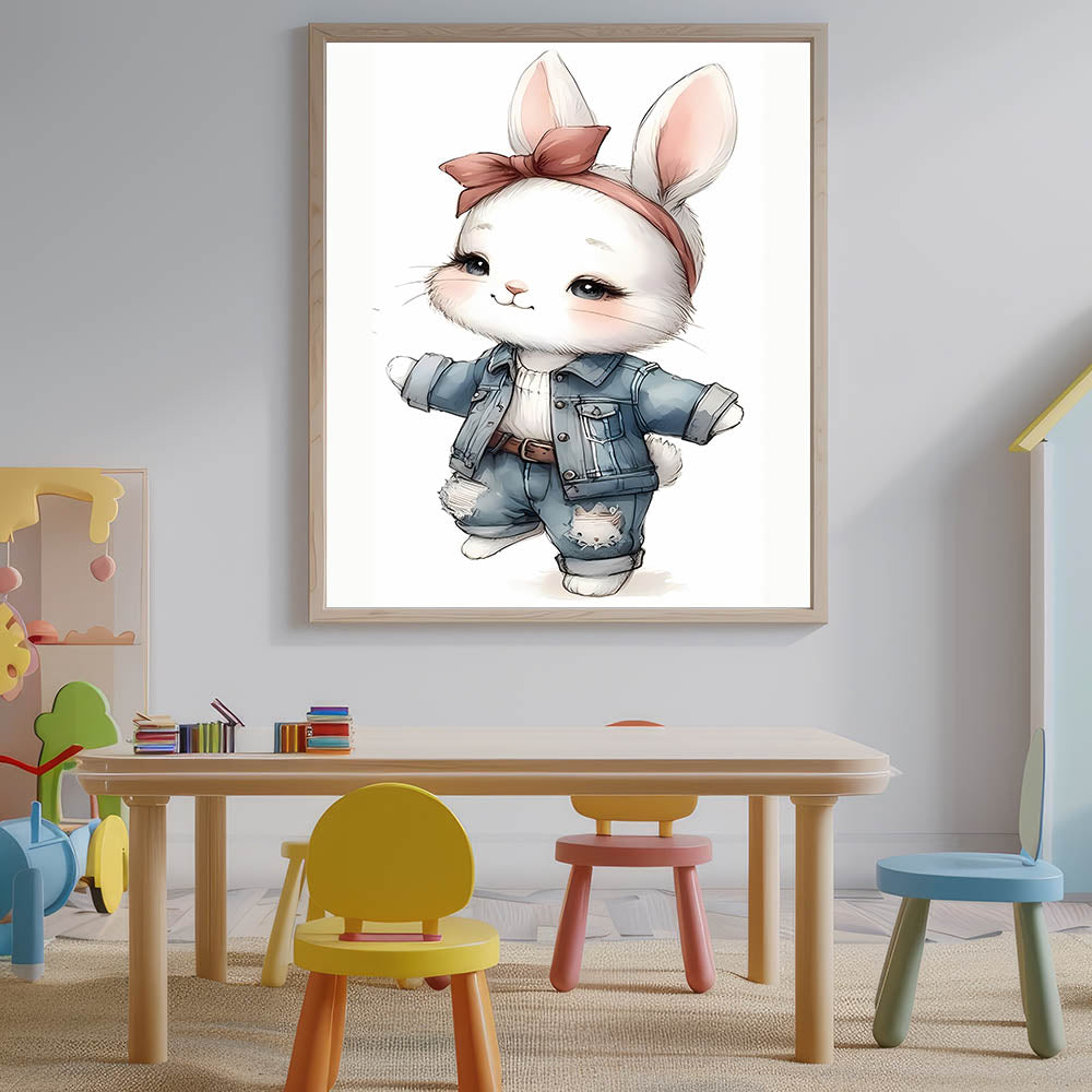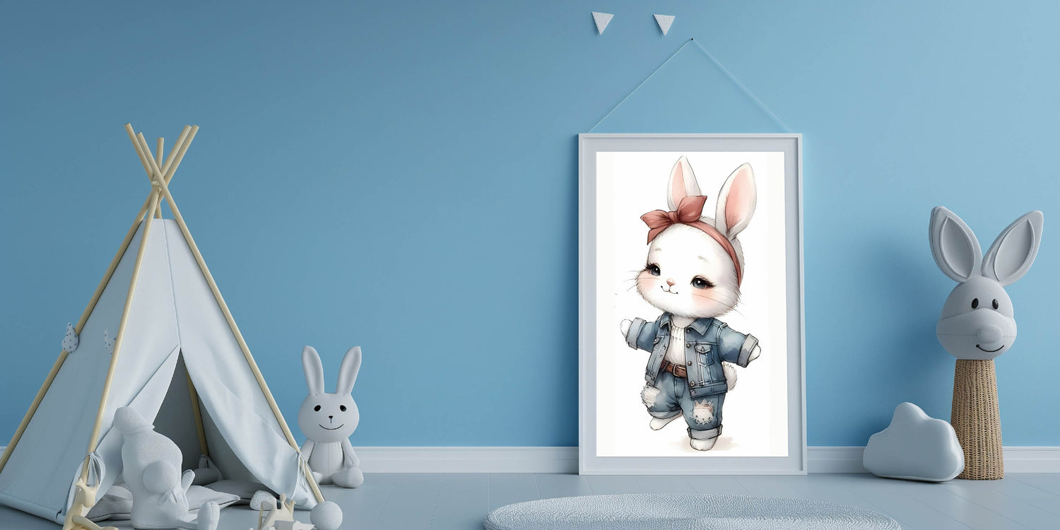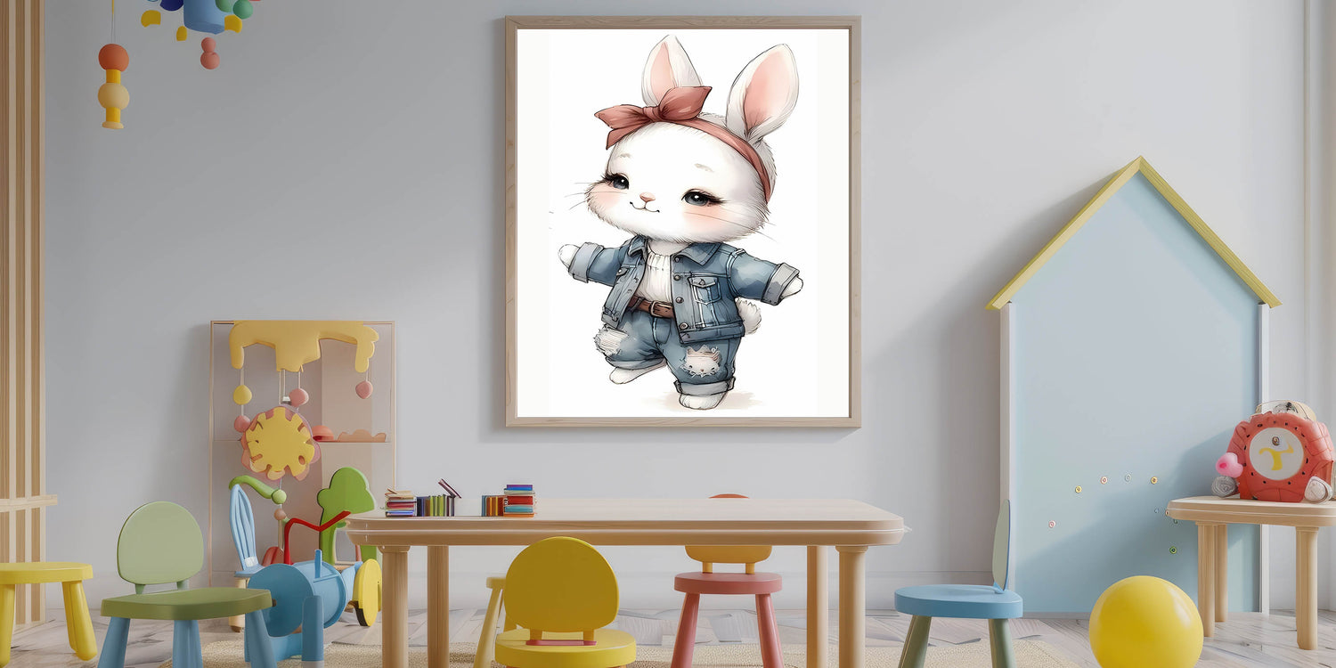 Add a touch of playful charm and fashion-forward style to your child’s space with this Stylish Bunny nursery wall art. Featuring an adorable white bunny dressed in trendy denim overalls and a chic bow headband, this artwork blends cuteness with a modern aesthetic, making it an ideal choice for baby room decor, children's wall art, and kids' room art prints. The soft neutral tones combined with blue denim and blush pink accents make it a perfect fit for modern and trendy nurseries.