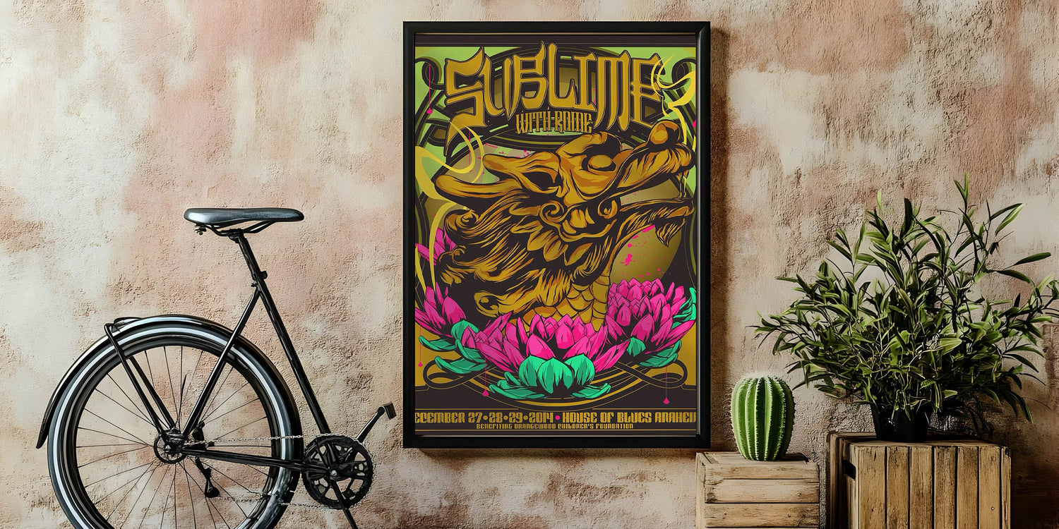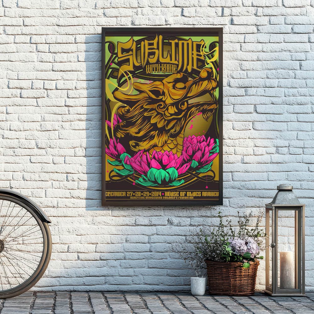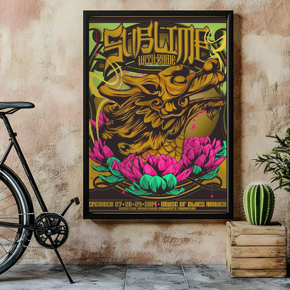Add a burst of color and rock history to your collection with this Sublime with Rome 2014 House of Blues Anaheim poster. Featuring a stunning design with a golden dragon intertwined with vibrant pink and green lotus flowers, this eye-catching print captures the unique fusion of art and music. The bold graphics and psychedelic colors make this vintage concert poster a must-have for fans of Sublime, Rome, and collectors of rock memorabilia.