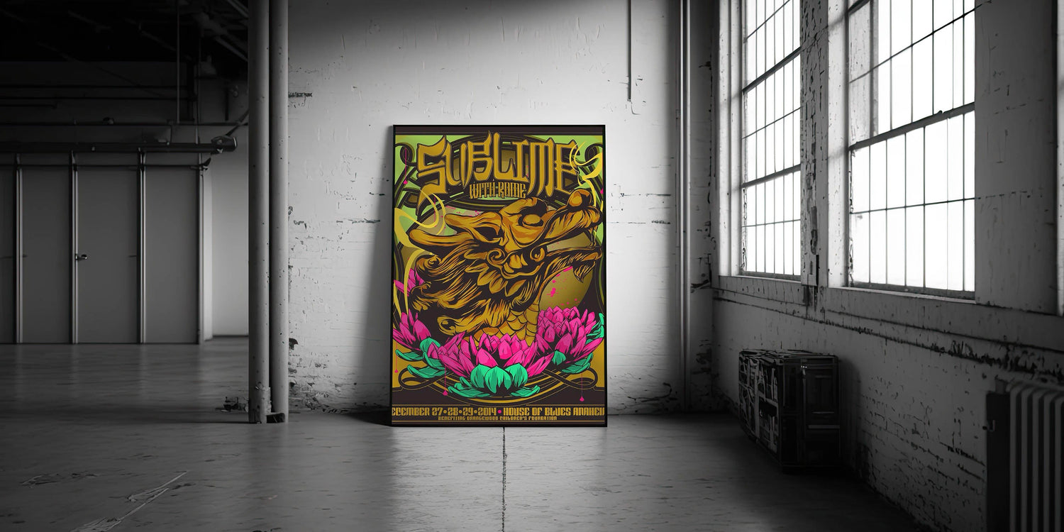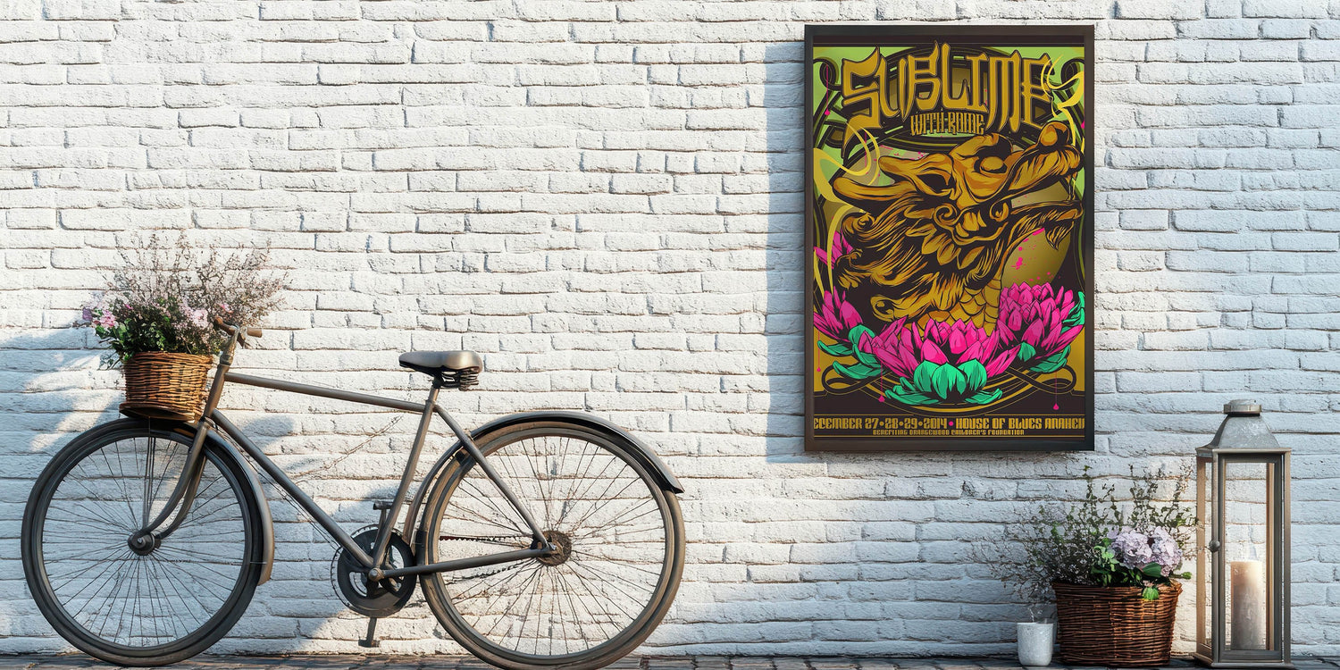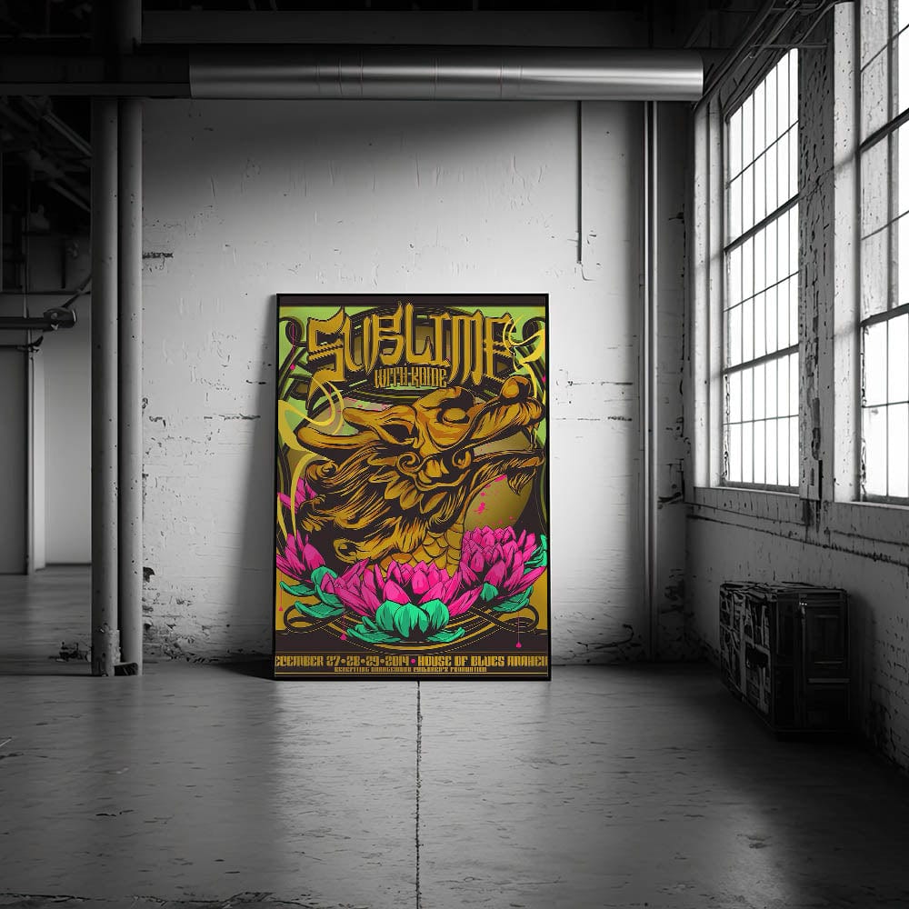 Add a burst of color and rock history to your collection with this Sublime with Rome 2014 House of Blues Anaheim poster. Featuring a stunning design with a golden dragon intertwined with vibrant pink and green lotus flowers, this eye-catching print captures the unique fusion of art and music. The bold graphics and psychedelic colors make this vintage concert poster a must-have for fans of Sublime, Rome, and collectors of rock memorabilia.
