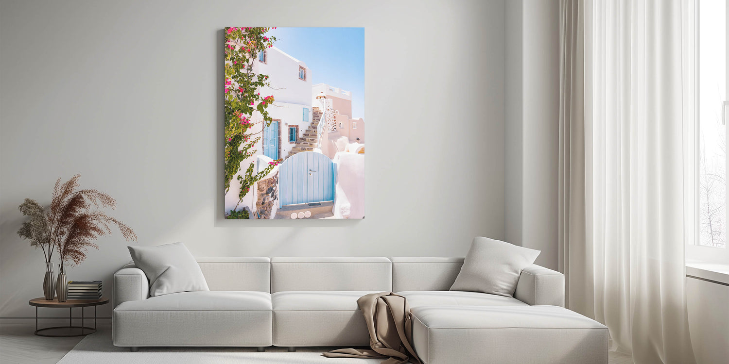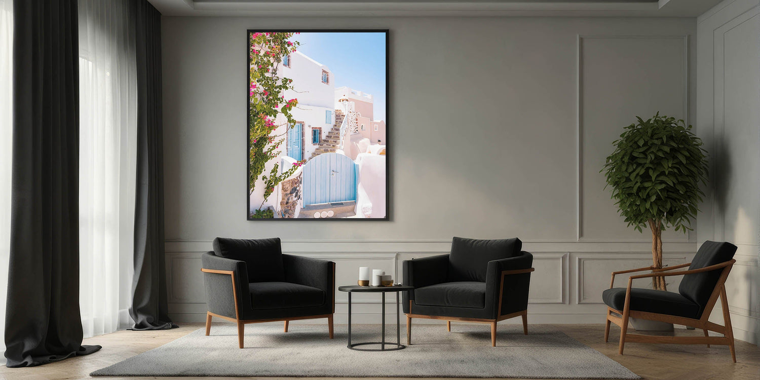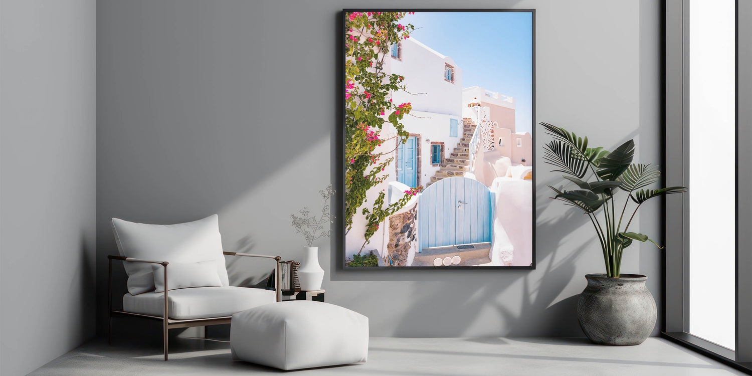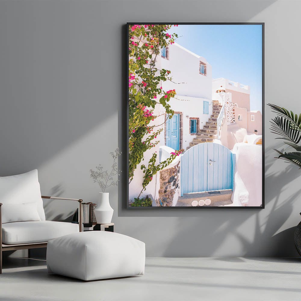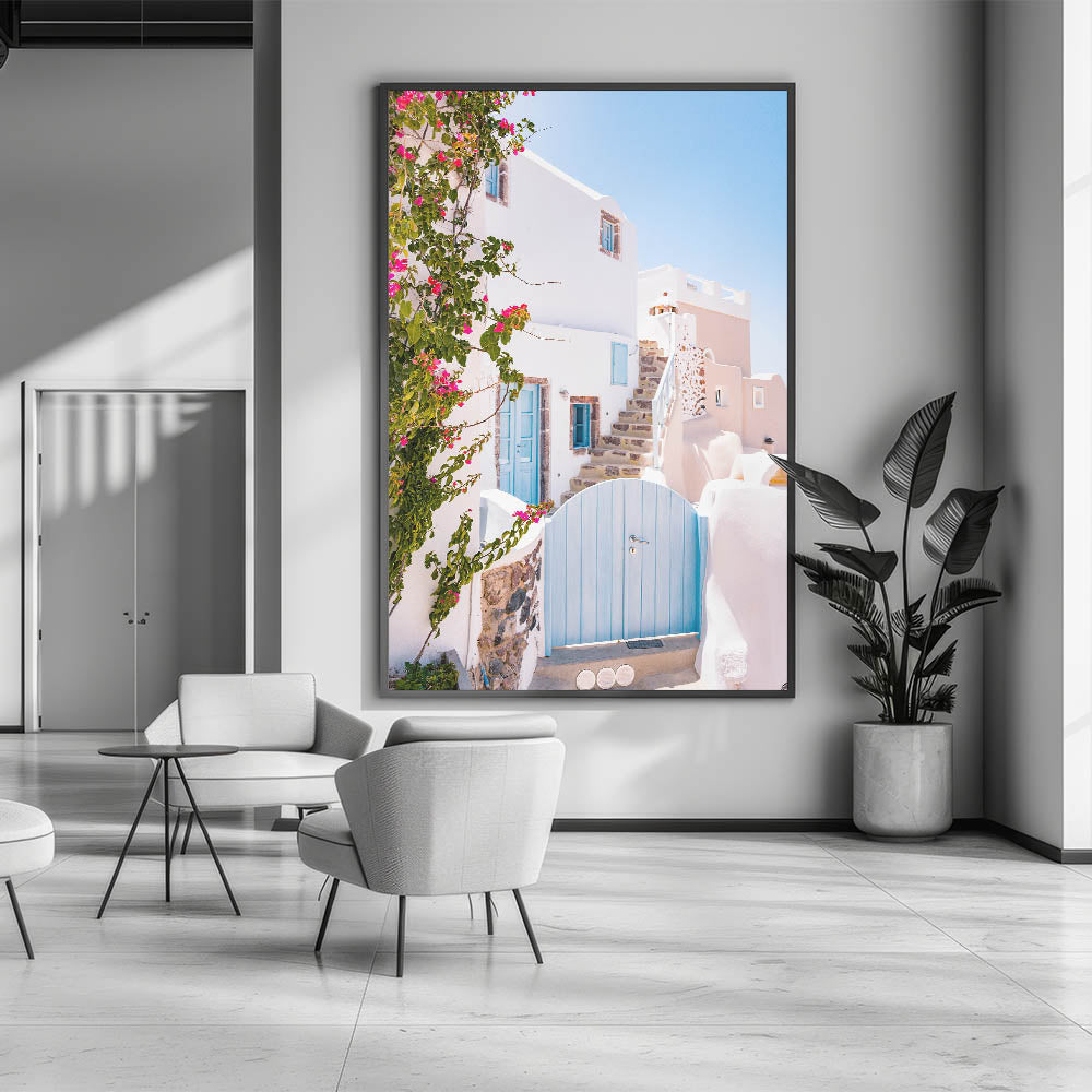 Transform your walls into a Mediterranean paradise with this Santorini-inspired summer art. The blend of architecture, nature, and vibrant hues will transport you to a relaxing coastal getaway every day.