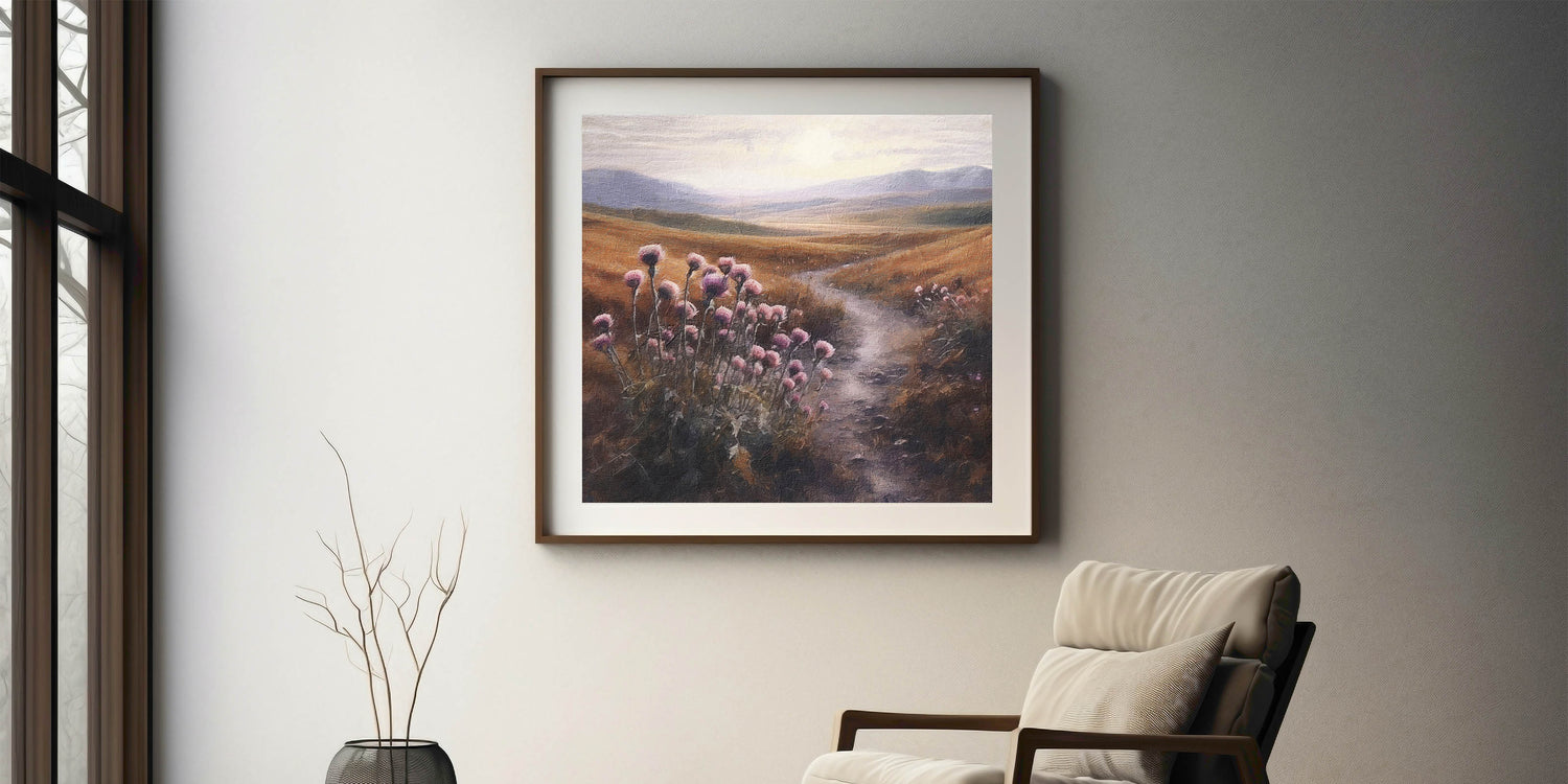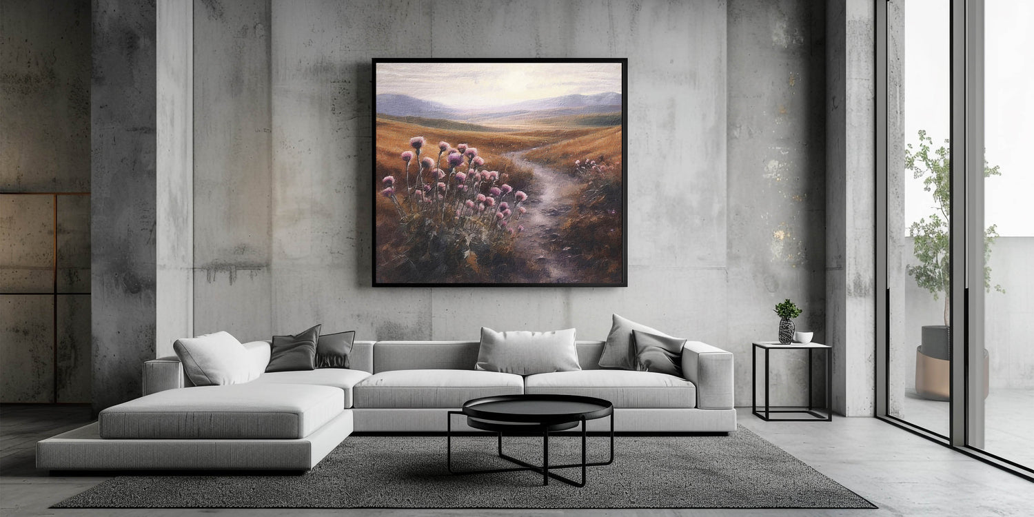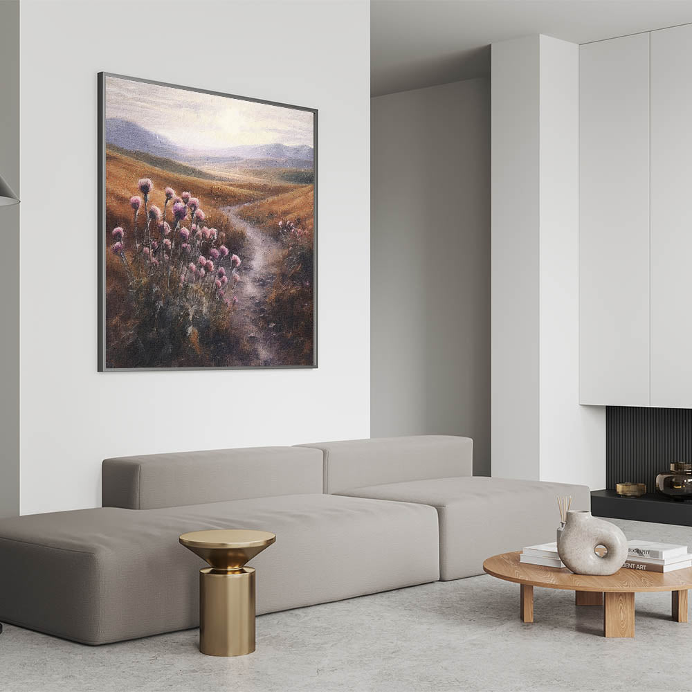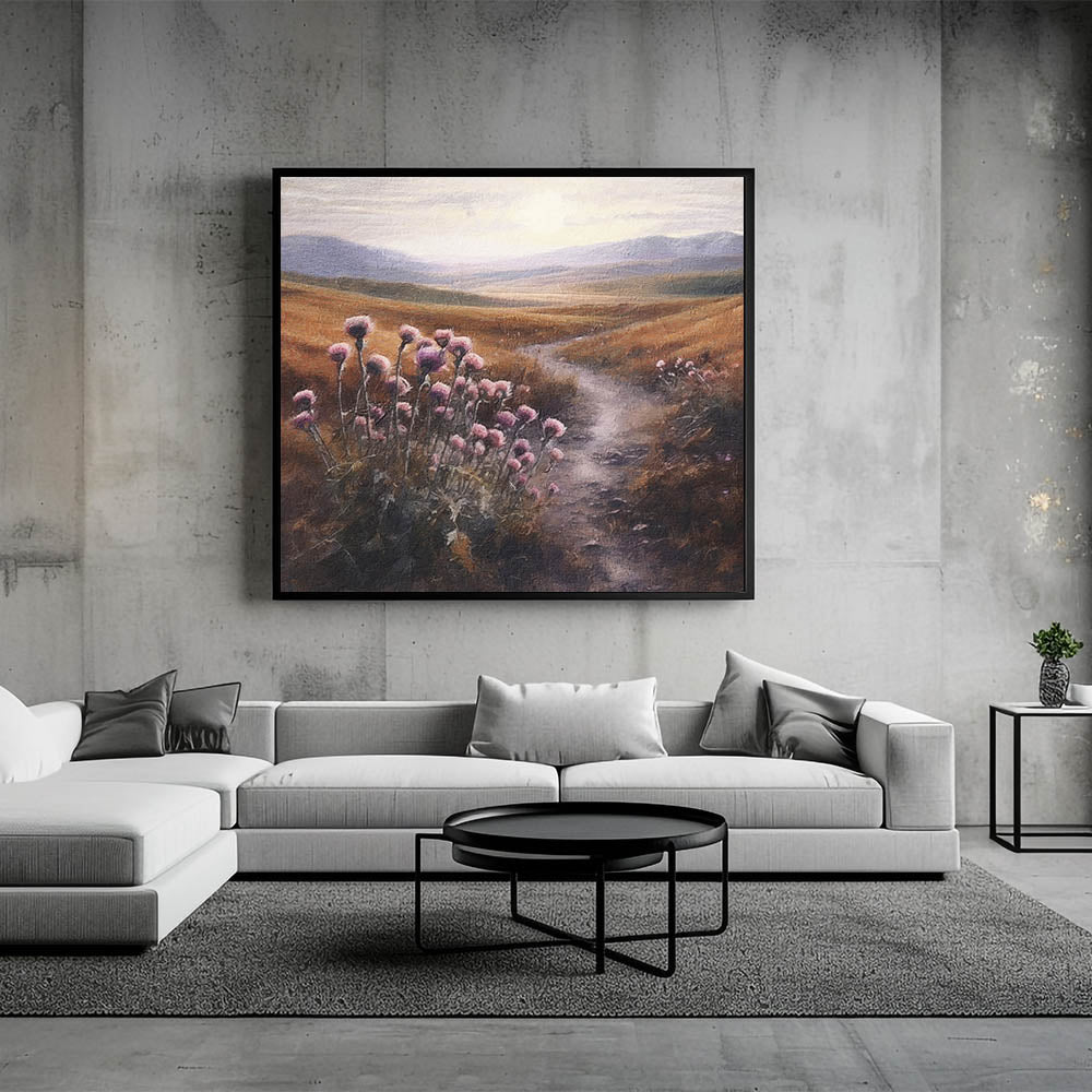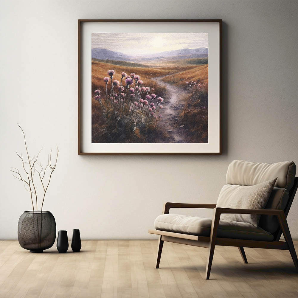 Embrace the serene beauty of the countryside with this captivating wall art featuring sunlit wildflowers along a winding path. Set against the backdrop of soft, rolling hills, the gentle pink and purple hues of the flowers create a warm, inviting atmosphere. This piece is ideal for anyone looking to add a touch of rustic charm and natural elegance to their home decor.