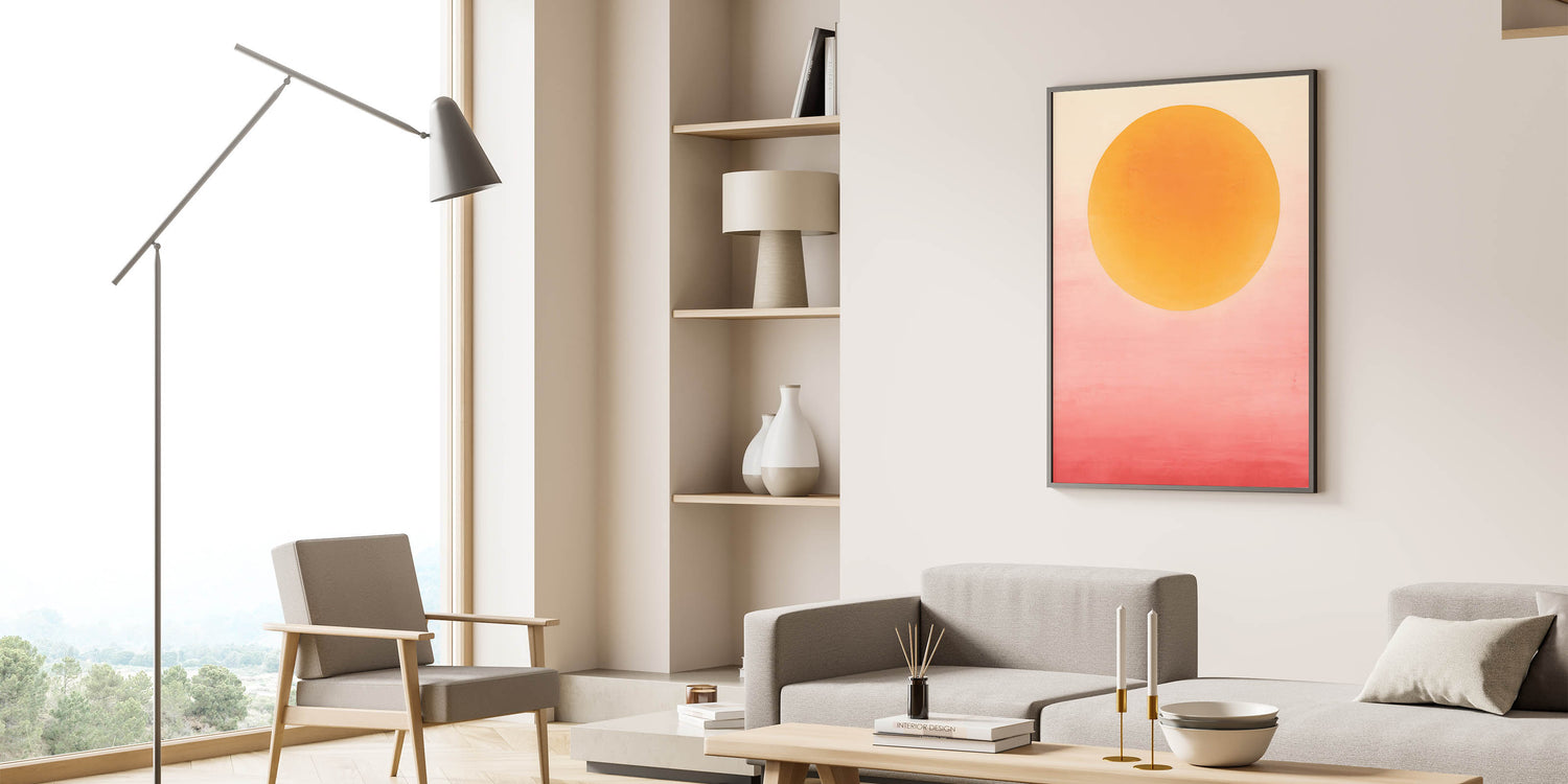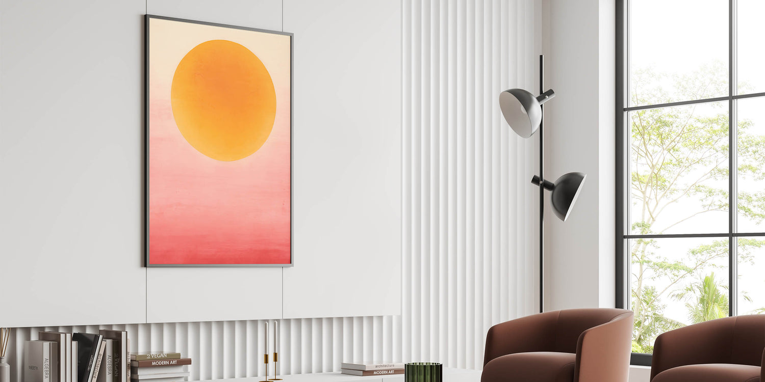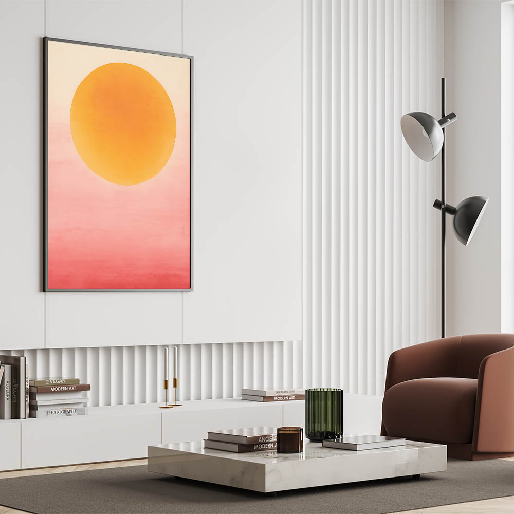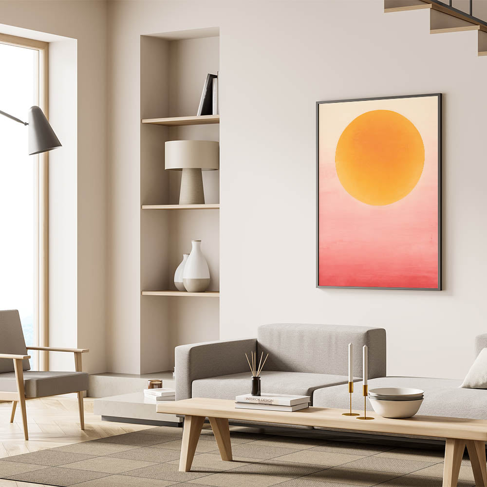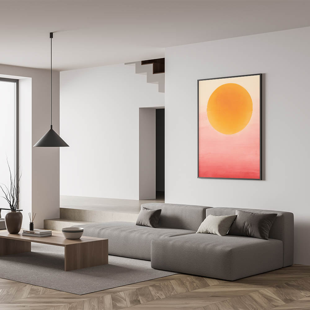 Add a vibrant splash to your space with this bold abstract art, capturing the warmth of a sunset glow with its yellow and pink gradient. The large, circular form against a soft ombré background brings energy and serenity, perfect for creating a statement in modern and bohemian interiors. Available in various formats, including stretched canvas, acrylic glass, and framed prints, this artwork is designed to infuse any room with color and warmth.