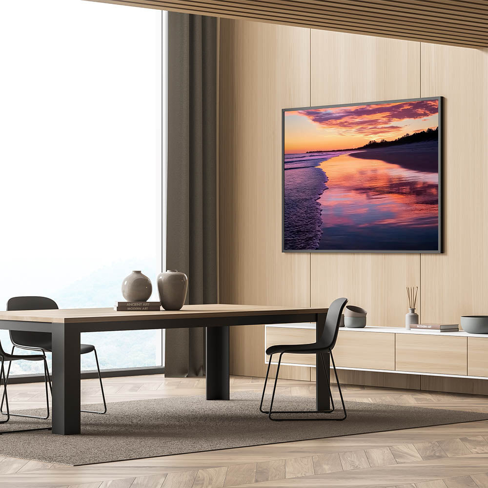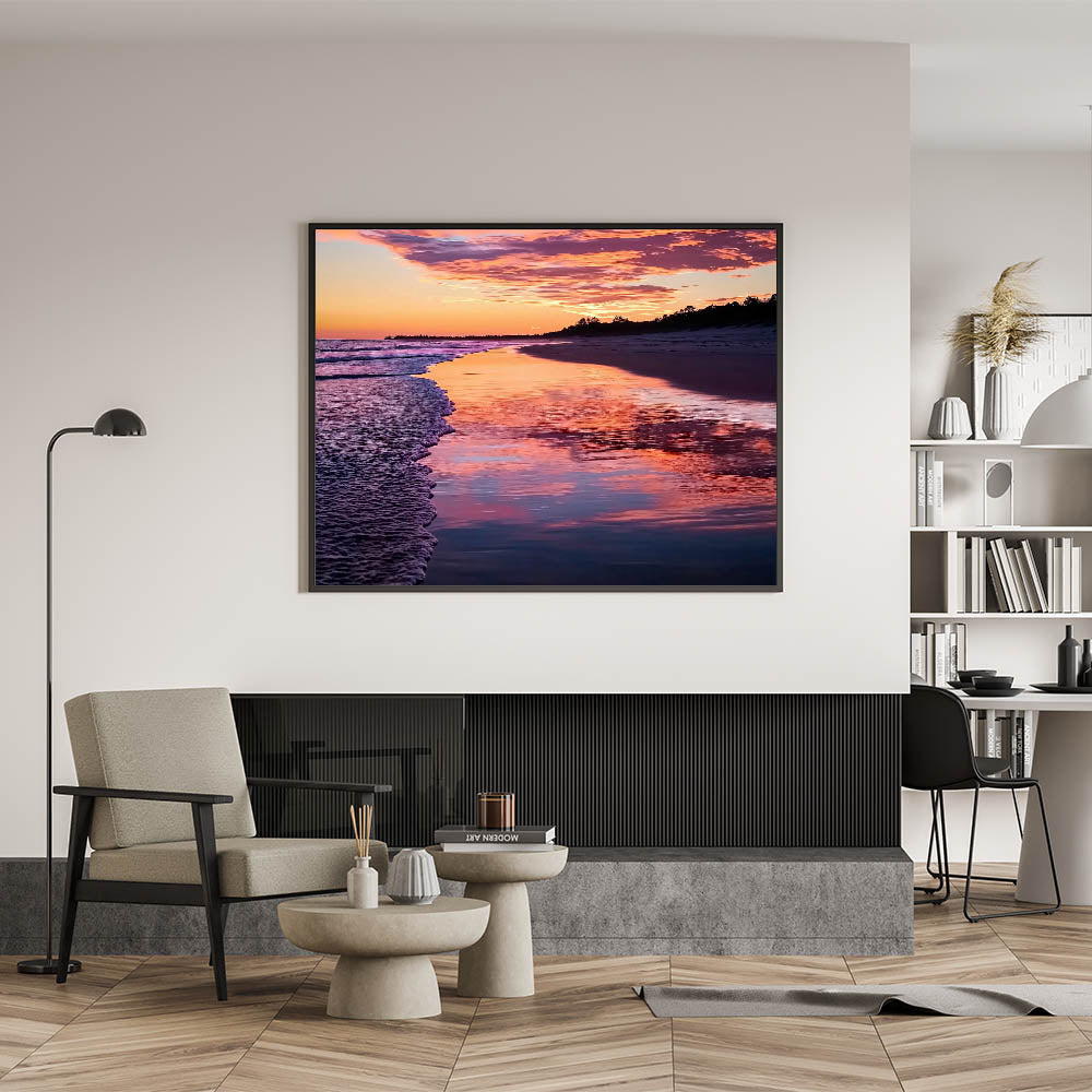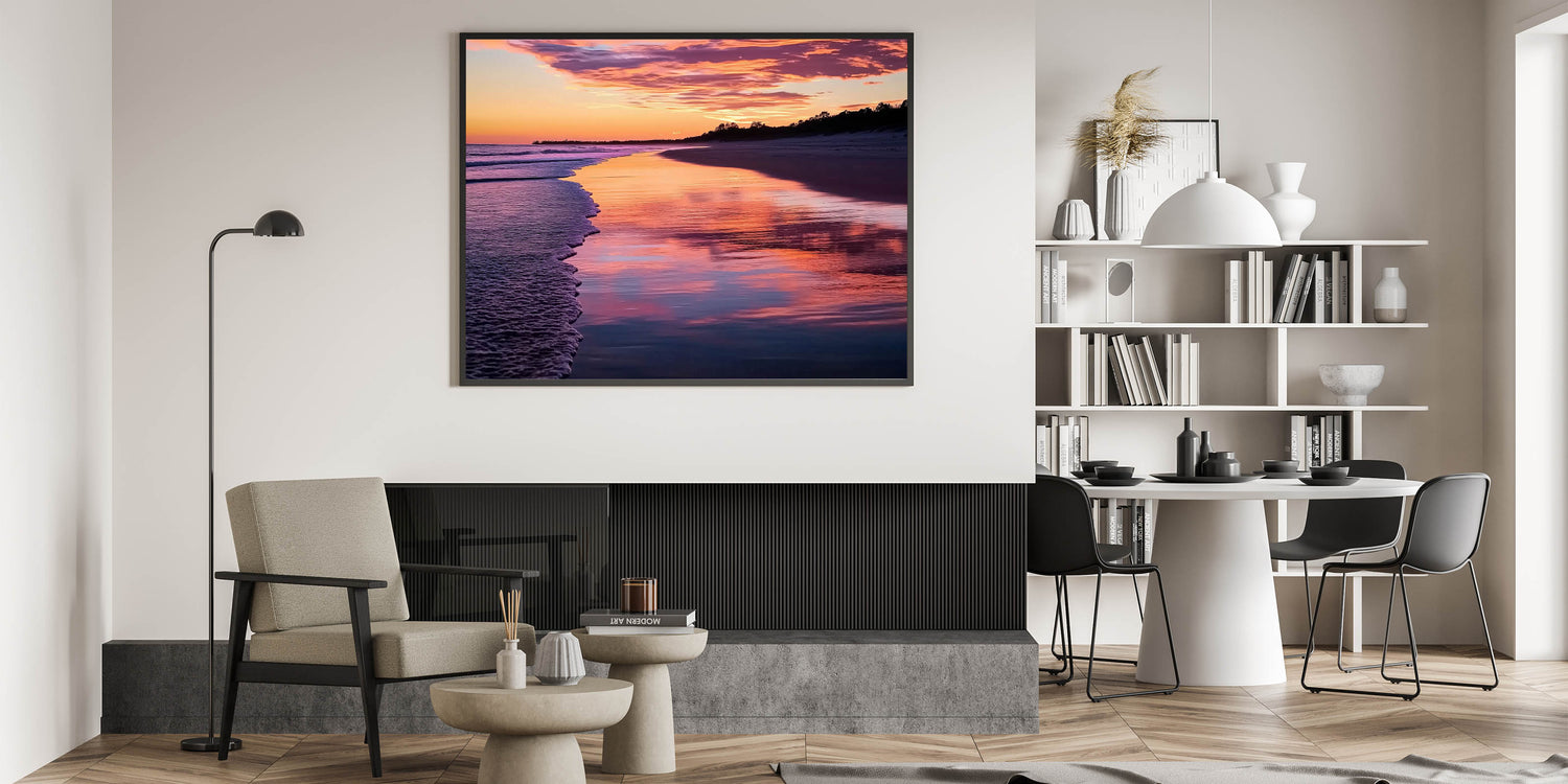 Transform your home with this vibrant sunset reflections wall art, showcasing the mesmerizing beauty of a serene shoreline bathed in radiant pinks, purples, and golden hues. The intricate details of the gentle waves and reflective water make this piece perfect for creating relaxing coastal views. Ideal for enhancing beach home decor ideas, this artwork brings warmth and a sense of calm to any space.