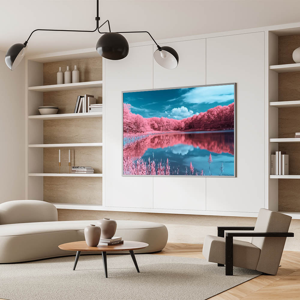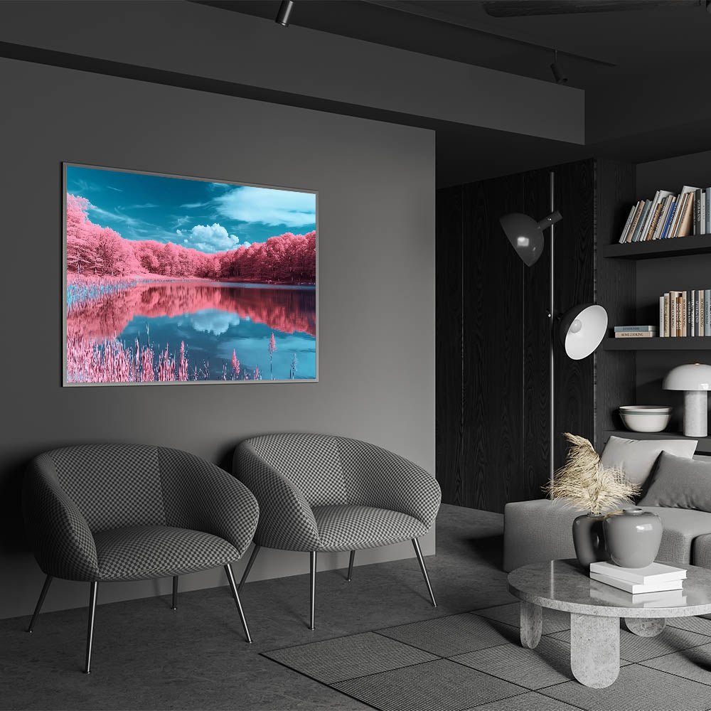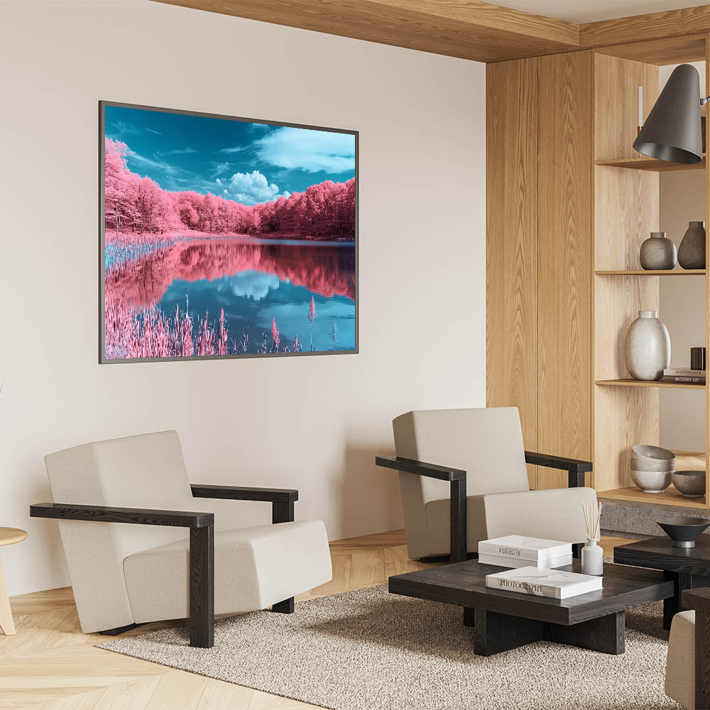 Transform your space with this mesmerizing surreal nature wall art, featuring a vibrant pink forest reflected beautifully in a calm lake under a brilliant blue sky. The striking contrast of colors and dreamlike composition make this piece a perfect statement for those seeking unique and relaxing coastal views. Its bold design adds a modern and artistic flair to your beach home decor ideas.