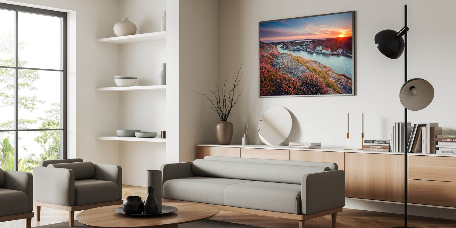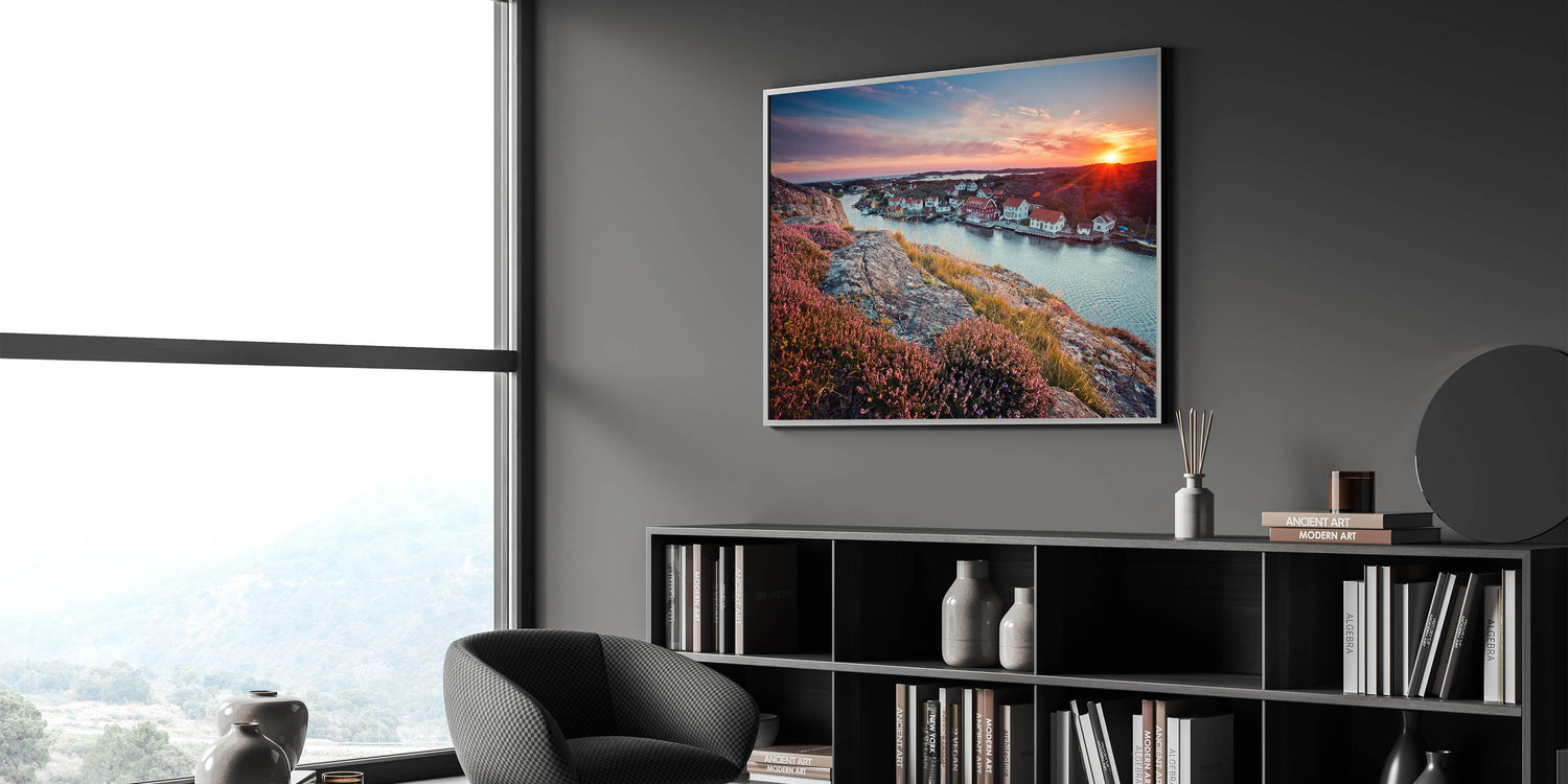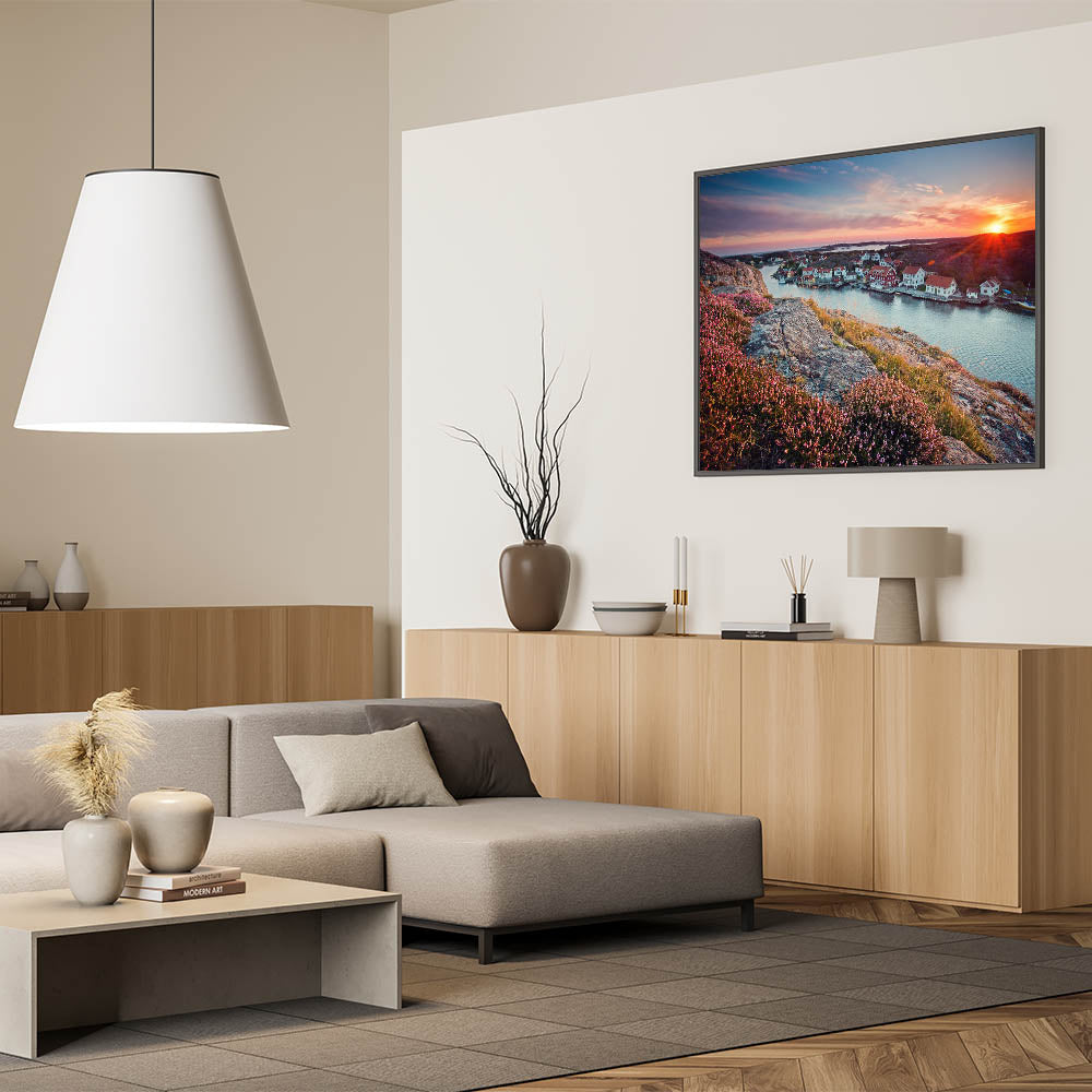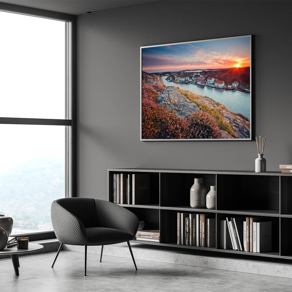 - Beautiful Swedish Landscape Prints: A stunning sunset over a coastal village with colorful homes and rocky cliffs.