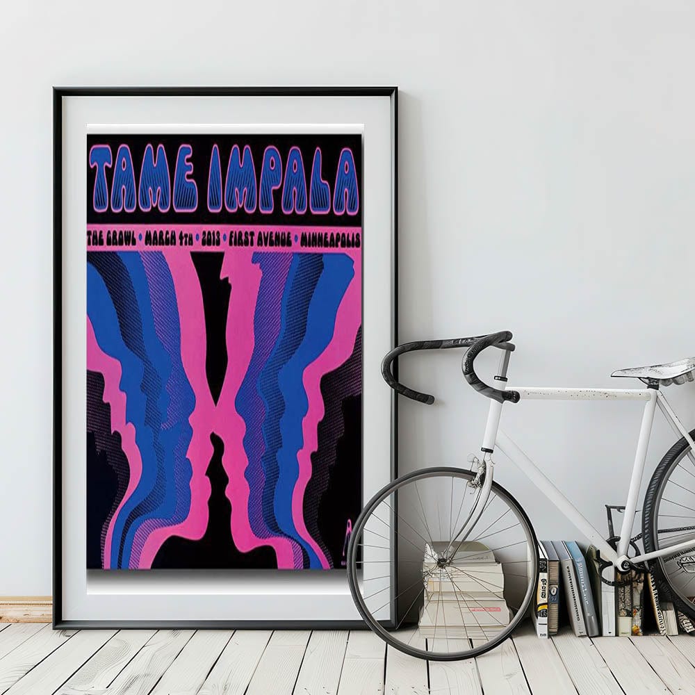Immerse yourself in the vibrant world of Tame Impala with this psychedelic concert poster from their 2013 show at First Avenue in Minneapolis. The striking design, featuring vibrant pinks, blues, and black, highlights the band’s signature trippy aesthetic with overlapping faces that give the poster an abstract and dynamic feel. This vintage print is a must-have for fans of Tame Impala and lovers of bold, psychedelic art. Add a touch of modern retro style to any space with this iconic piece of concert memorabilia.