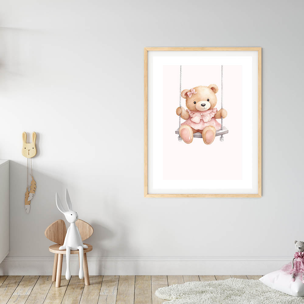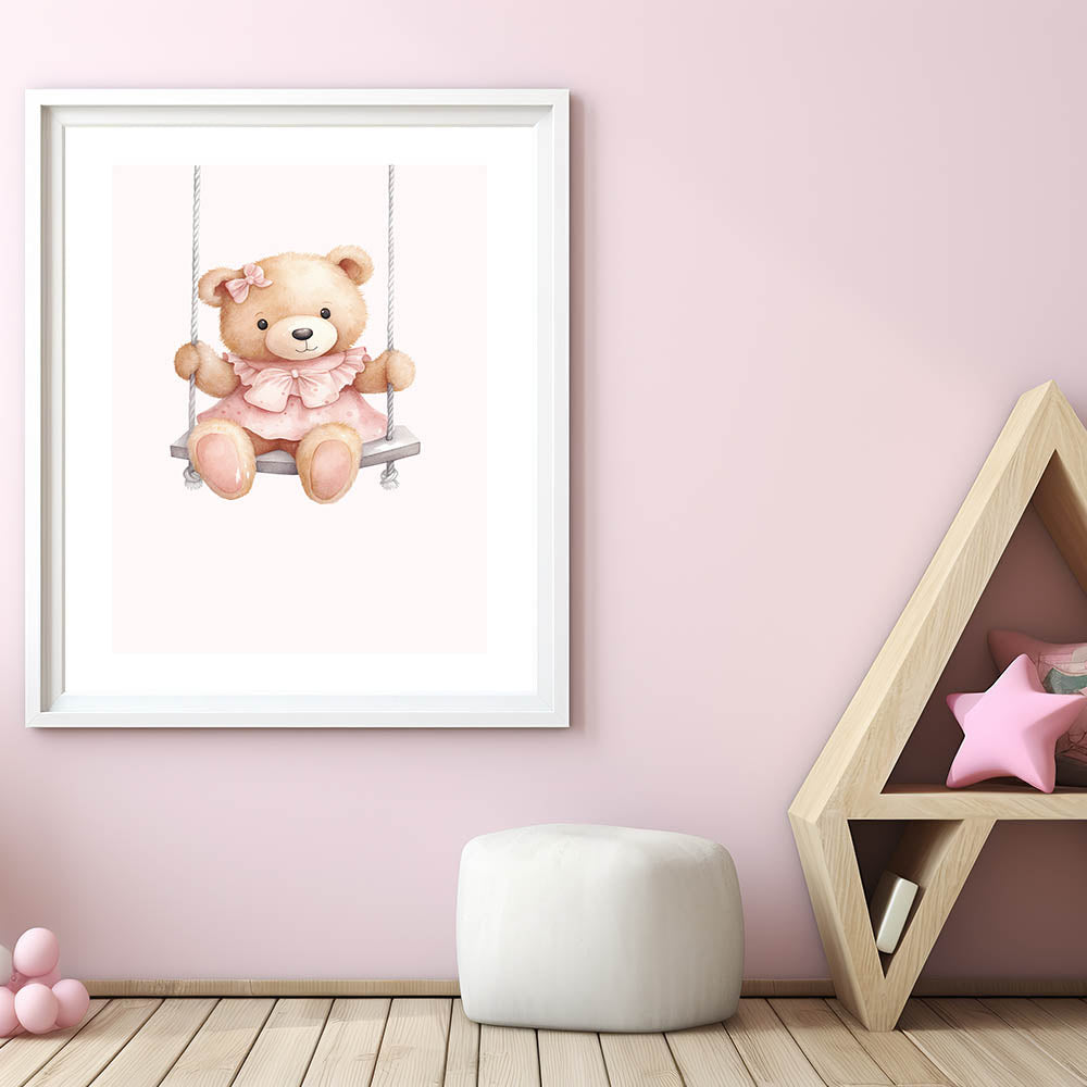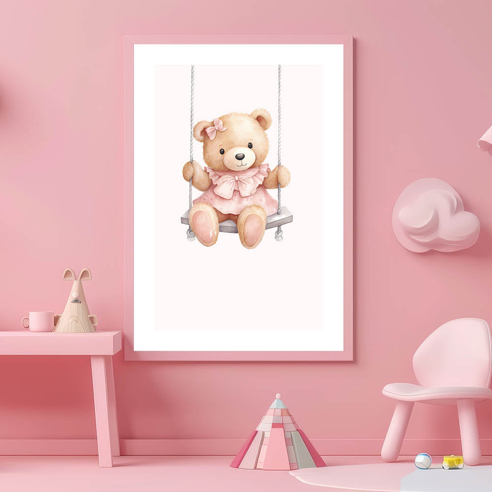 Bring a sense of playfulness and charm to your child’s space with this Teddy Bear on Swing Print. Featuring an adorable teddy bear in a pink dress sitting on a swing, this heartwarming artwork is the perfect way to add warmth and joy to nurseries, playrooms, and girls' bedrooms.