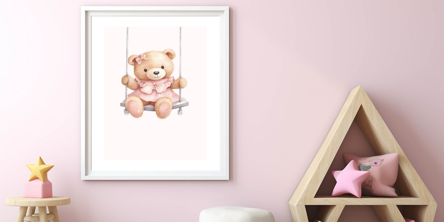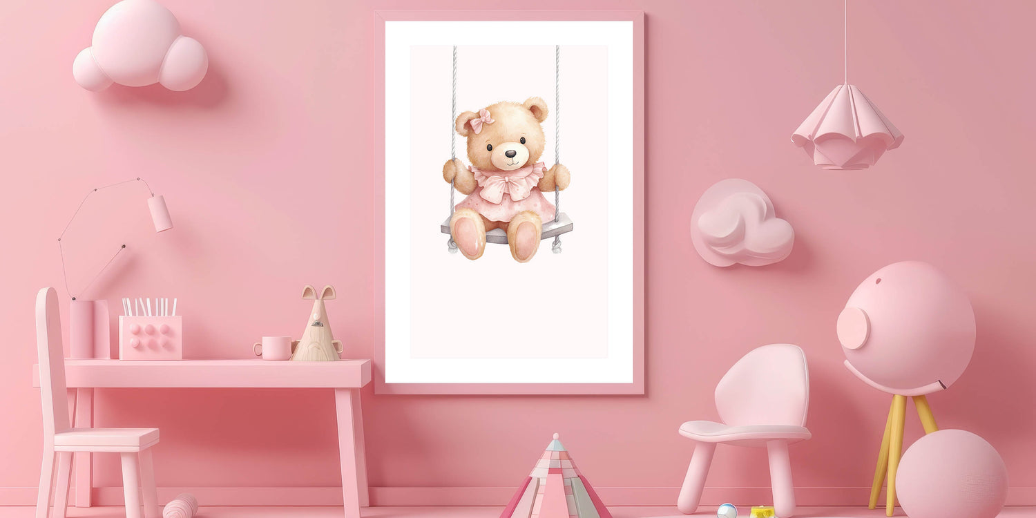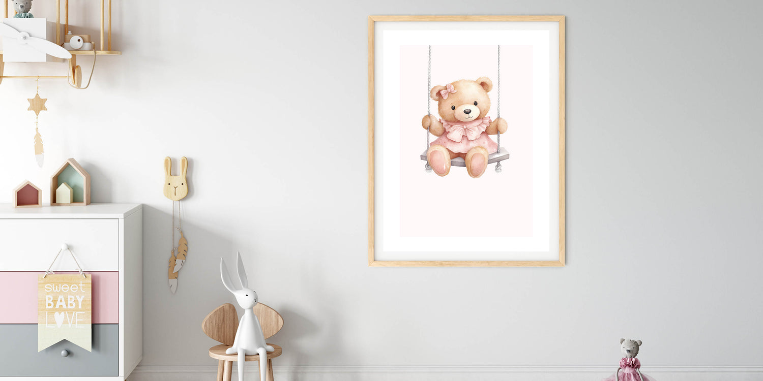 Bring a sense of playfulness and charm to your child’s space with this Teddy Bear on Swing Print. Featuring an adorable teddy bear in a pink dress sitting on a swing, this heartwarming artwork is the perfect way to add warmth and joy to nurseries, playrooms, and girls' bedrooms.