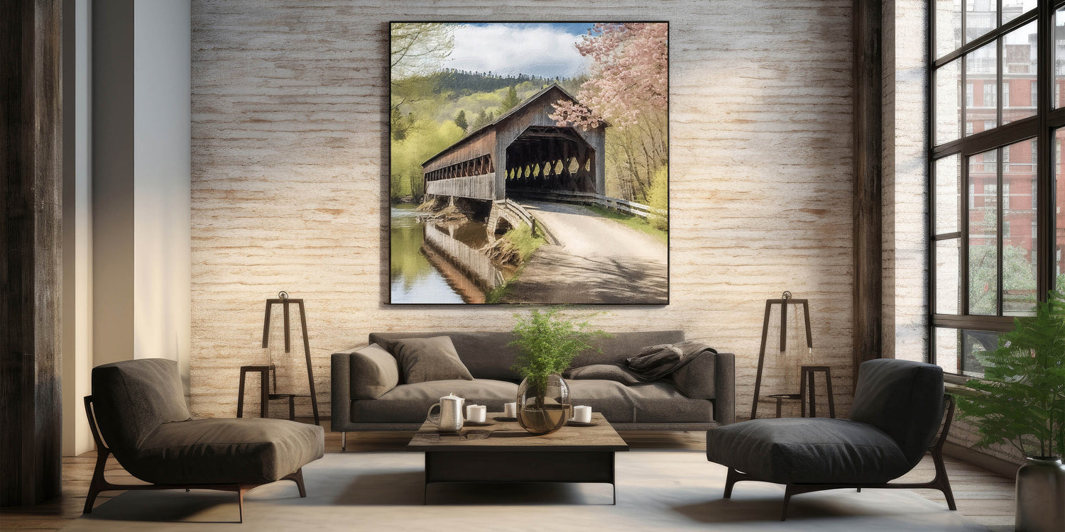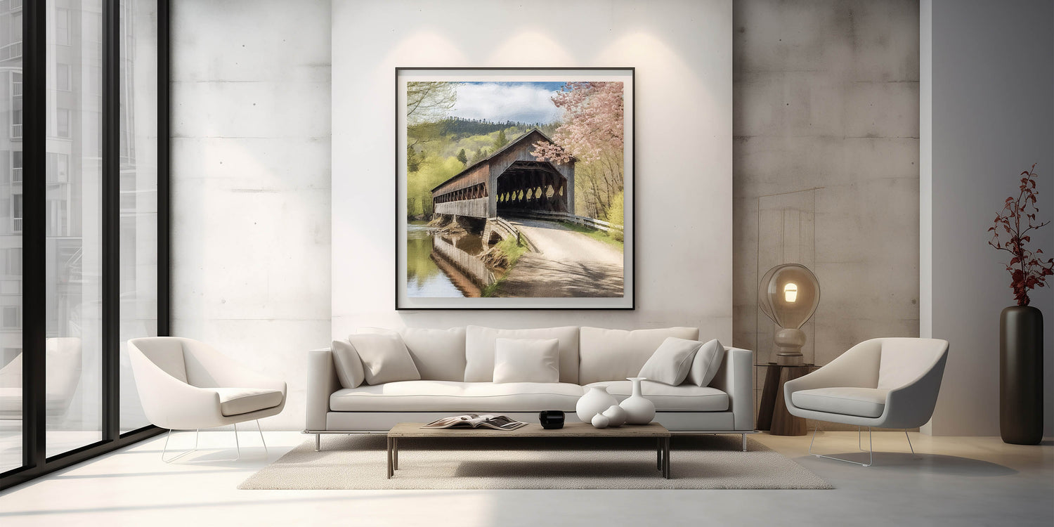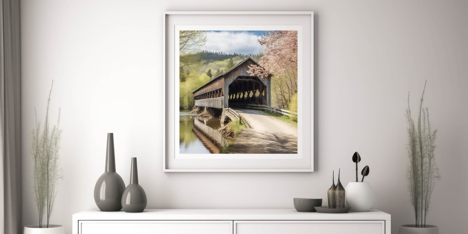 This Rustic River View Art is ideal for those who appreciate Landscape Bridge Art and Historic Covered Bridges. Let the peaceful scene of this timeless bridge and river landscape bring a calming, nostalgic atmosphere to your space, adding a touch of nature’s elegance to your home.