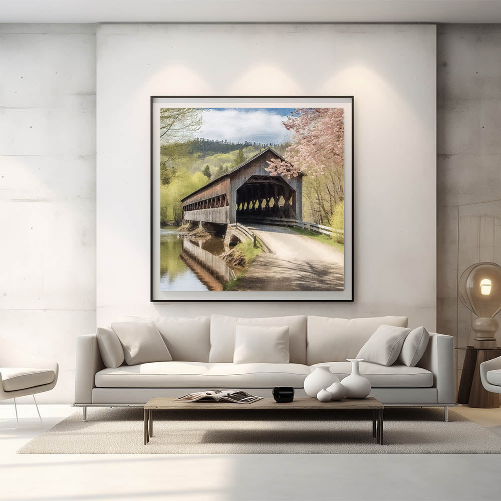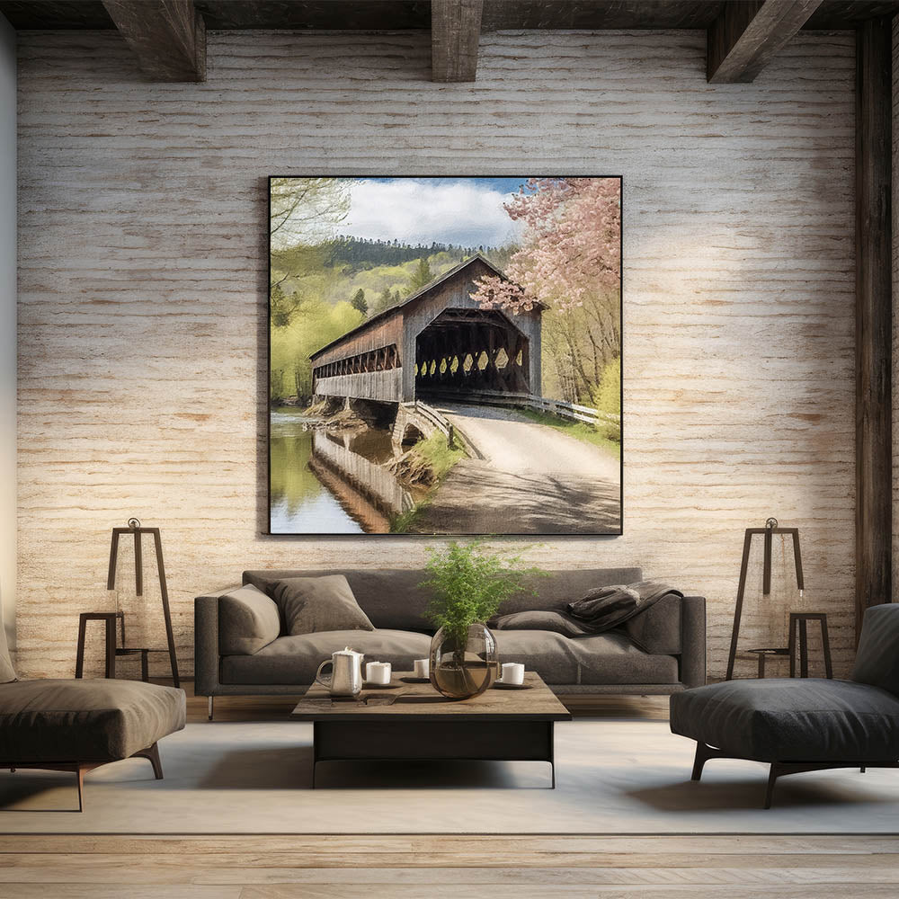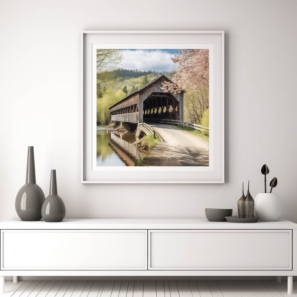 Immerse yourself in the scenic beauty of a rustic landscape with this Timeless Bridge Landscape Art, featuring a classic covered bridge over a gently flowing river. Set against a backdrop of lush hills and blossoming spring trees, this artwork captures the charm and tranquility of countryside views, perfect for enhancing any room’s decor.