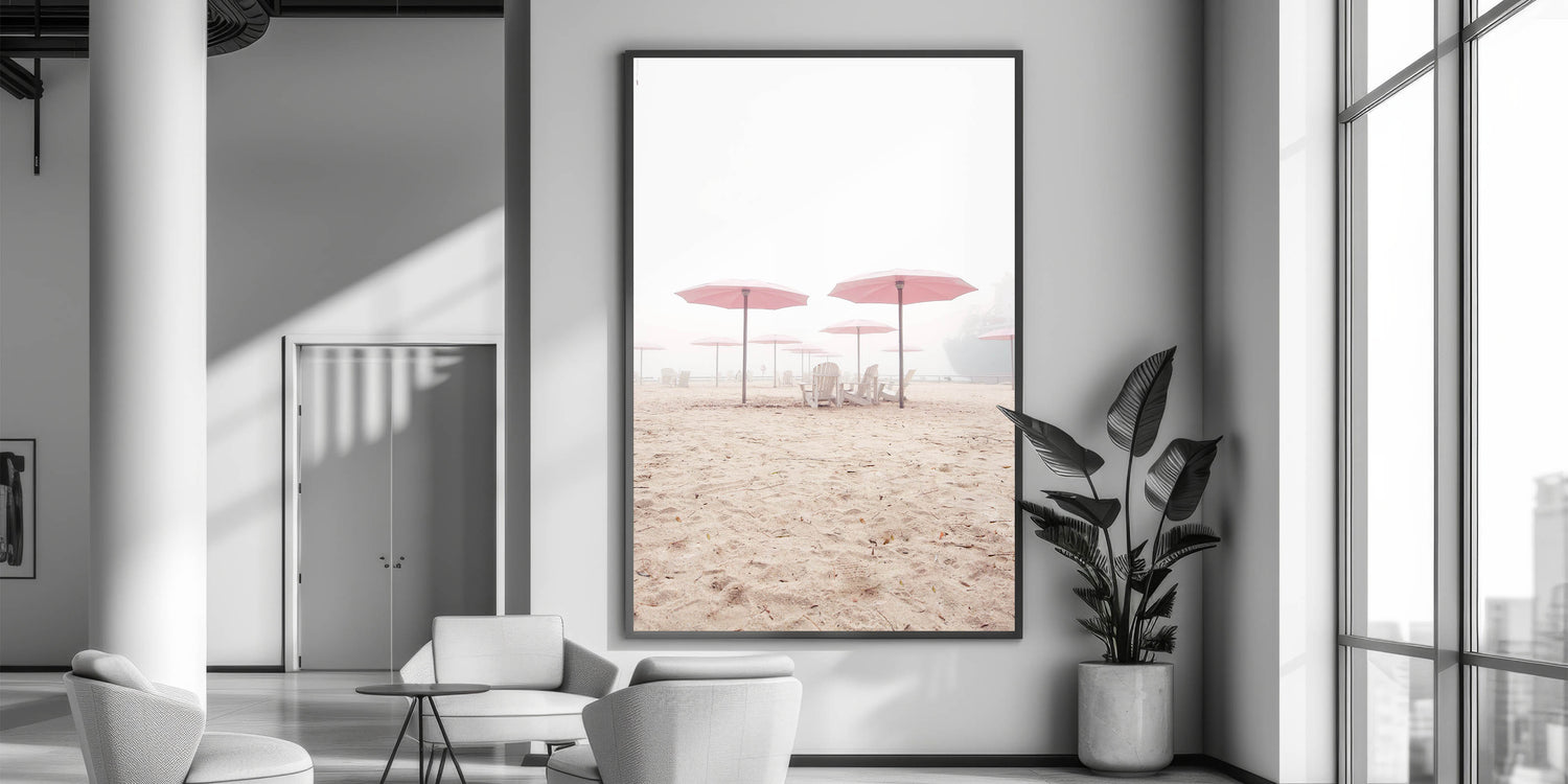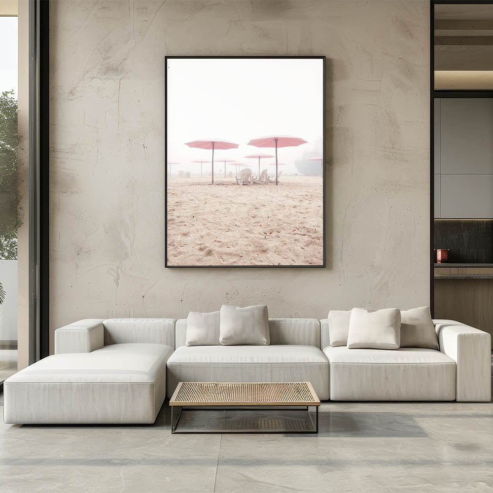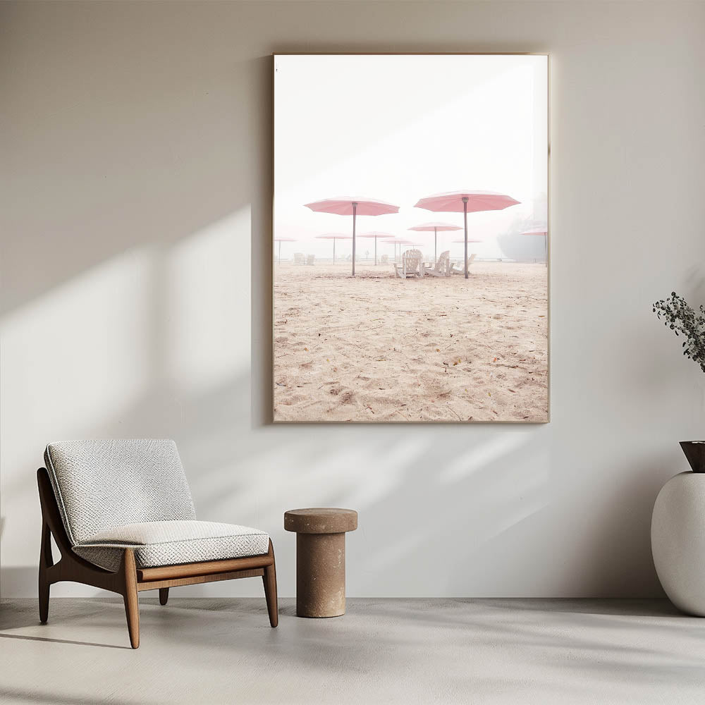 Embrace the peaceful elegance of summer wall art with this stunning print featuring a quiet beach adorned with soft pink umbrellas and sandy shores. The misty ambiance adds a dreamy, coastal vibe, making this summer canvas art a perfect addition to modern interiors, beach homes, or relaxing retreat spaces. Whether you seek beach wall art to create a soothing atmosphere or an aesthetic statement piece, this artwork captures the essence of summer wall décor effortlessly.