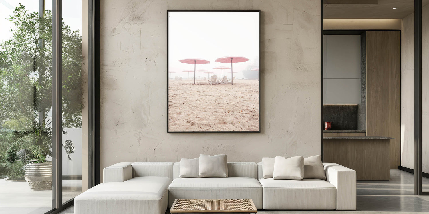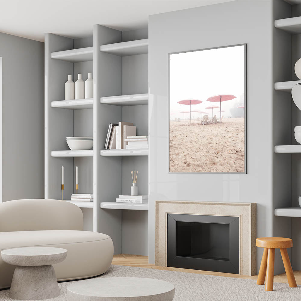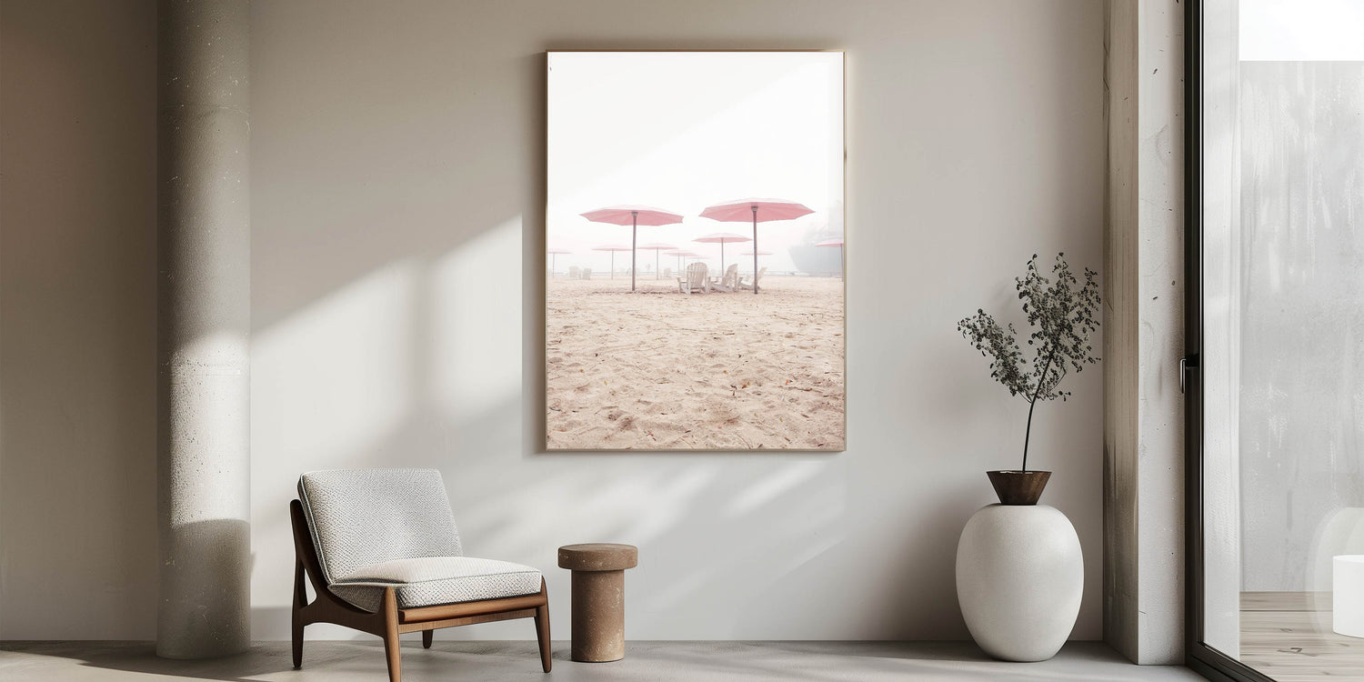 Embrace the peaceful elegance of summer wall art with this stunning print featuring a quiet beach adorned with soft pink umbrellas and sandy shores. The misty ambiance adds a dreamy, coastal vibe, making this summer canvas art a perfect addition to modern interiors, beach homes, or relaxing retreat spaces. Whether you seek beach wall art to create a soothing atmosphere or an aesthetic statement piece, this artwork captures the essence of summer wall décor effortlessly.