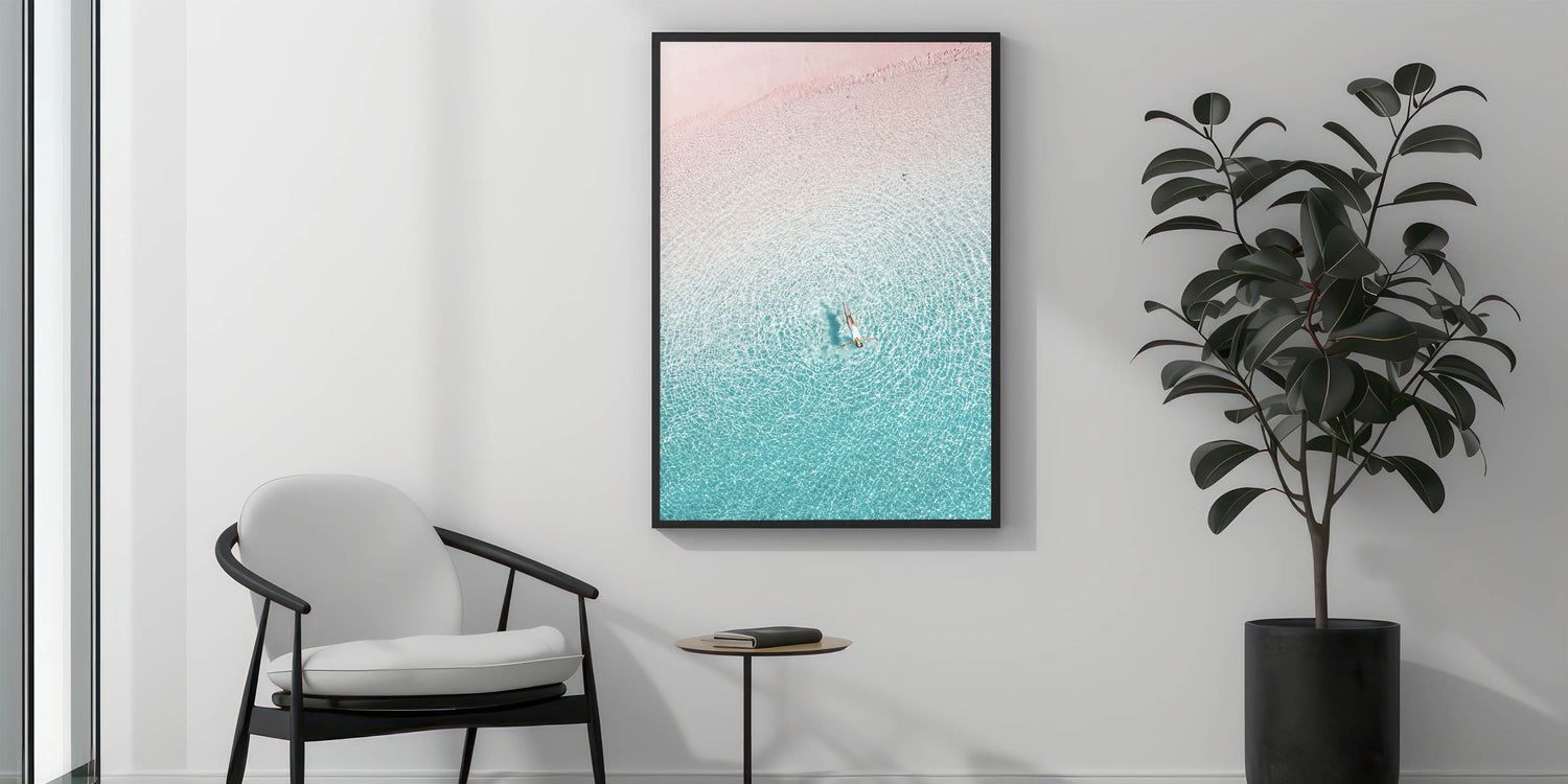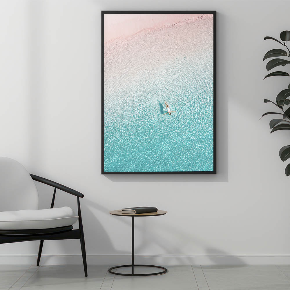 Immerse yourself in the serenity of summer with this Relaxing Summer Pool Water Canvas Print. Featuring crystal-clear turquoise waters and soft pink sands, this artwork captures the essence of calm, tropical relaxation. A figure floating peacefully in the shimmering water adds to the tranquil, vacation-inspired charm of this print.