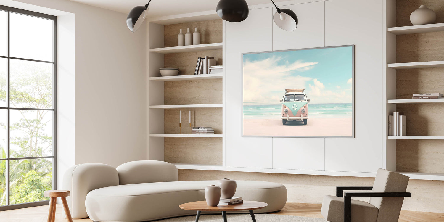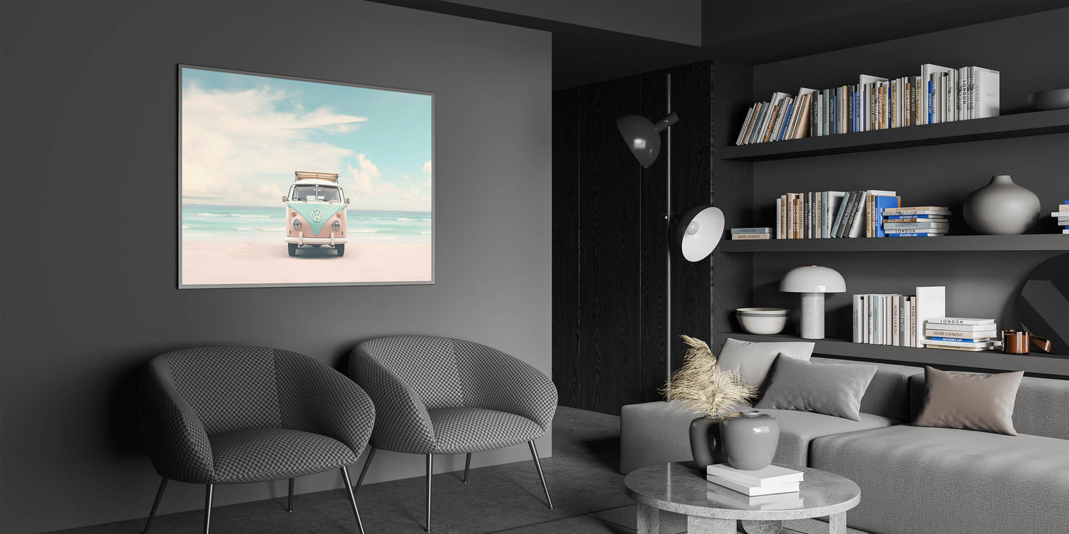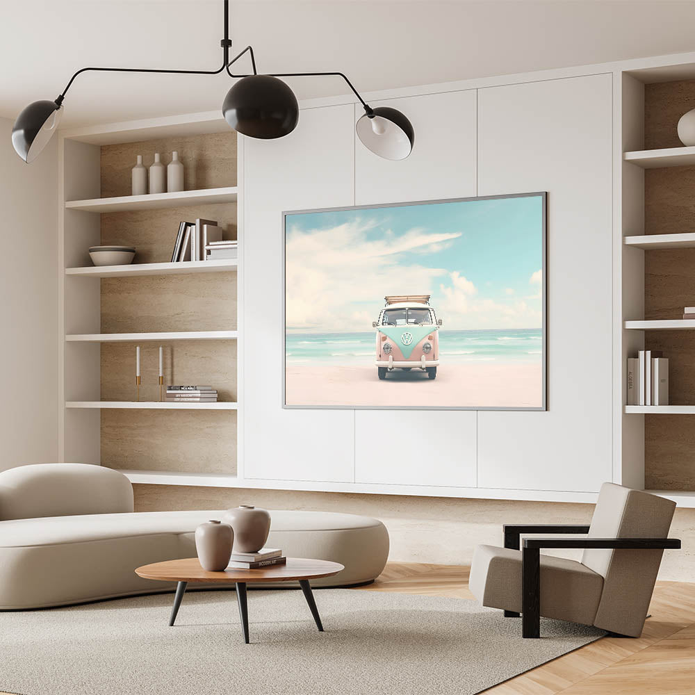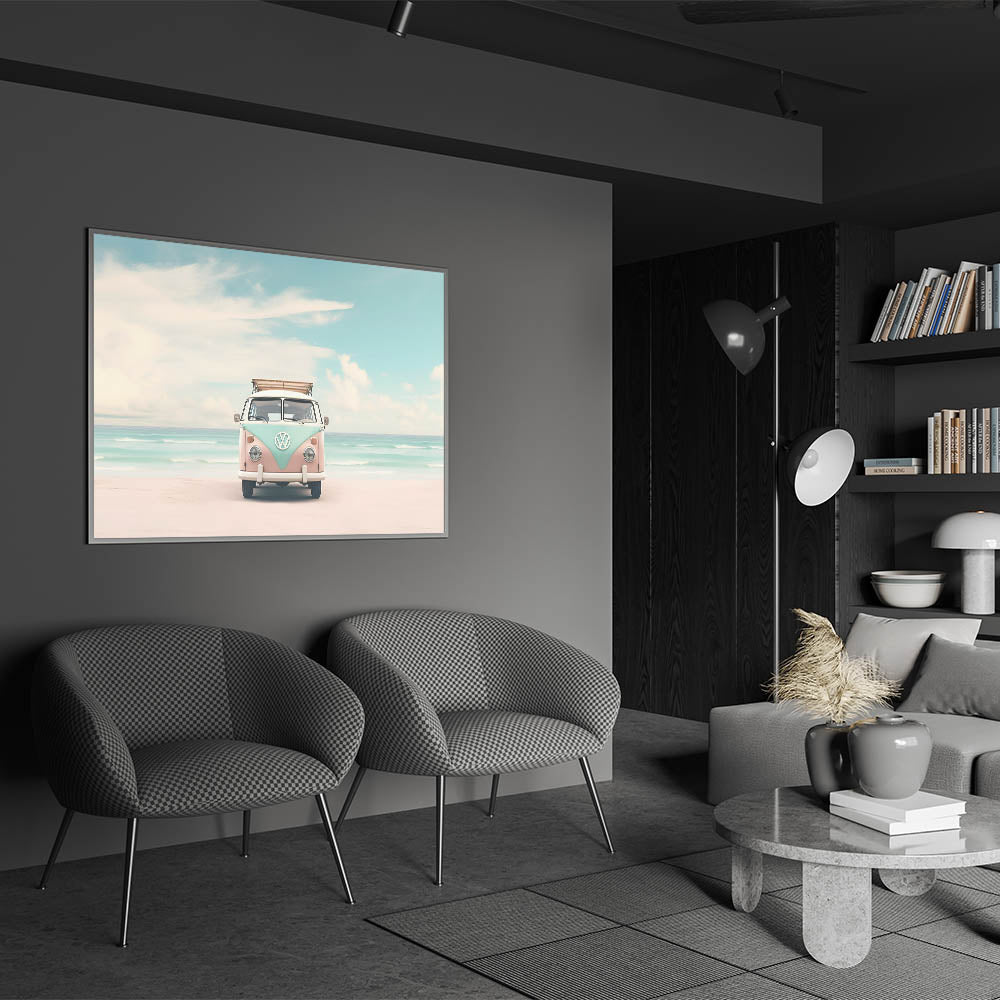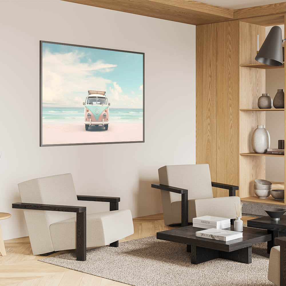 This artwork is perfect for transforming your walls into a peaceful tropical paradise, where summer never ends. The retro van and tranquil beach setting bring warmth, fun, and relaxation into any room, making it ideal for relaxing summer landscapes or modern interiors.