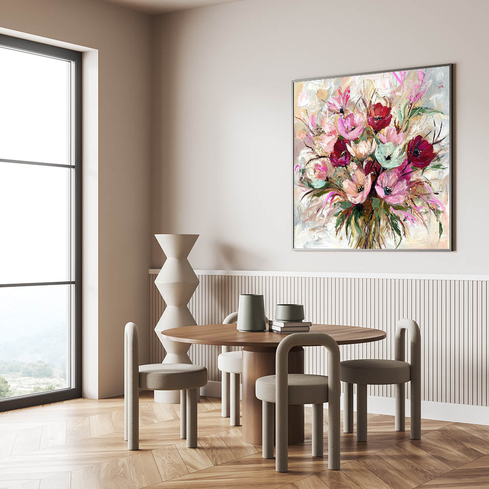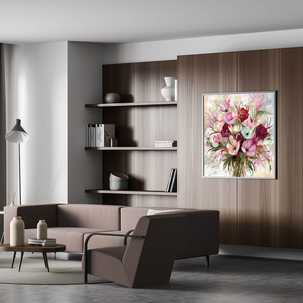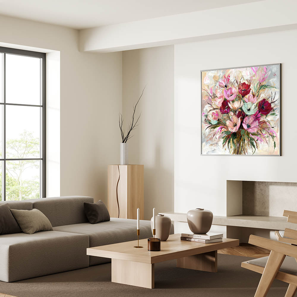 Add a burst of color and elegance to your home with this living room wall art, featuring a stunning floral bouquet in rich pink, red, and beige hues. The expressive brushstrokes and artistic details create a lively, sophisticated aesthetic, making this modern wall art a captivating centerpiece for your decor.
