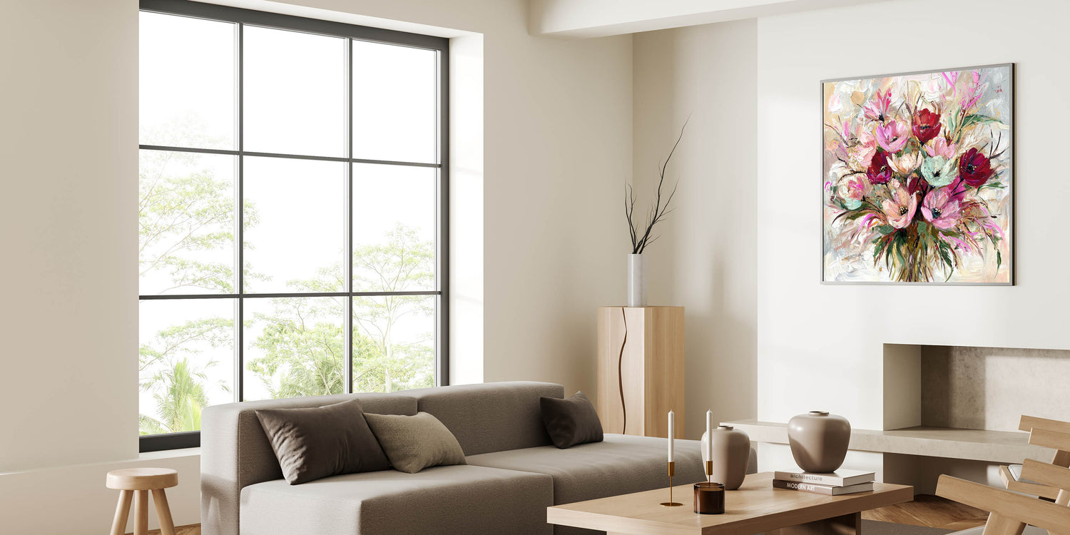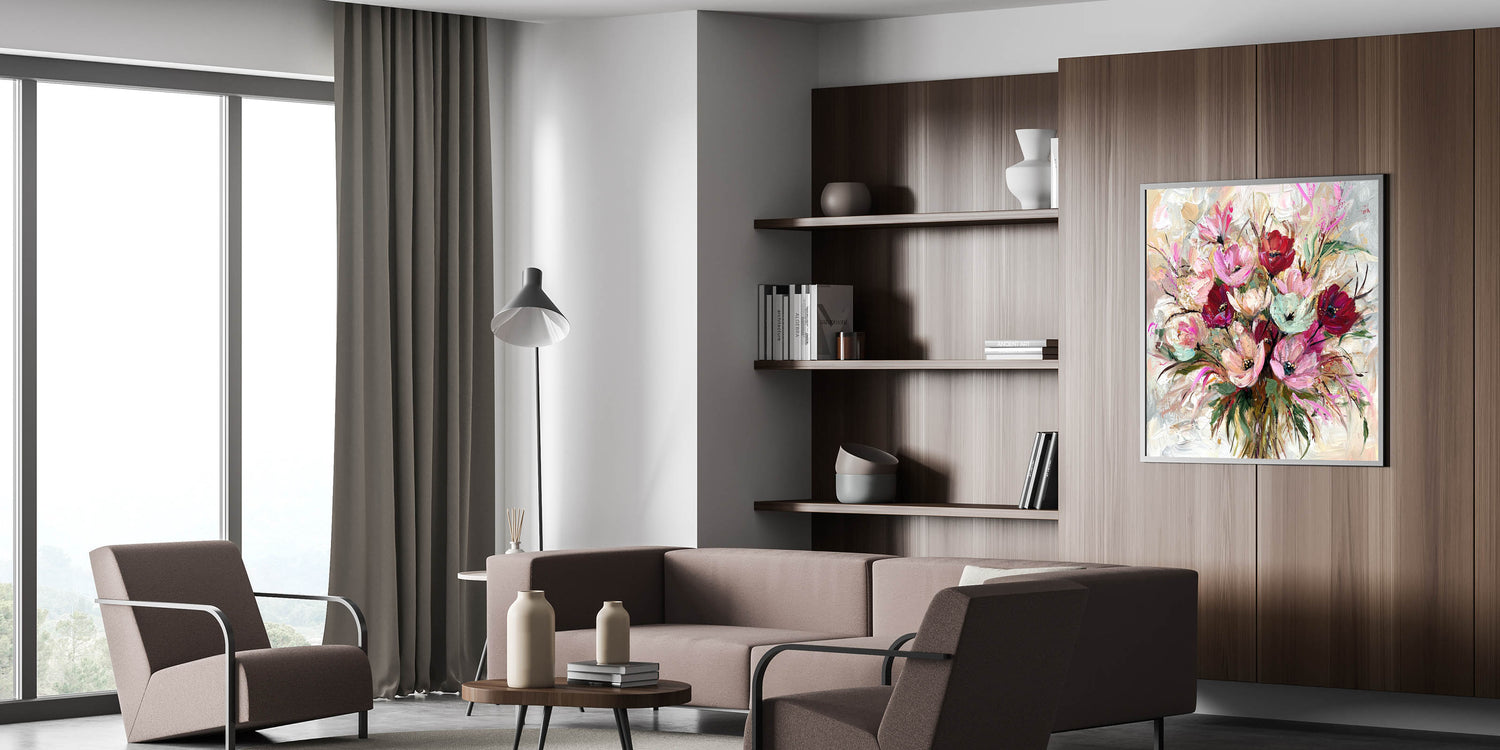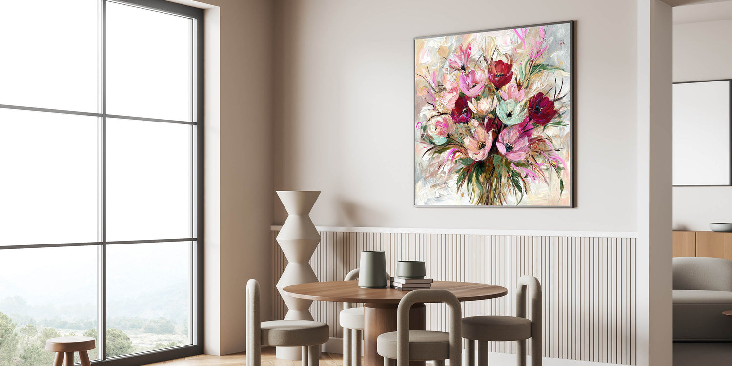 Add a burst of color and elegance to your home with this living room wall art, featuring a stunning floral bouquet in rich pink, red, and beige hues. The expressive brushstrokes and artistic details create a lively, sophisticated aesthetic, making this modern wall art a captivating centerpiece for your decor.