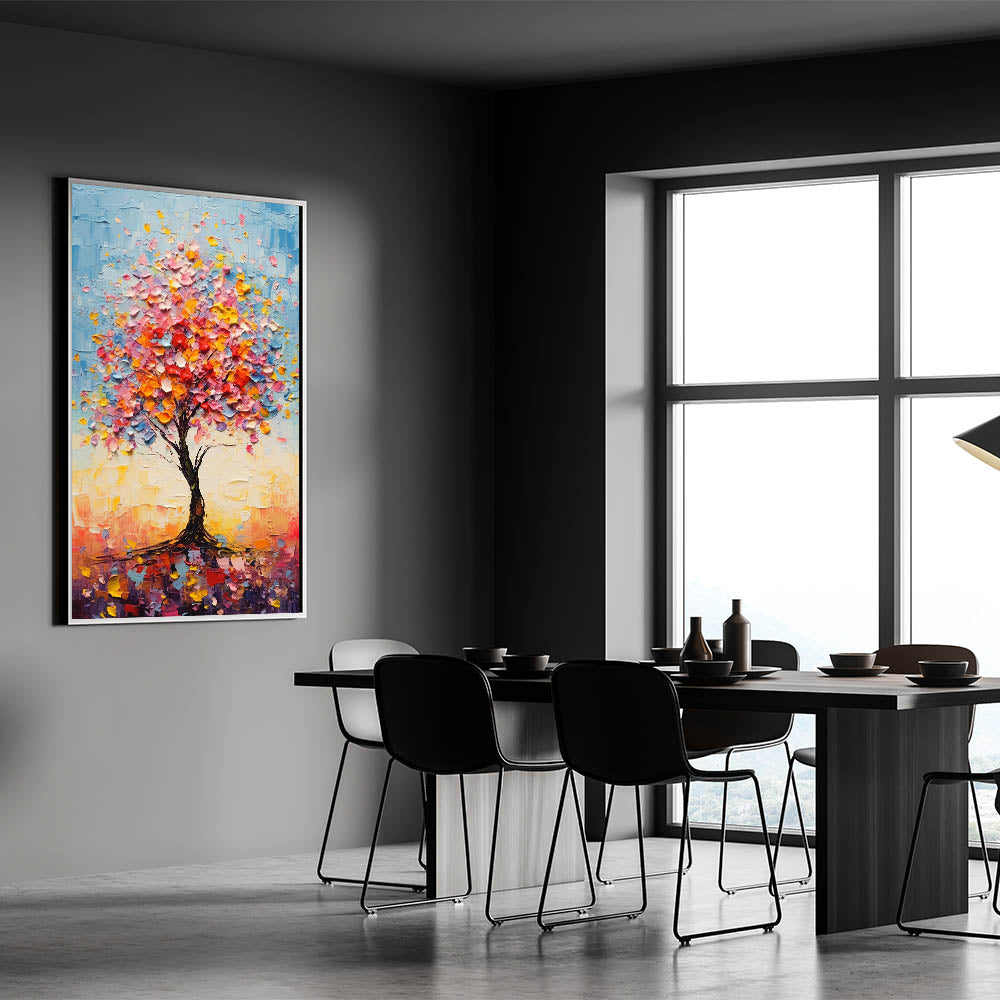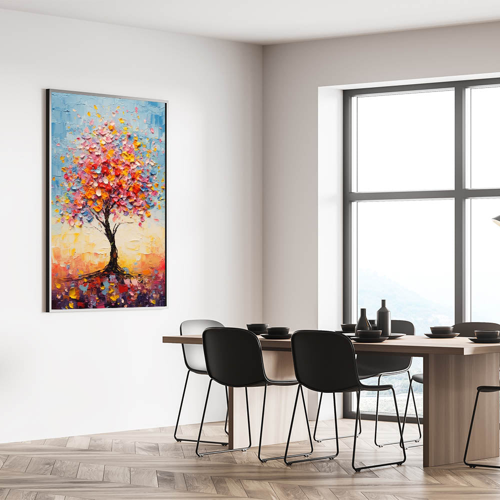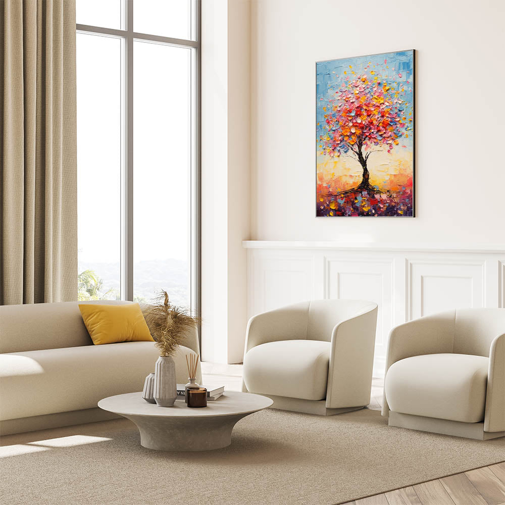 Enhance your home with this captivating Glam Wall Art, featuring a vibrant tree bursting with bold, colorful blooms. The artwork's intricate texture and rich palette create a stunning focal point, blending shades of red, orange, pink, and blue for a breathtaking visual experience. Perfect for modern glam interiors, this luxurious piece adds a touch of nature-inspired elegance to any space, whether it's your living room, bedroom, or office.