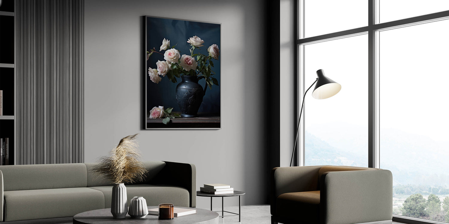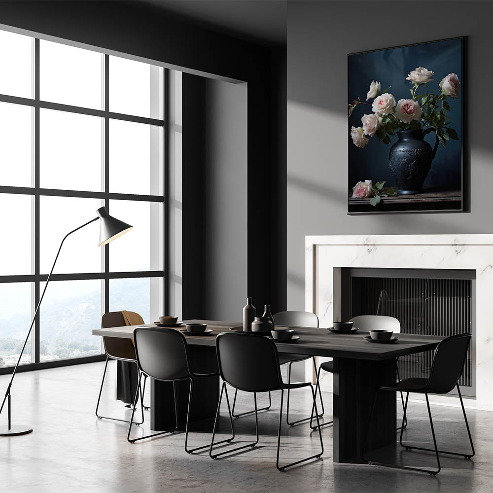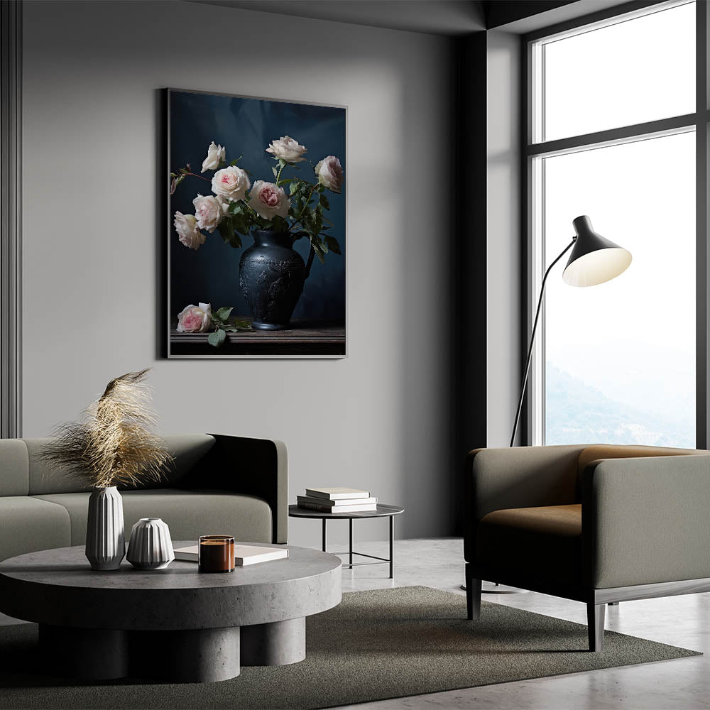 Add a touch of classic elegance to your décor with this vintage botanical art print, showcasing delicate pink roses arranged in a beautifully detailed black vase. The deep, moody backdrop allows the soft, pastel roses to truly shine, creating a sophisticated and timeless atmosphere perfect for any room.