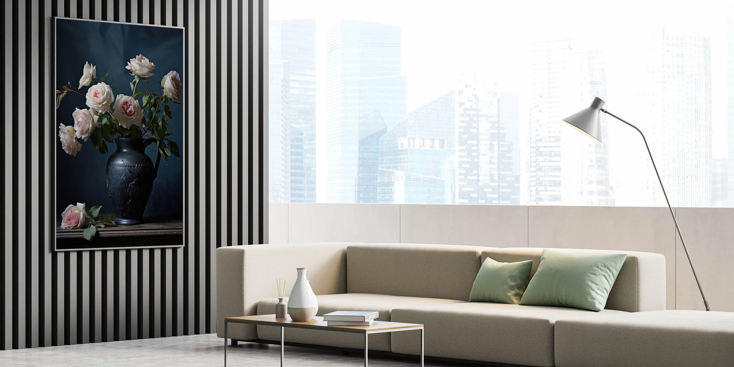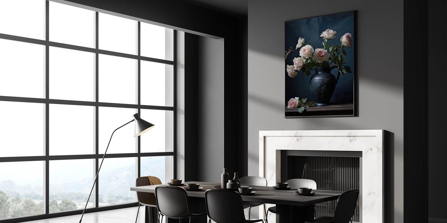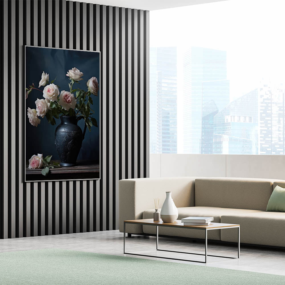 Add a touch of classic elegance to your décor with this vintage botanical art print, showcasing delicate pink roses arranged in a beautifully detailed black vase. The deep, moody backdrop allows the soft, pastel roses to truly shine, creating a sophisticated and timeless atmosphere perfect for any room.