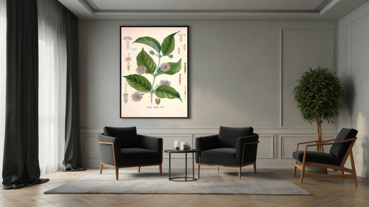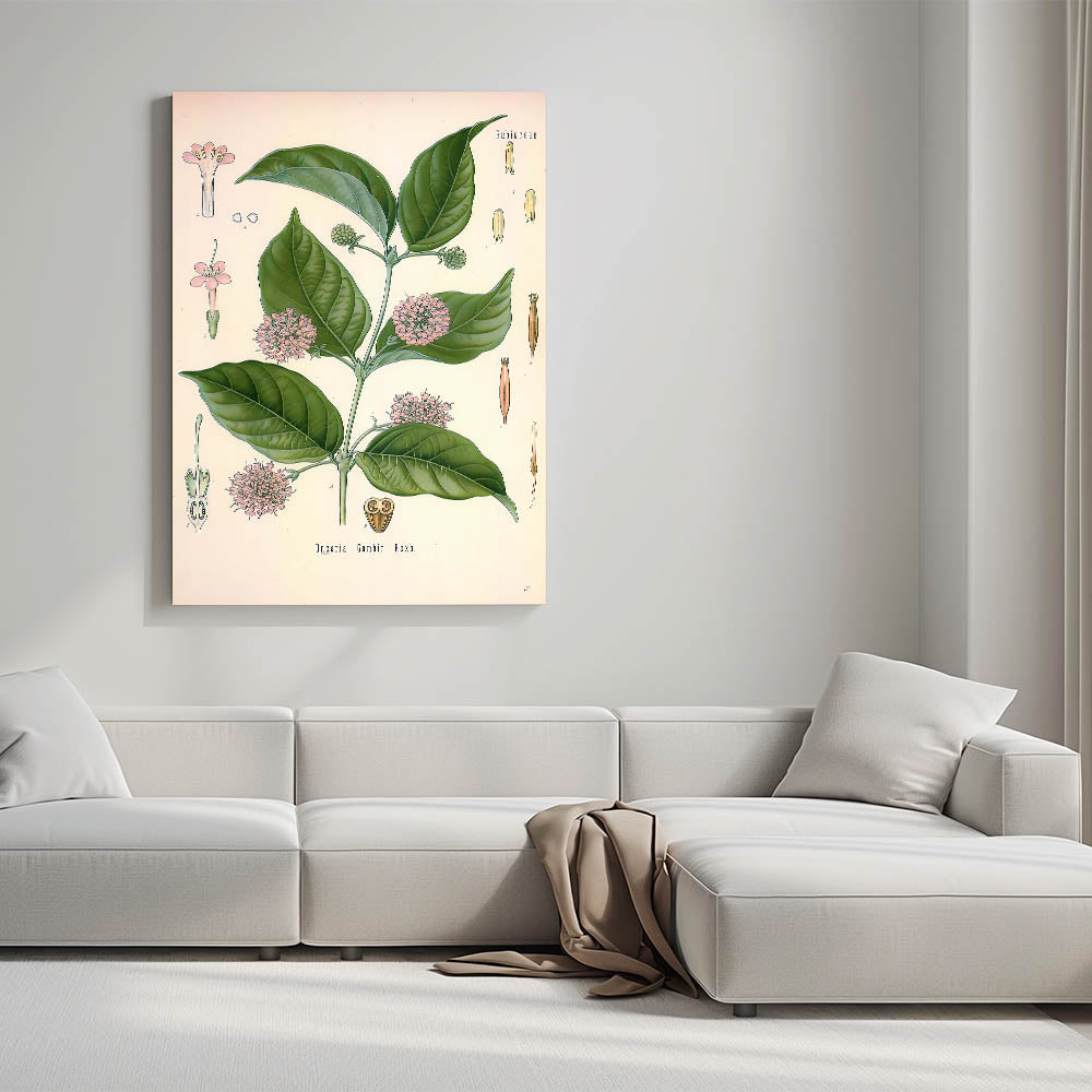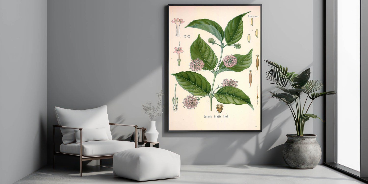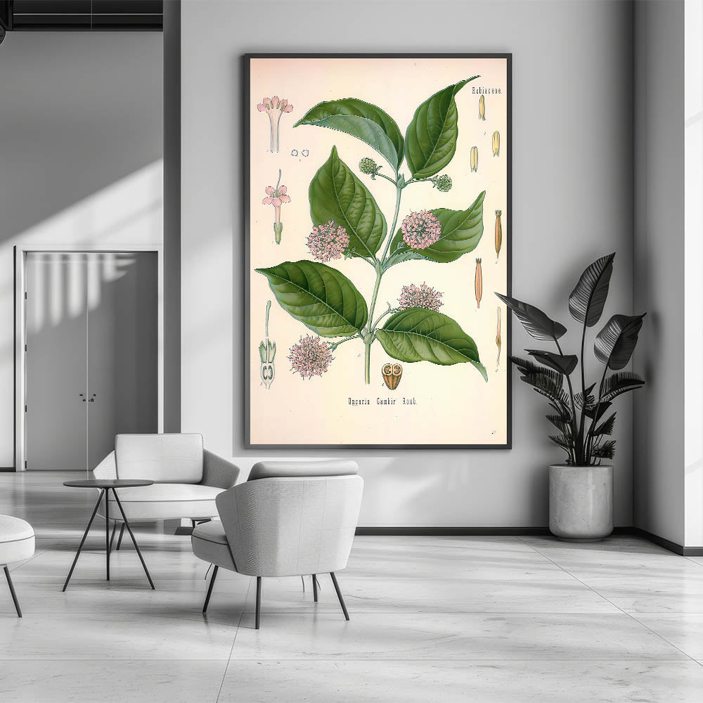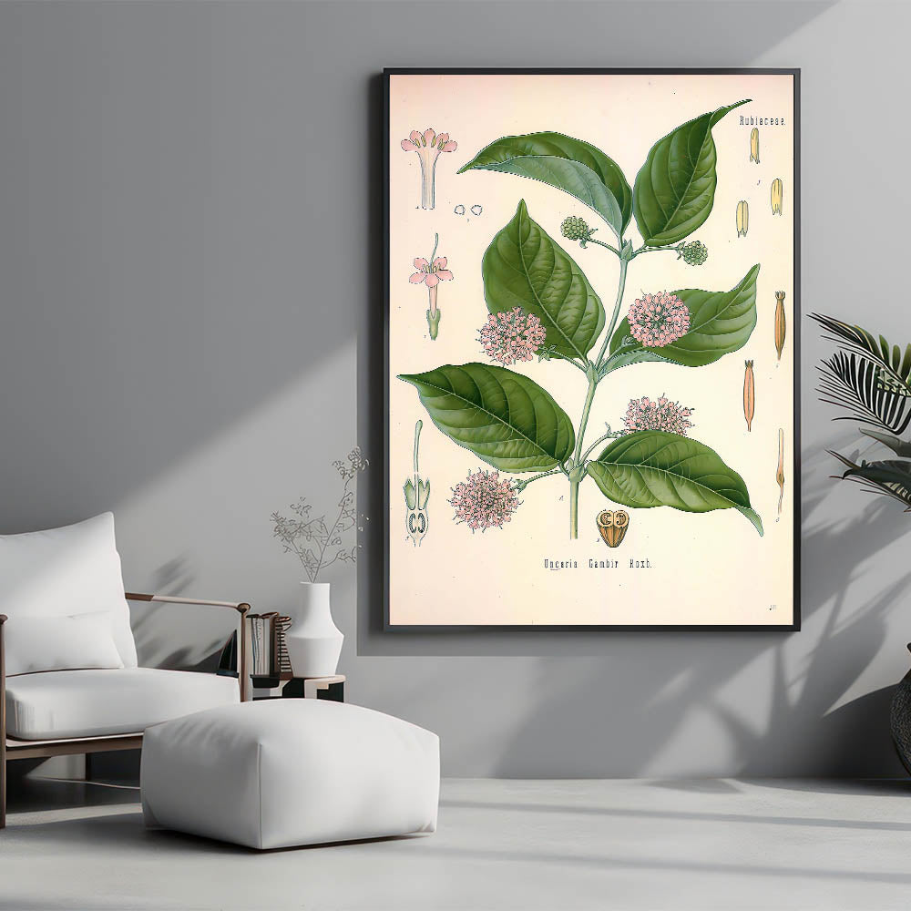 Add a delicate touch of nature with this vintage botanical art print featuring Uncaria gambir (Gambir). This stunning illustration captures the plant's vibrant green leaves and unique pinkish floral clusters, making it a perfect piece for nature-inspired decor. The fine details and vintage style bring a sense of calm and beauty to any space.