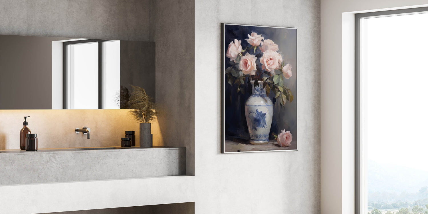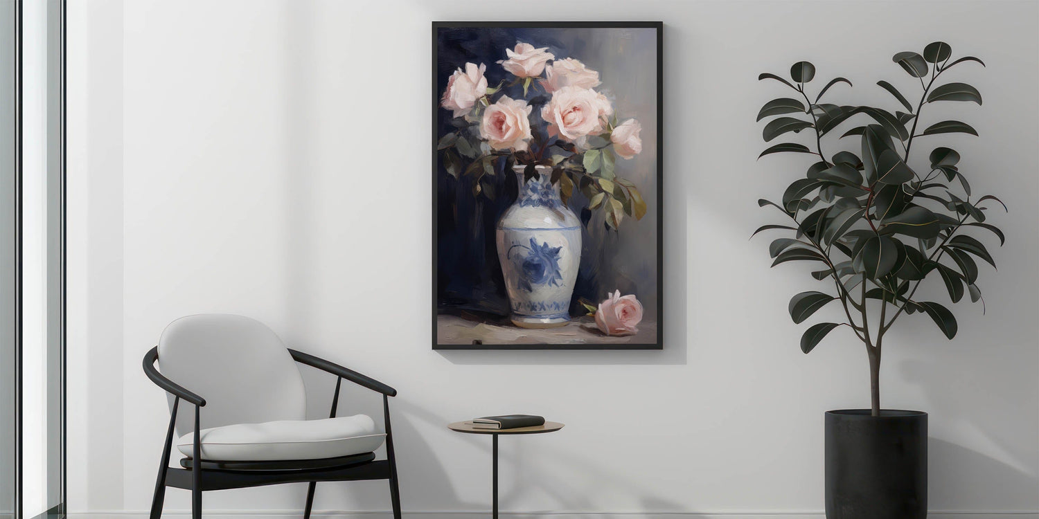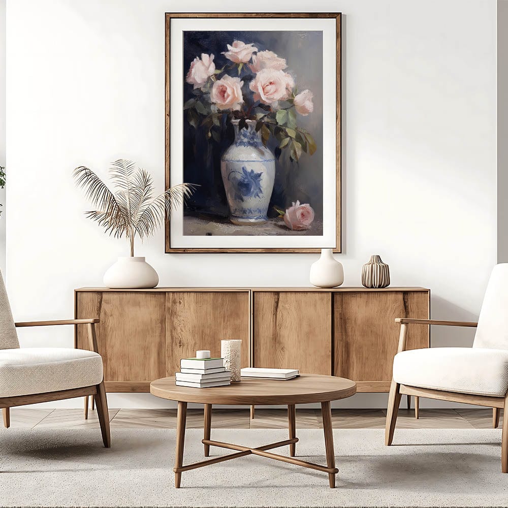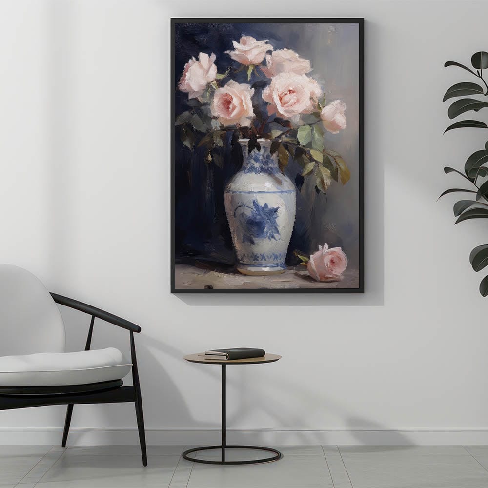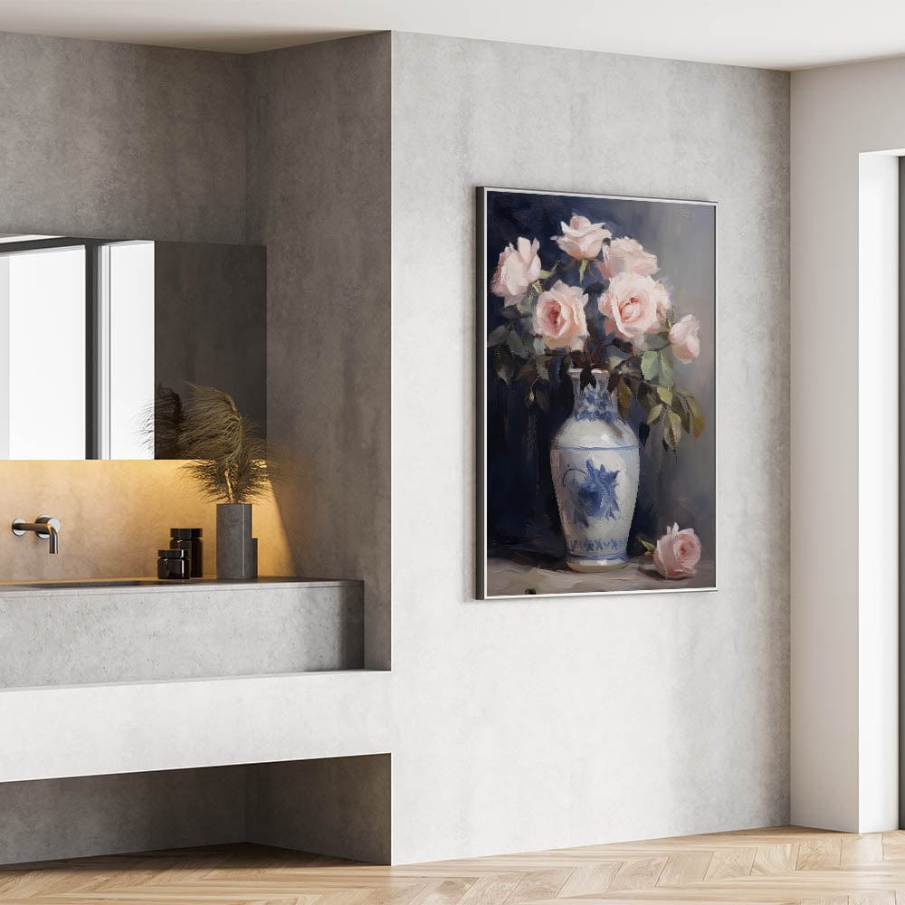 This vintage botanical art print beautifully captures the delicate elegance of soft pink roses arranged in a classic blue vase. The soft, impressionistic brushstrokes bring the scene to life, evoking a sense of timeless beauty and charm. The combination of the muted background and the vibrant pink roses creates a serene yet inviting atmosphere, making this botanical wall decor perfect for adding a touch of romance and sophistication to any room. Whether you're a fan of vintage style decor or botanical illustration art, this piece will add an elegant touch to your space.