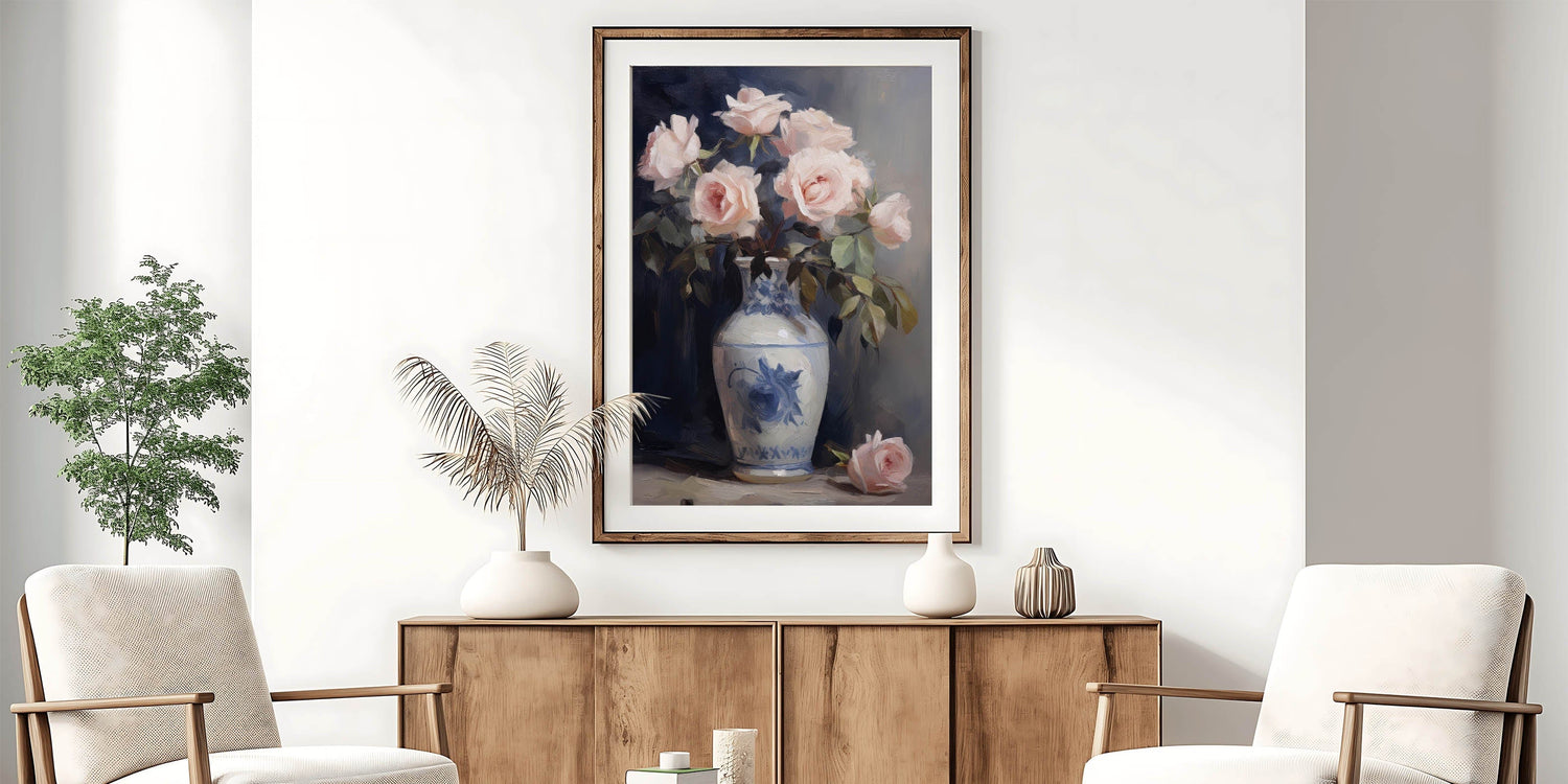 This captivating floral print adds a touch of elegance and romance to your home, making it a beautiful addition to any collection. Its calming colors and soft brushstrokes create a welcoming and refined atmosphere in any room.